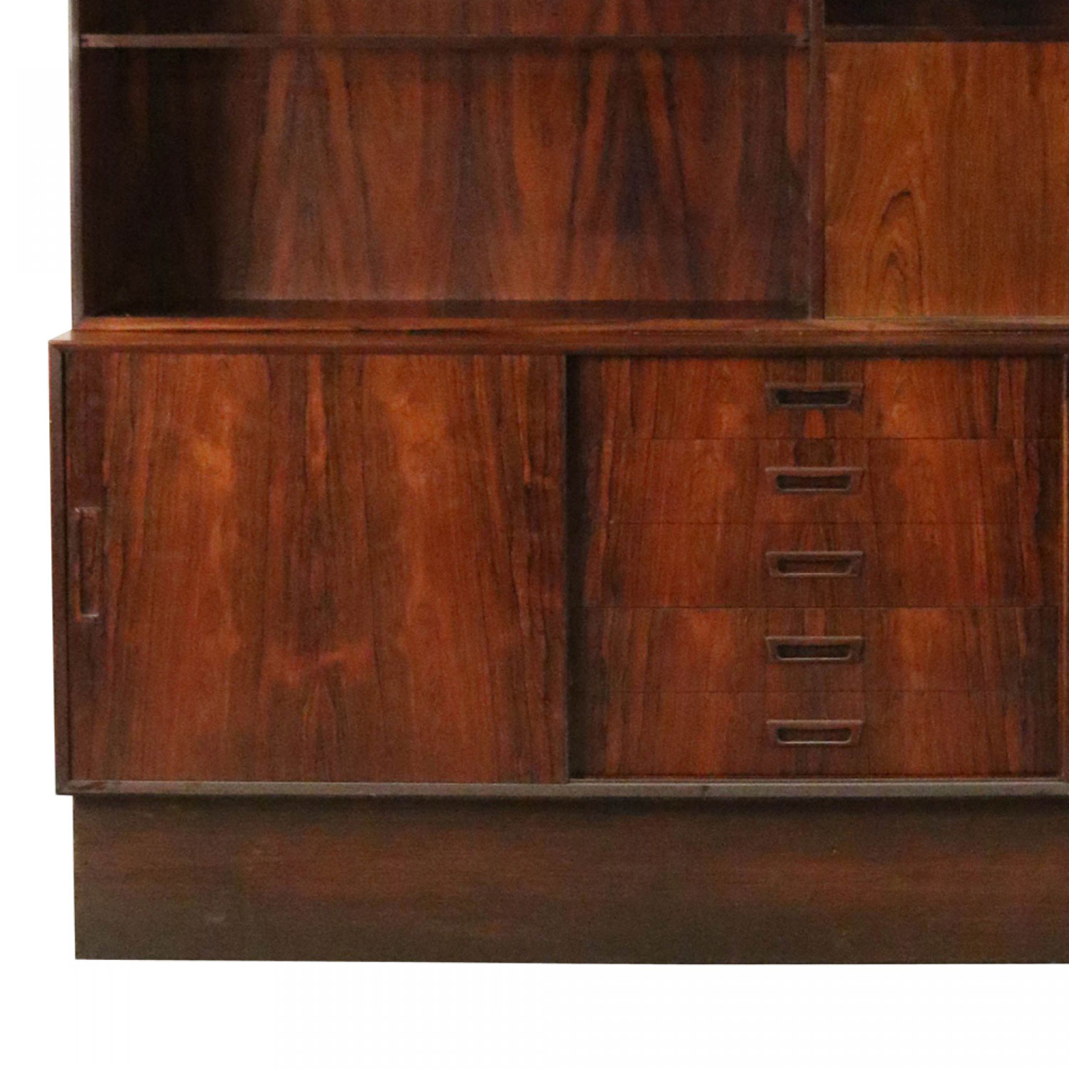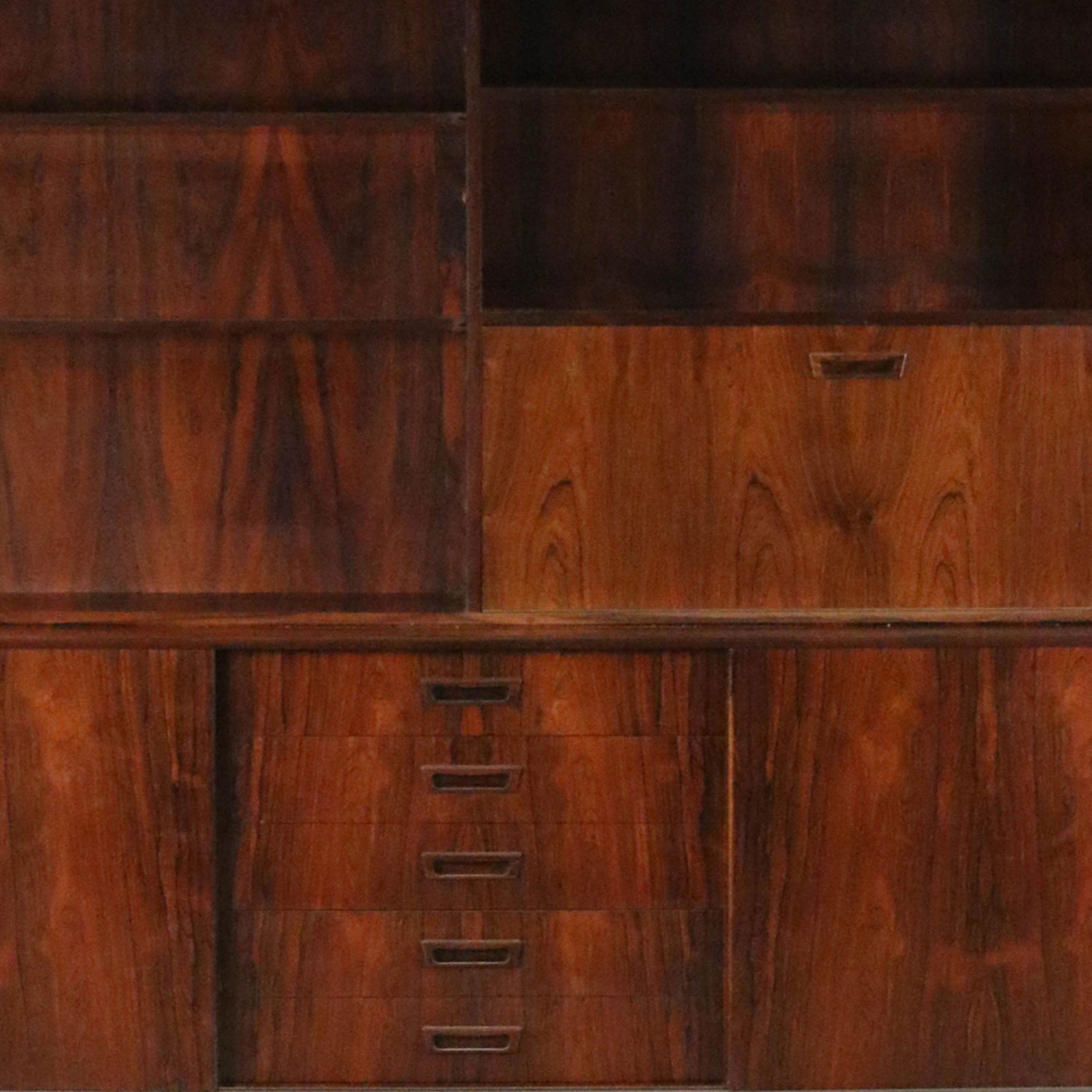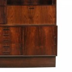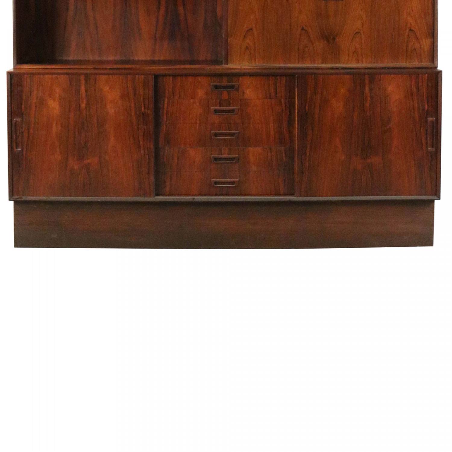 Contemporary Scandinavian two-piece walnut cabinet / sideboard with an open five shelf top with one hinged drawer and a two cabinets and a five drawer base.