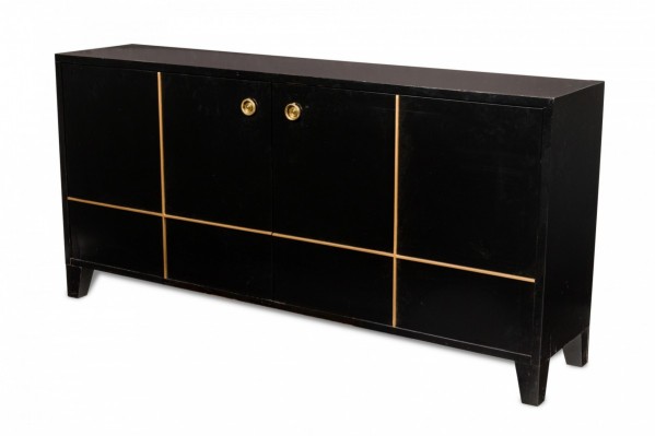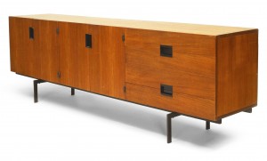 Style: Contemporary/Post-War Design Materials & Techniques: Walnut, wood Category: Cabinets & Case Goods, Dining Room Condition: Back panel is bowing out slightly.