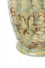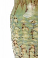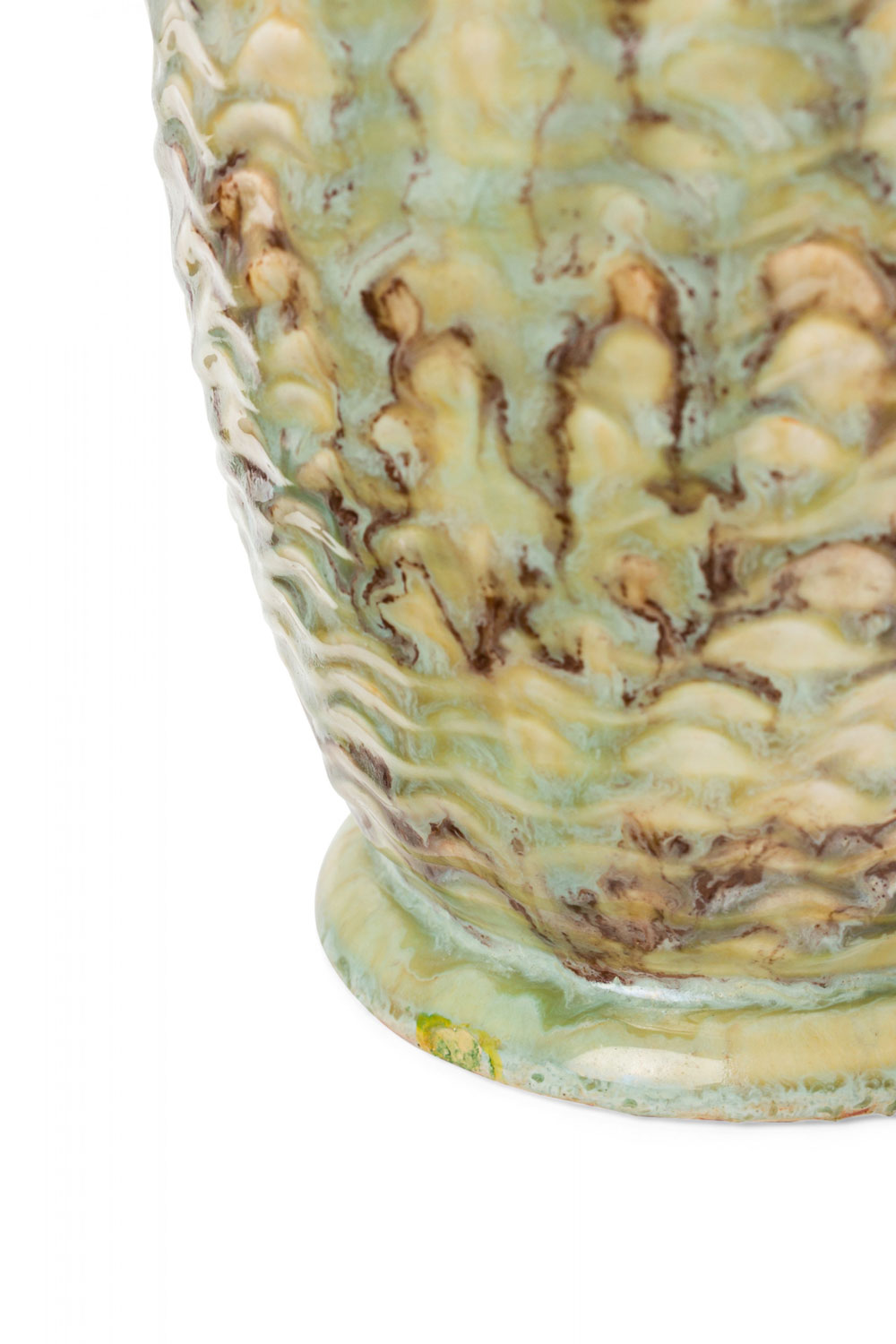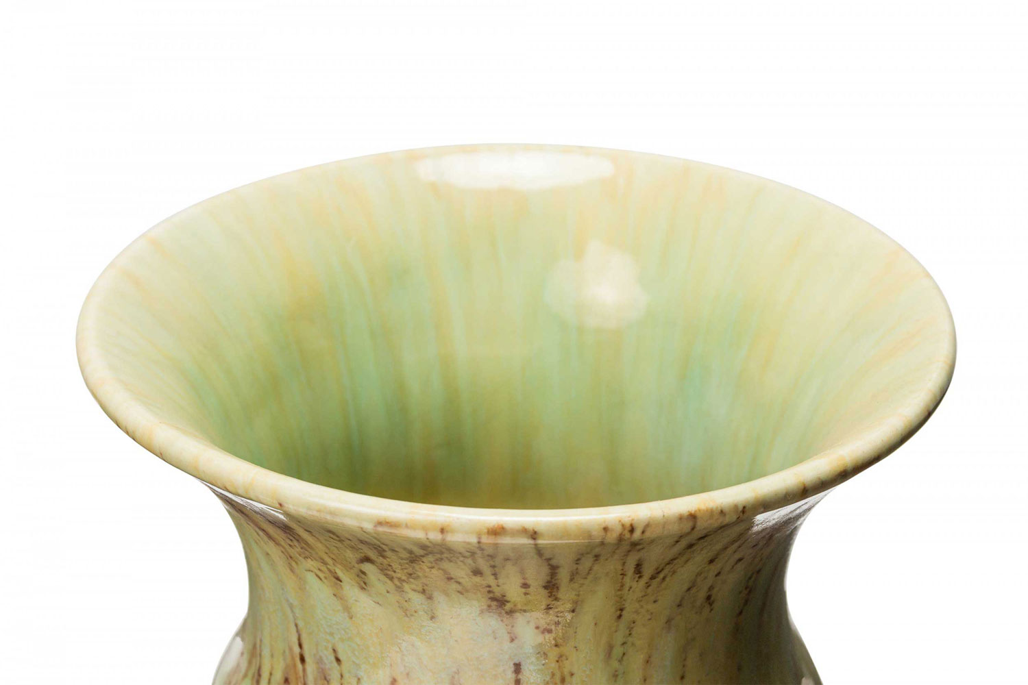 German Mid-Century urn-form ceramic vase with a flared mouth and a light green, yellow, and brown drip glaze. (mark on bottom, "R")