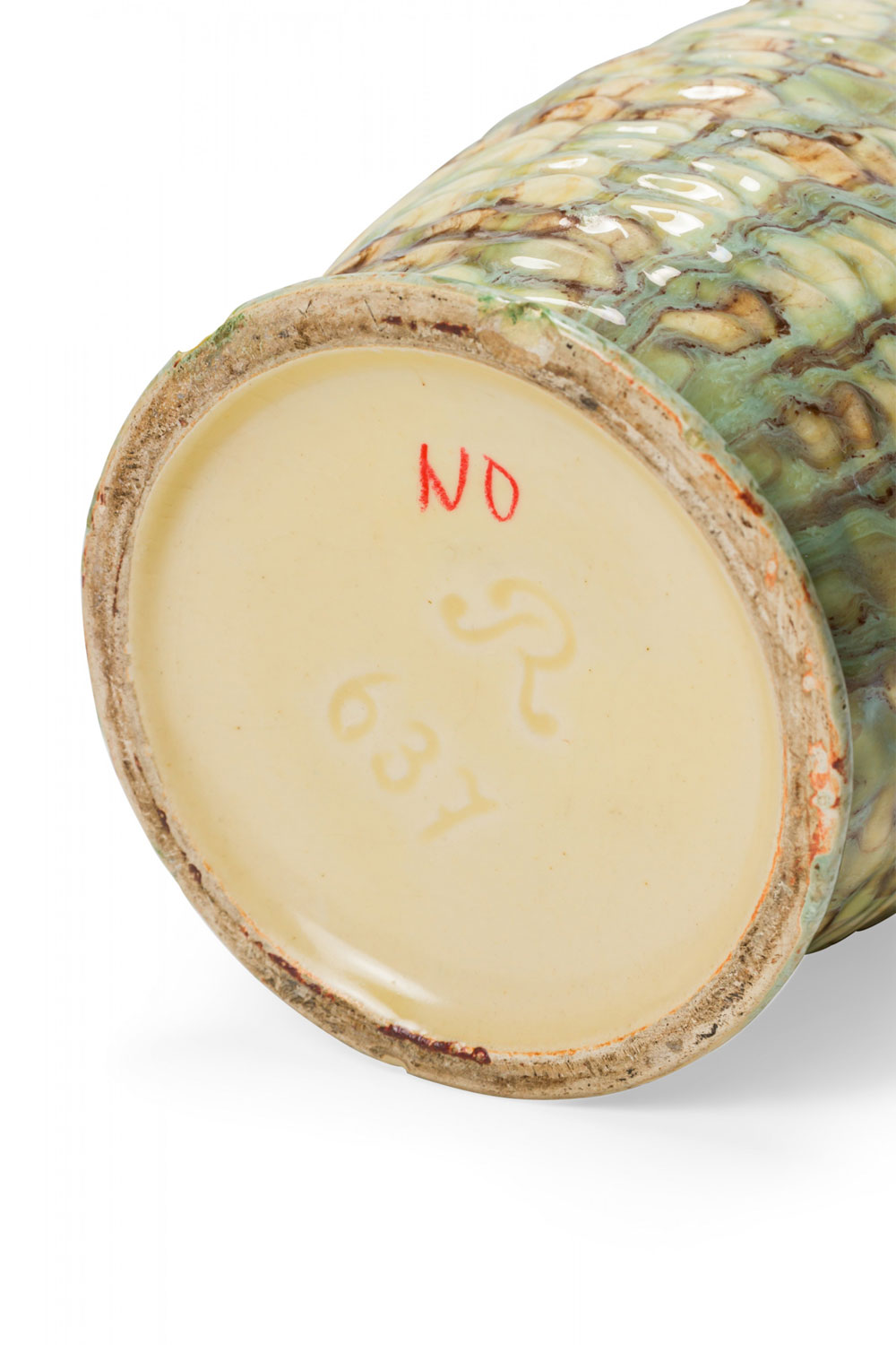 German Mid-Century urn-form ceramic vase with a flared mouth and a light green, yellow, and brown drip glaze. (mark on bottom, "R").
