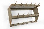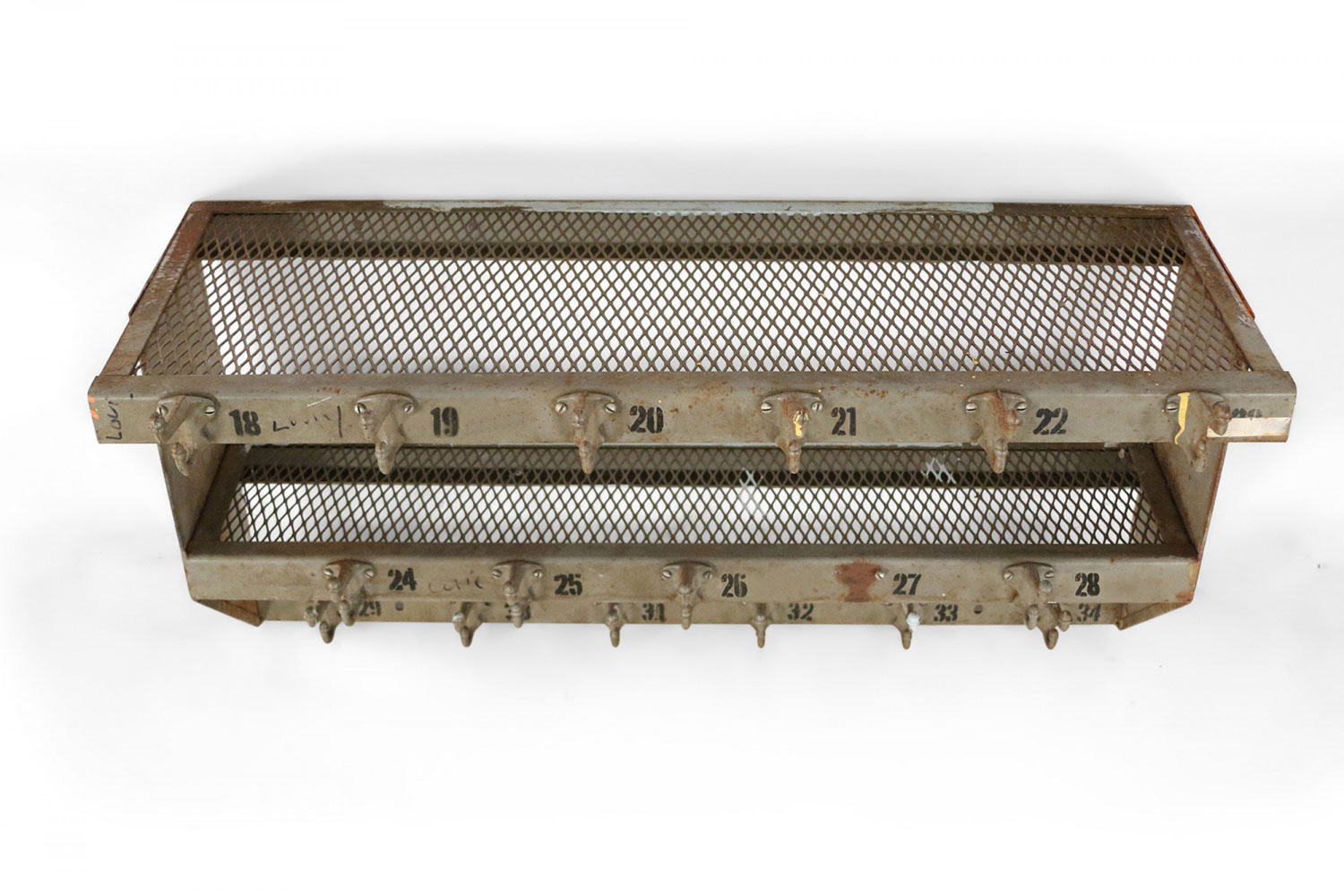 Mid-Century Industrial patinated unfinished metal wall mounted coat / hat rack with three rows of hooks and two mesh metal shelves.