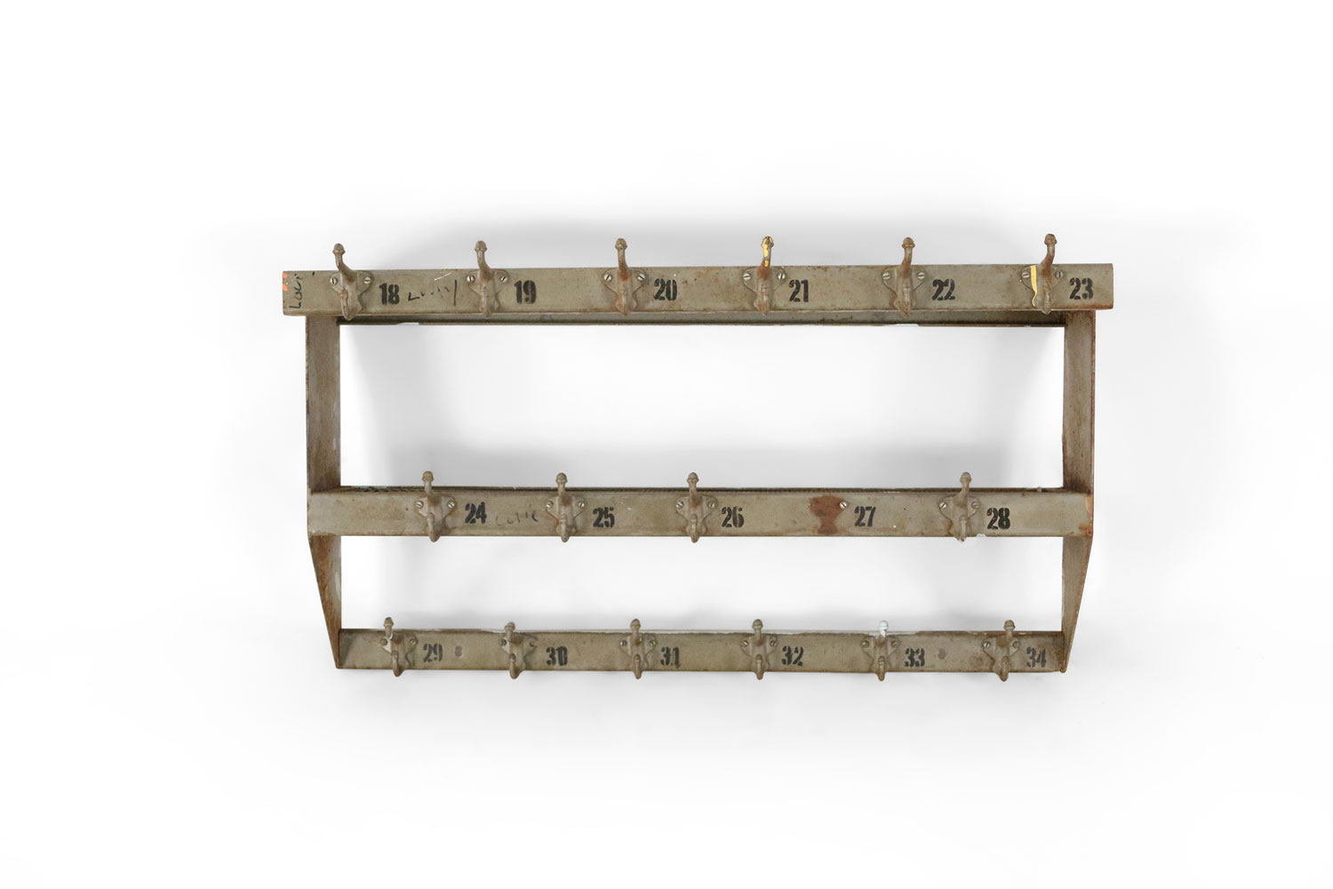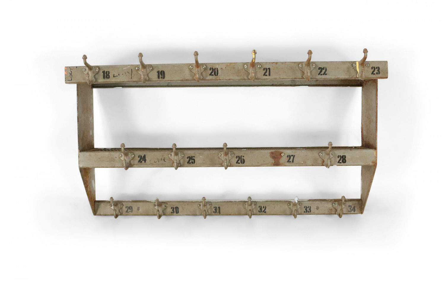 Mid-Century Industrial patinated unfinished metal wall mounted coat / hat rack with three rows of hooks and two mesh metal shelves..