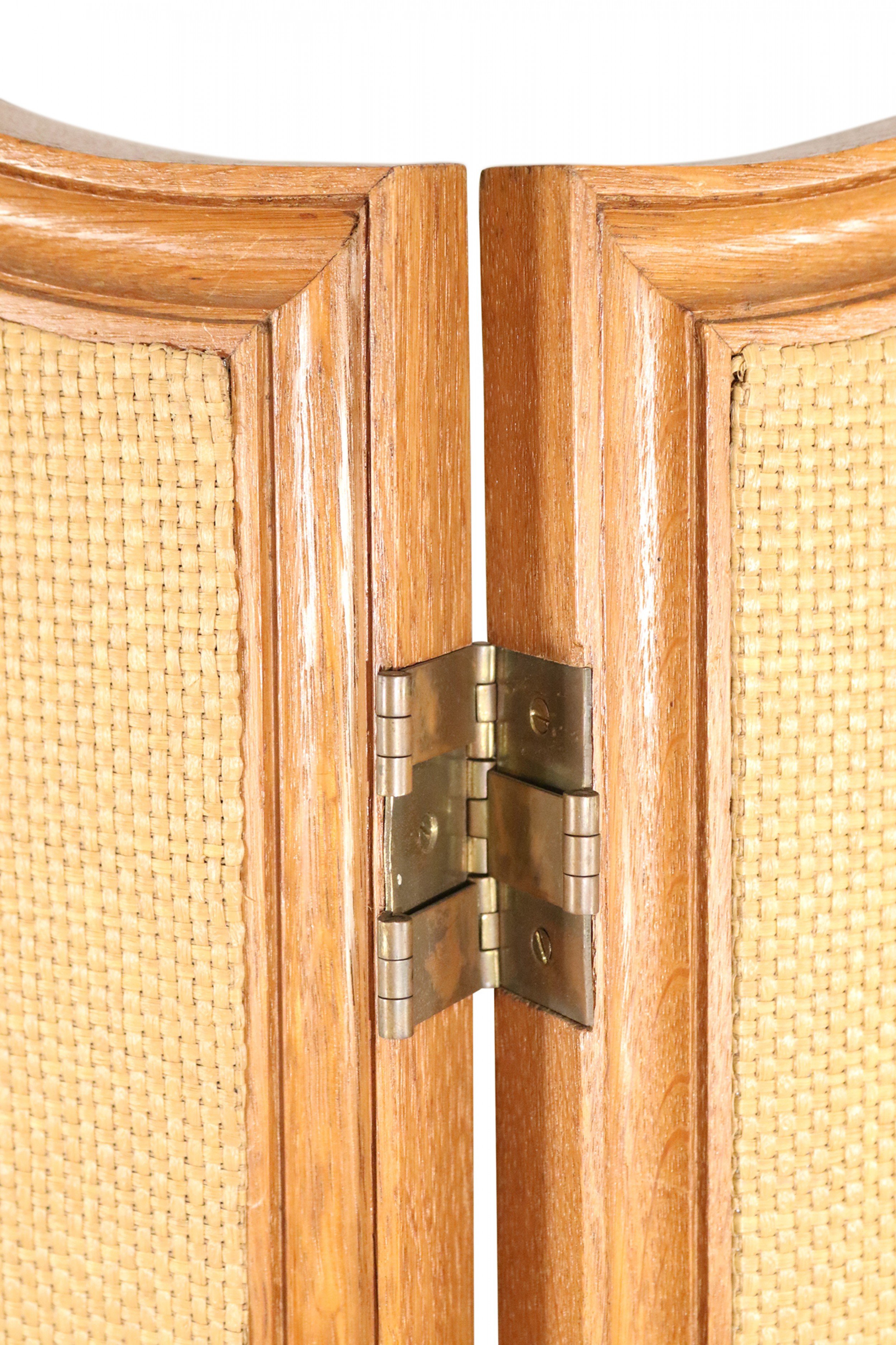 Mid-Century French 6-fold screen with oak shaped top frame and rattan panels..