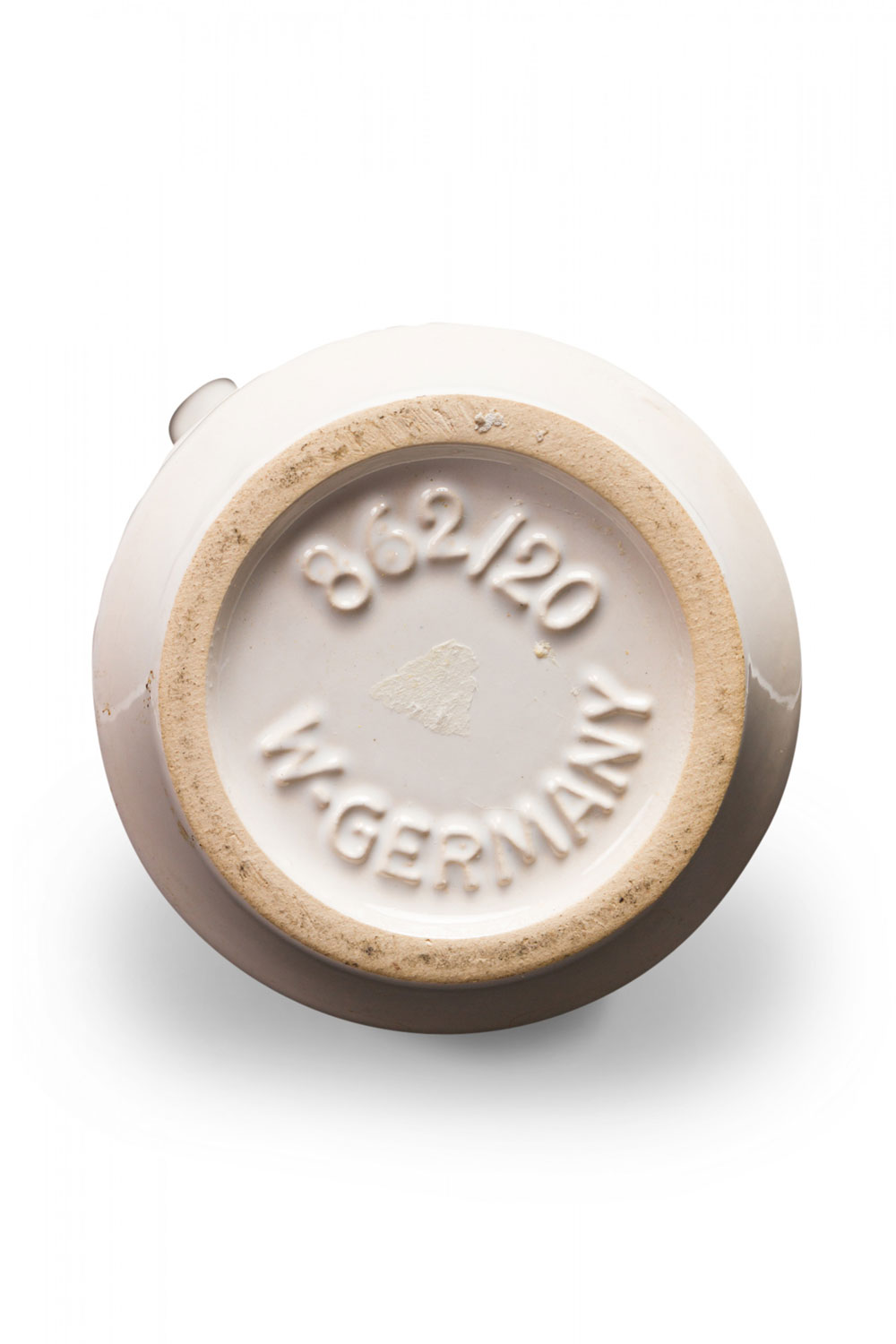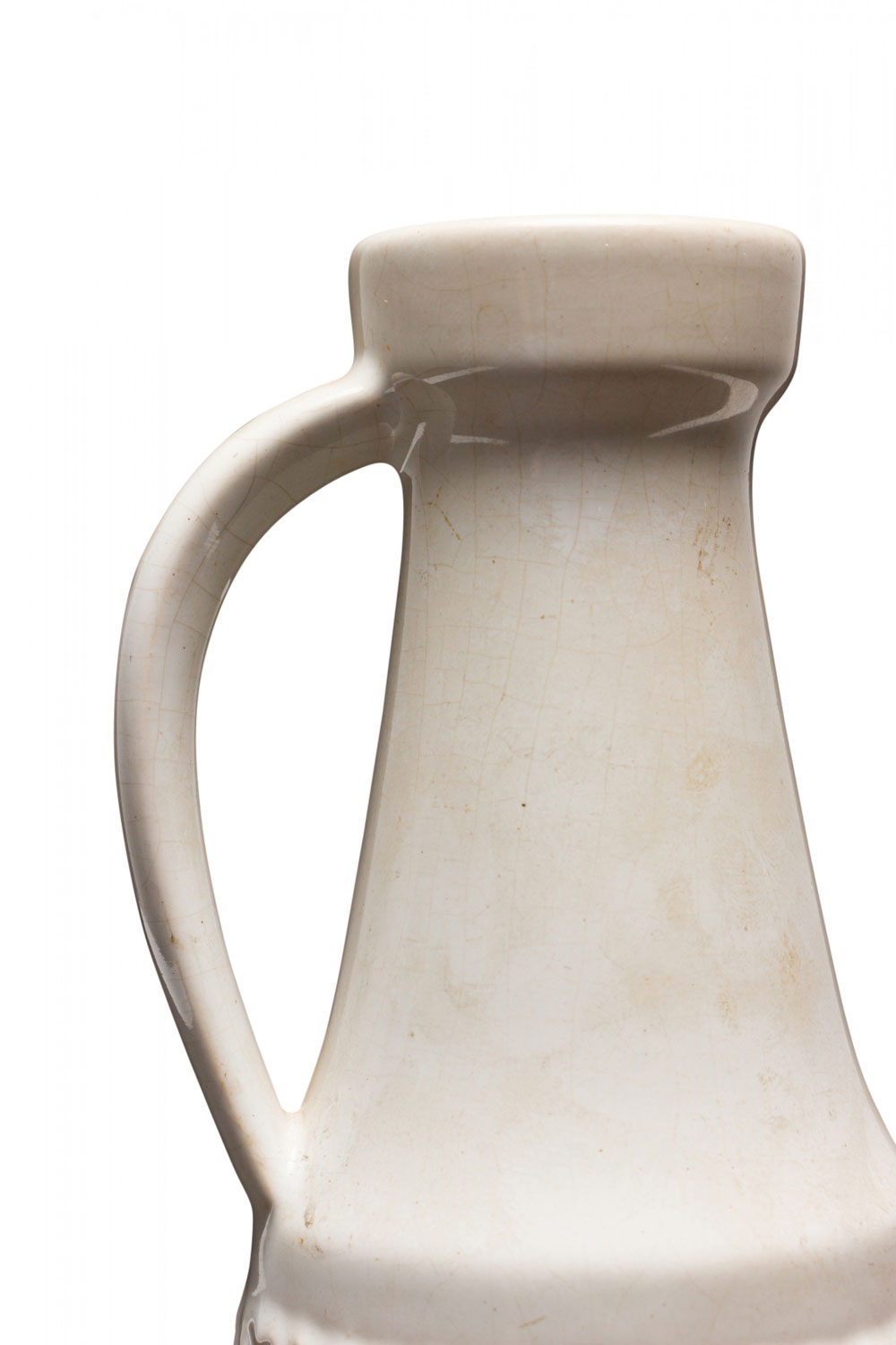 West German Mid-Century ceramic handled vase with a dimpled band around the bottom and a tapered neck and curved handle with a white glazed finish. (mark on bottom, W. GERMANY 862/20).