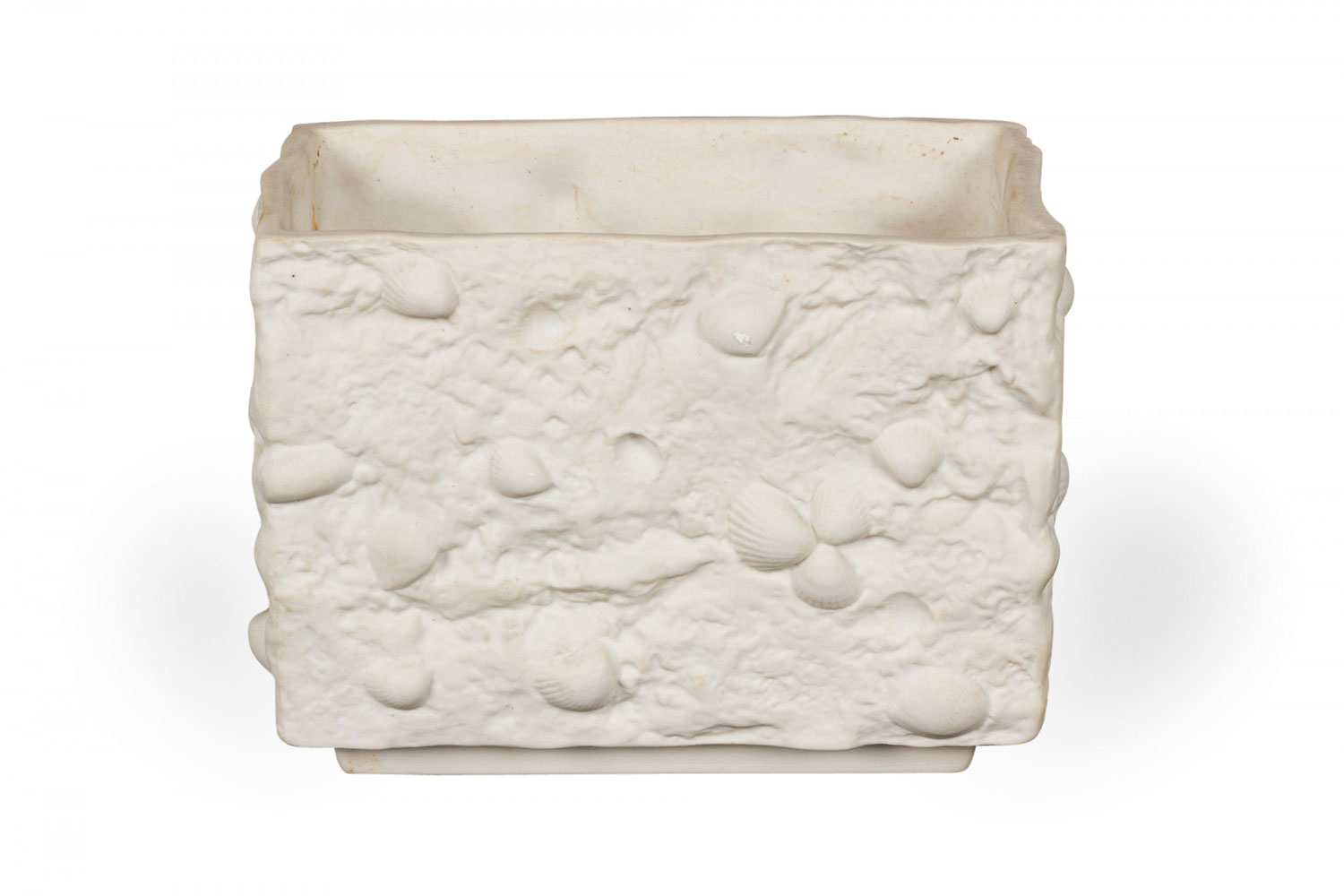 German Mid-Century rectangular porcelain vase with embedded seashells and a textured exterior. (Similar piece: 063059)