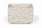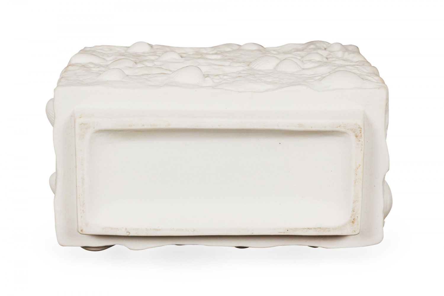 German Mid-Century rectangular porcelain vase with embedded seashells and a textured exterior. (Similar piece: 063059).