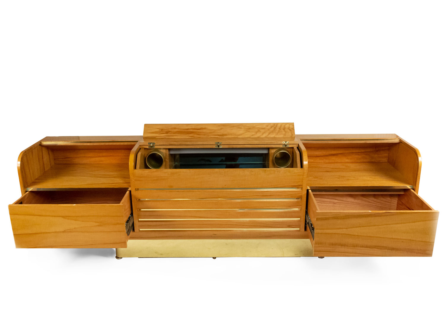 American Mid-Century tiger maple sideboard / bar with tambour side shelves over two drawers & center section with raising mechanism (Custom Vladimir Kagan design for JFK TWA Saarinen Terminal)..