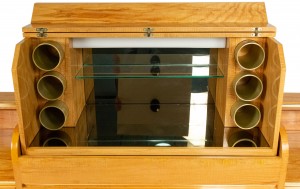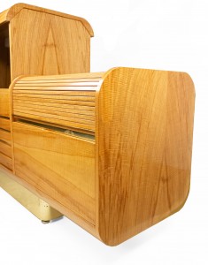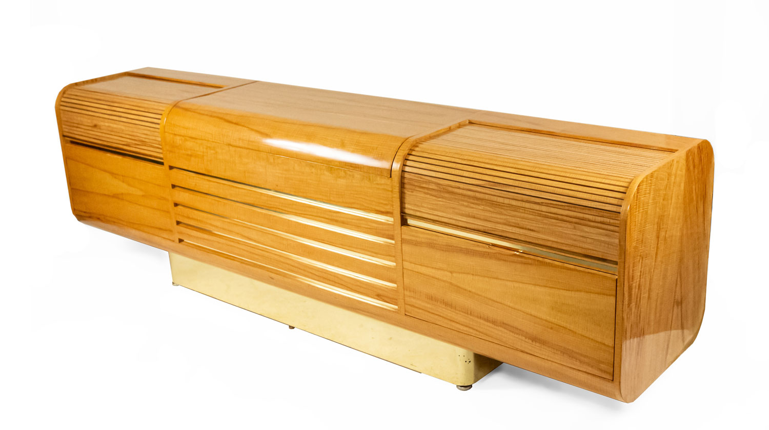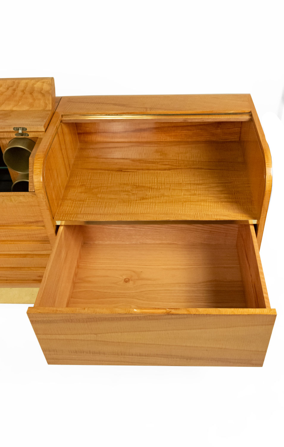 American Mid-Century tiger maple sideboard / bar with tambour side shelves over two drawers & center section with raising mechanism (Custom Vladimir Kagan design for JFK TWA Saarinen Terminal).