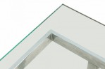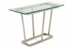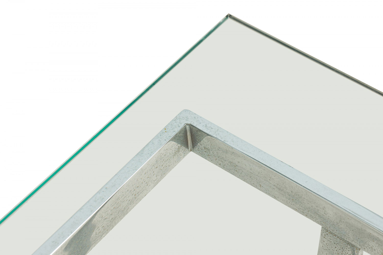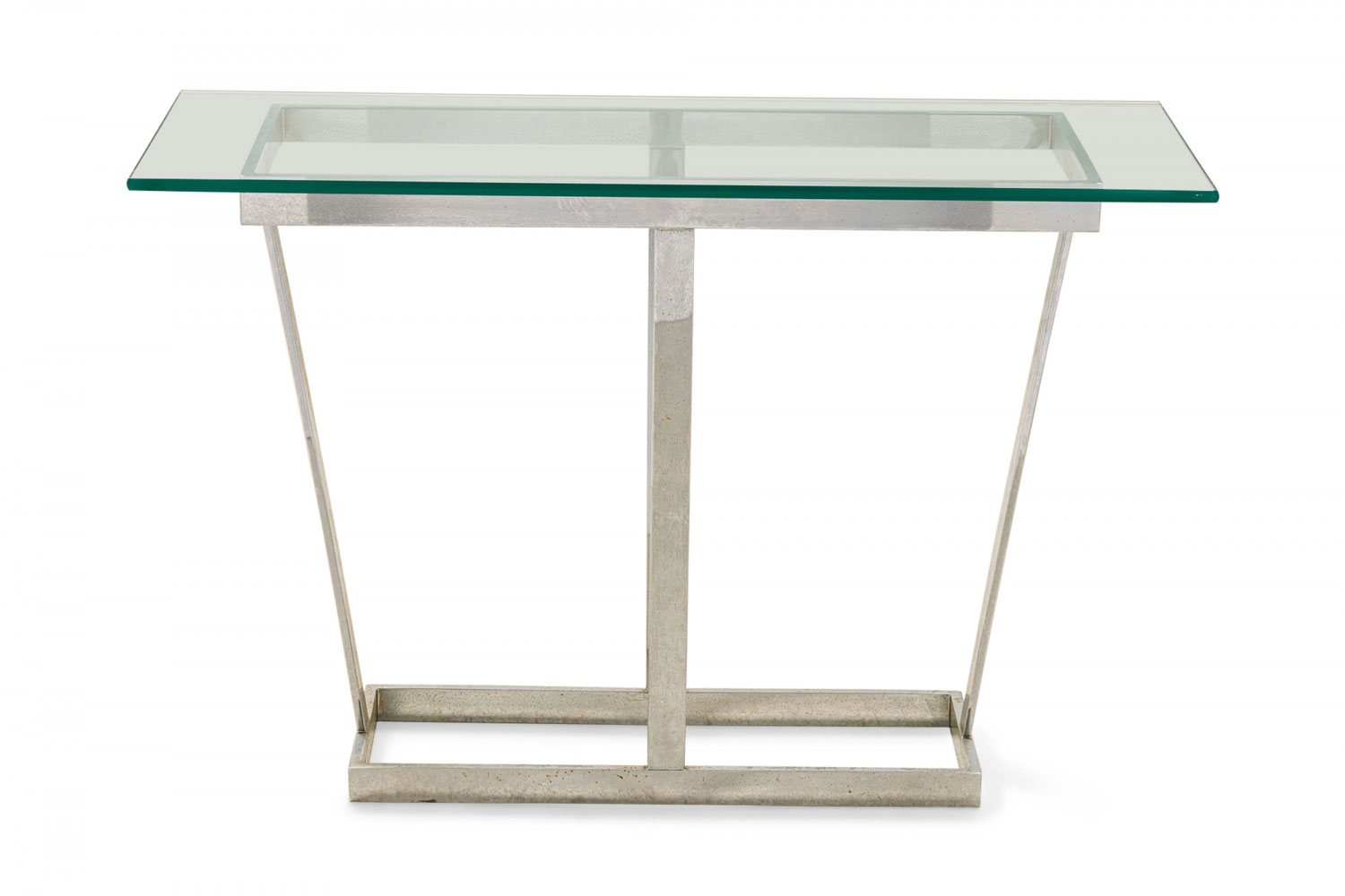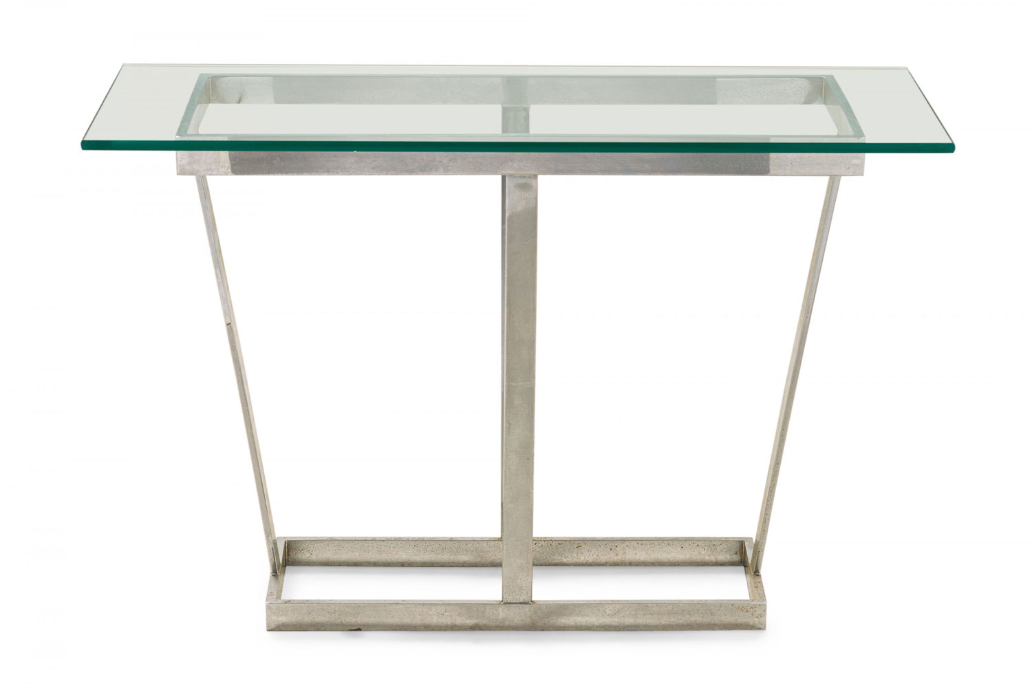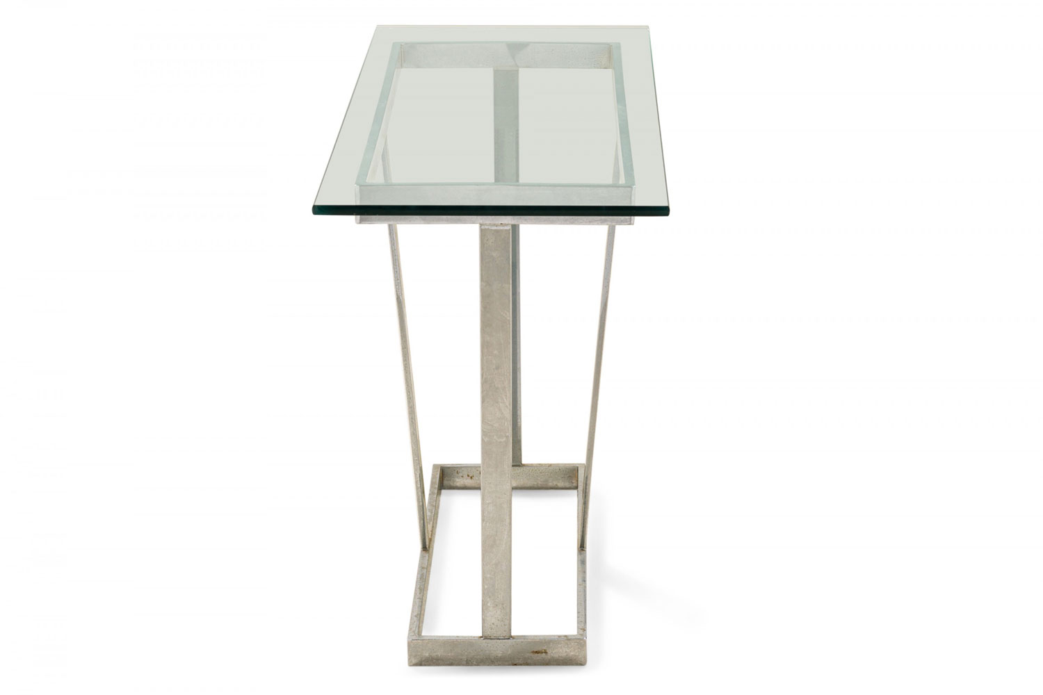 American Mid-Century console table with a rectangular glass top supported by a polished chrome plated square tube frame base. (MILO BAUGHMAN)
