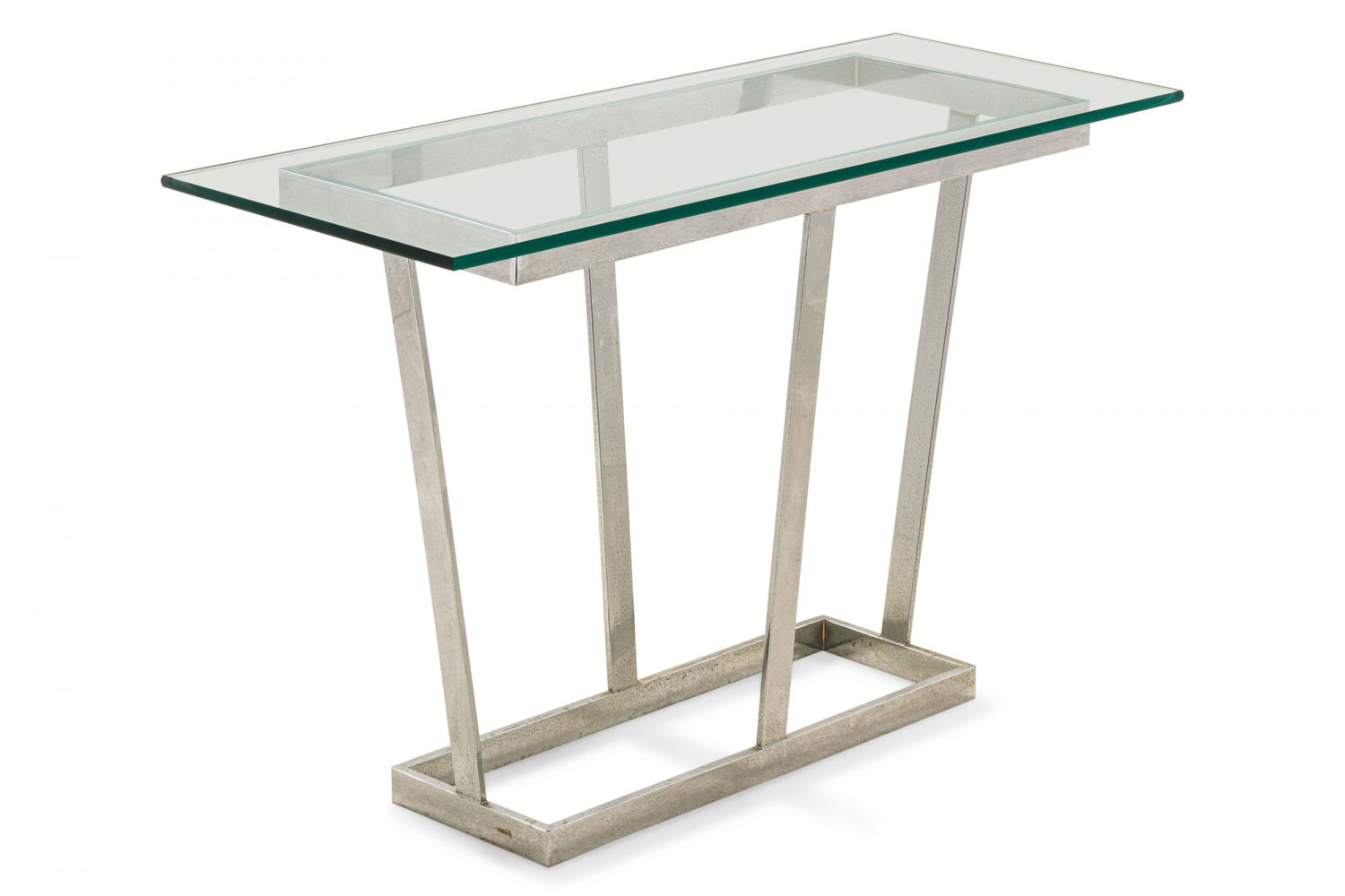 American Mid-Century console table with a rectangular glass top supported by a polished chrome plated square tube frame base. (MILO BAUGHMAN).
