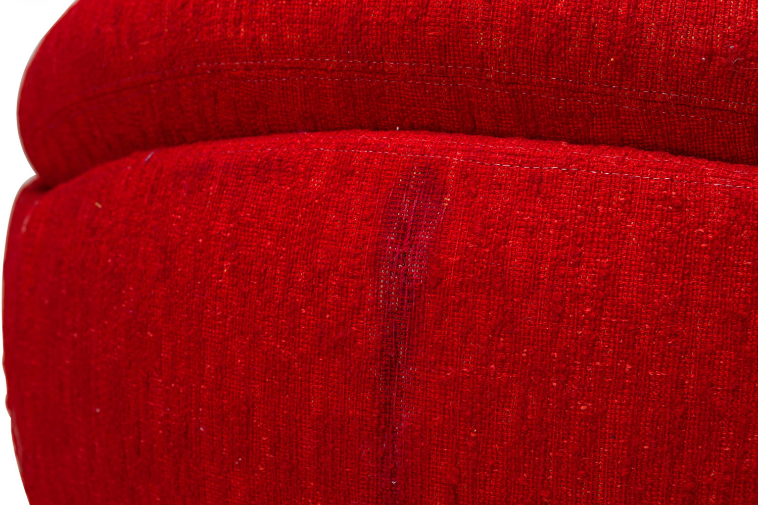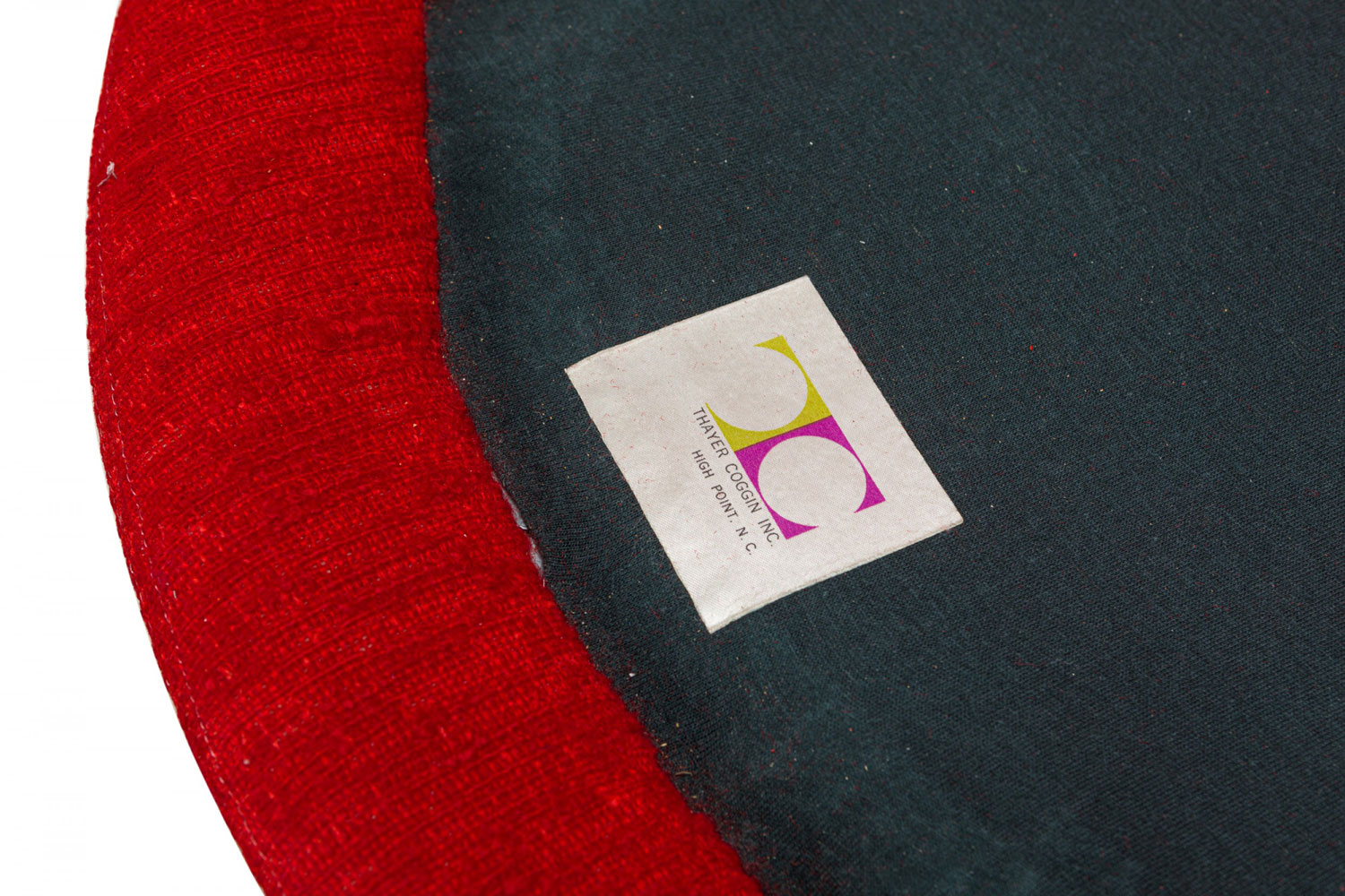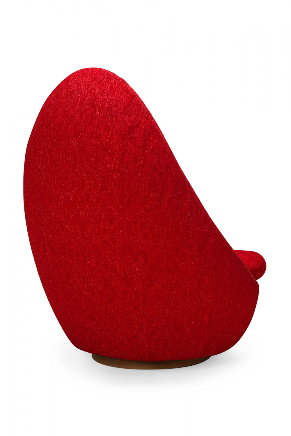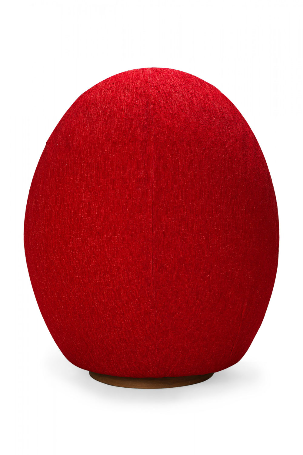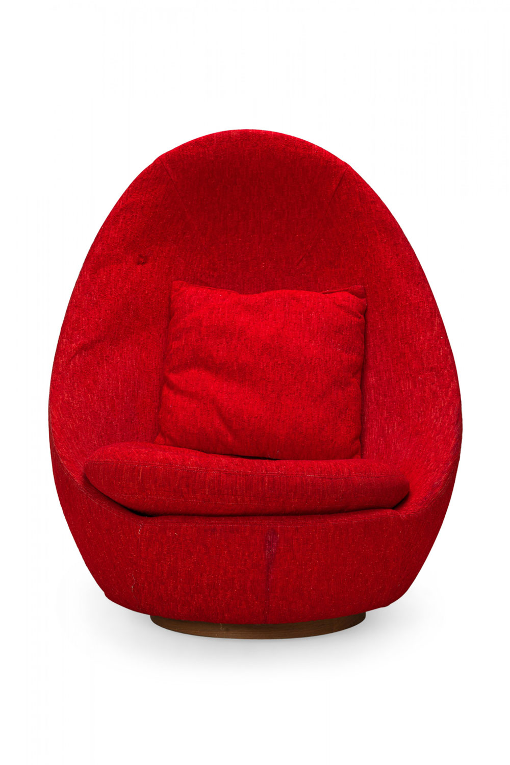 American Mid-Century swivel egg chair with a curved egg-like form upholstered in textured red upholstery with a matching throw pillow. (MILO BAUGHMAN)(Available in other fabrics: DUF0342, DUF0343).