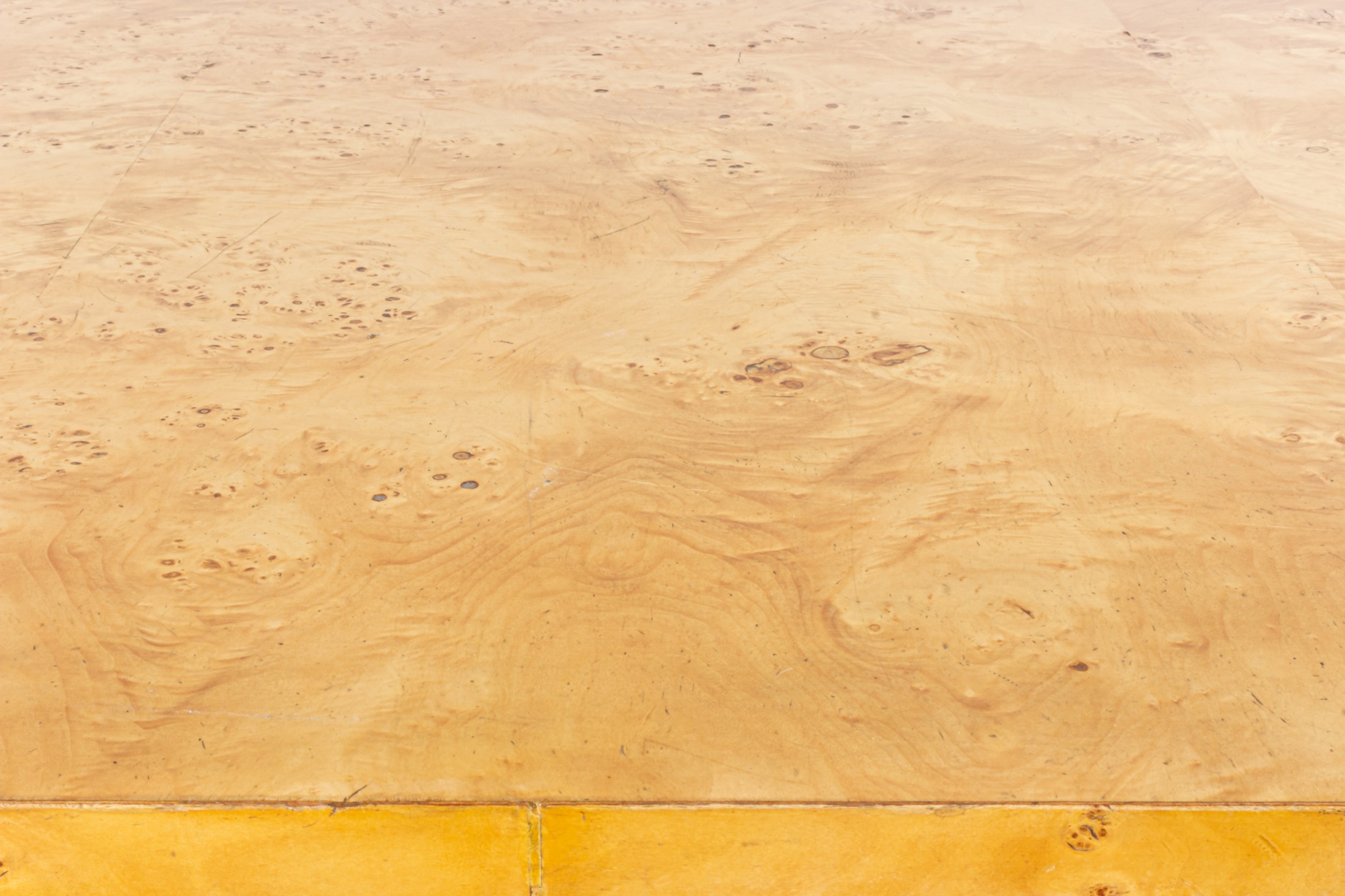 Style: Mid-Century Materials & Techniques: Burl, metal, wood Category: Tables, Office/Library, Dining Room Condition: 101W with both leaves in Good; Wear consistent with age and use
