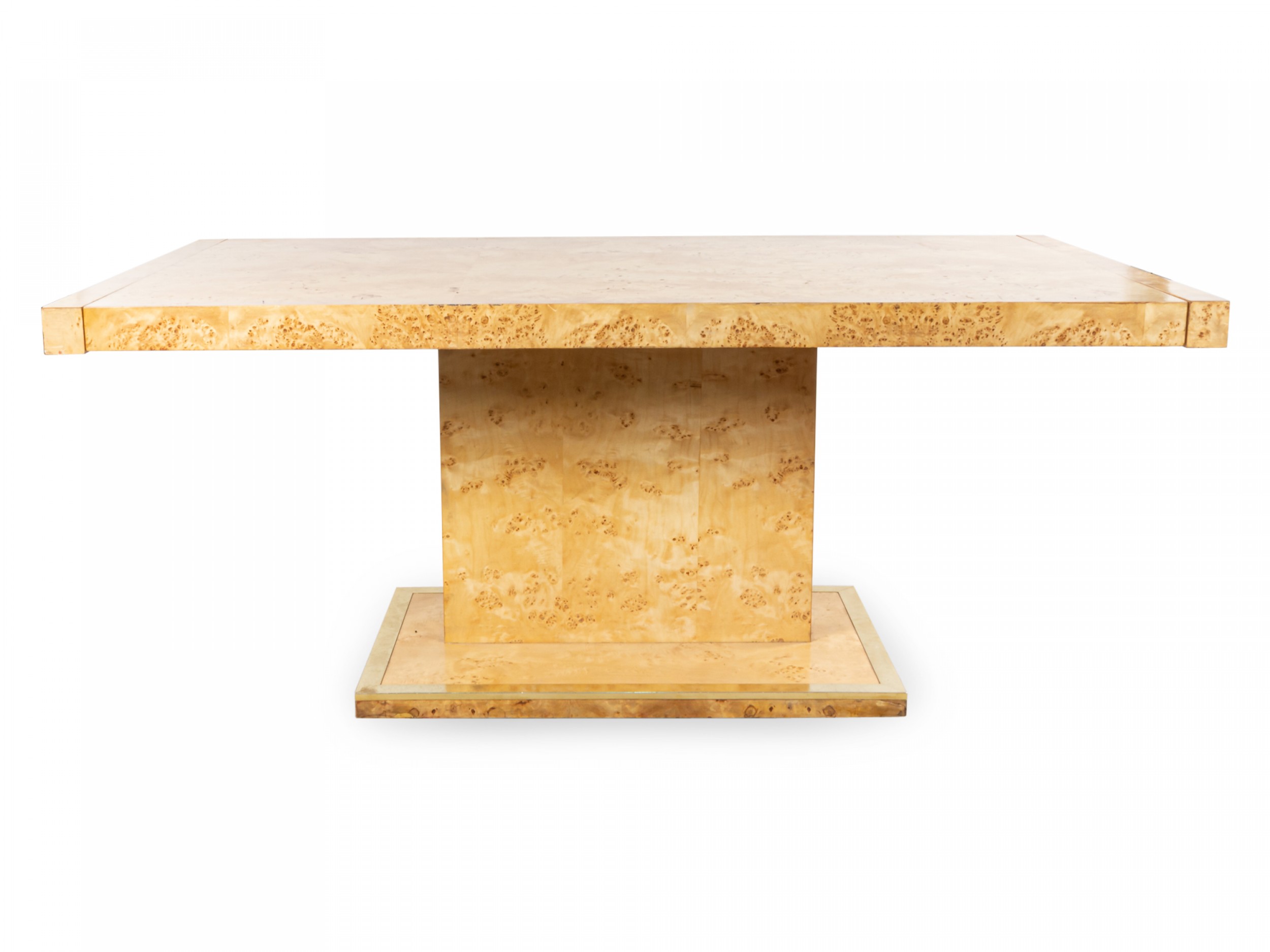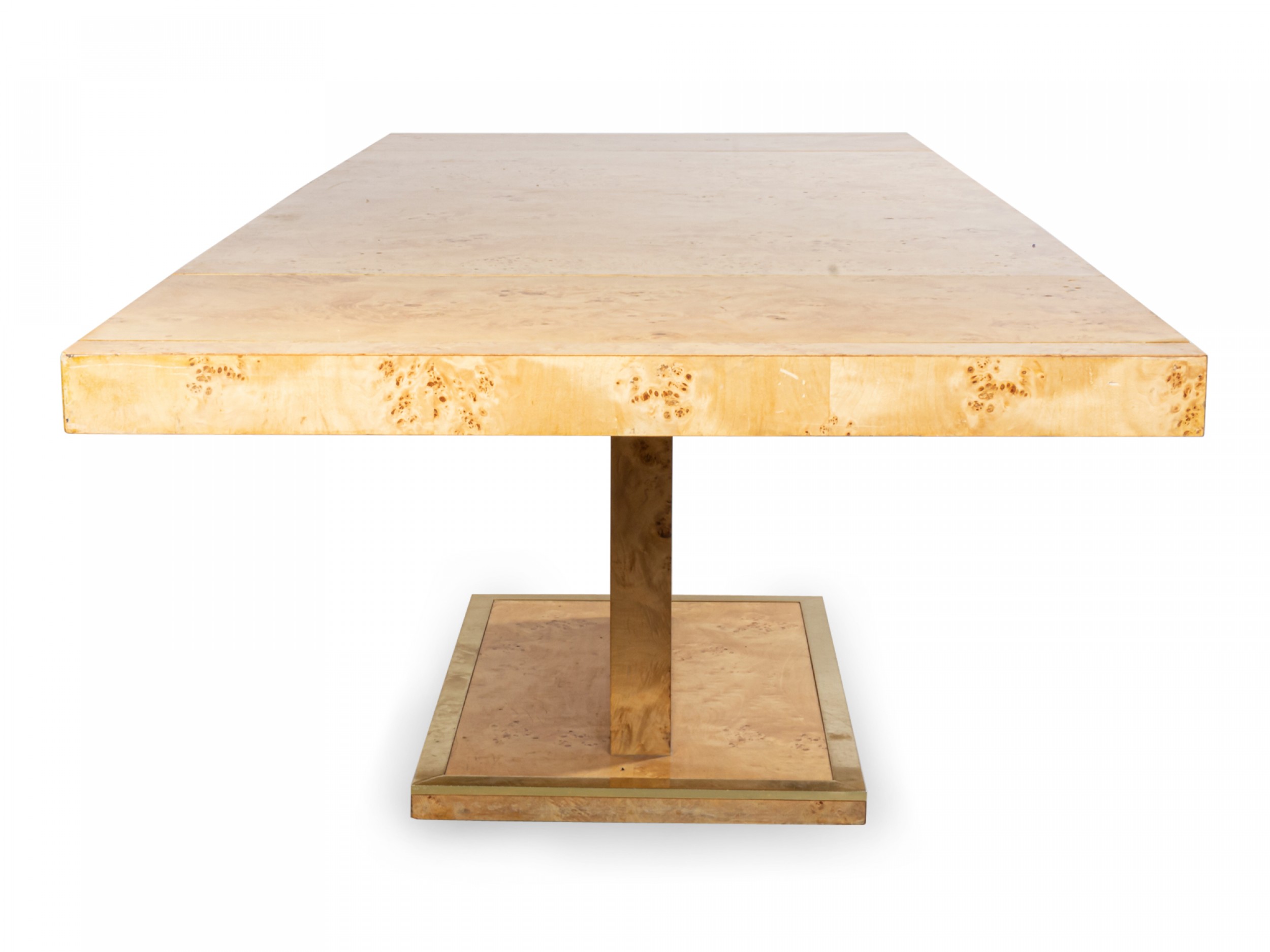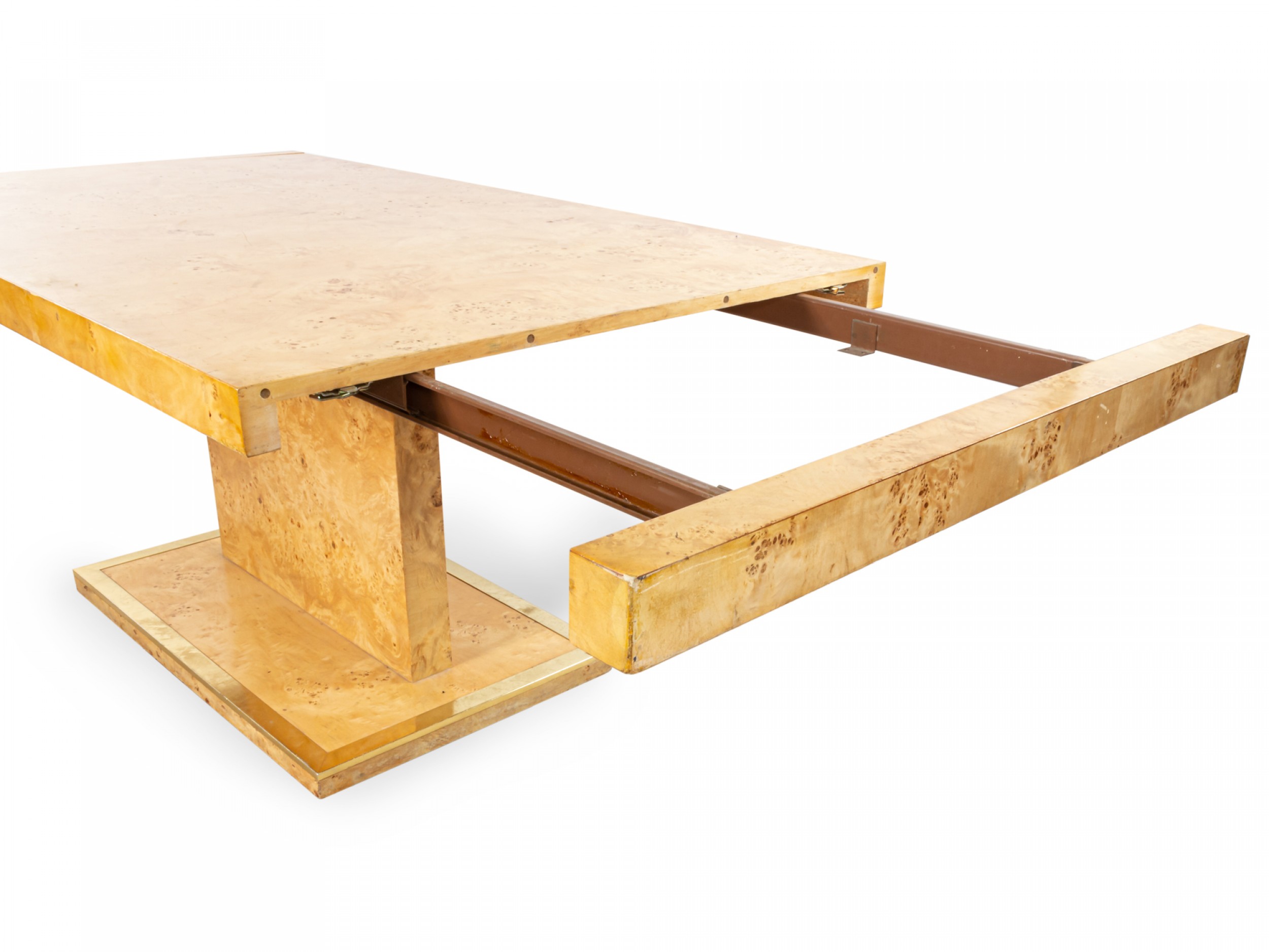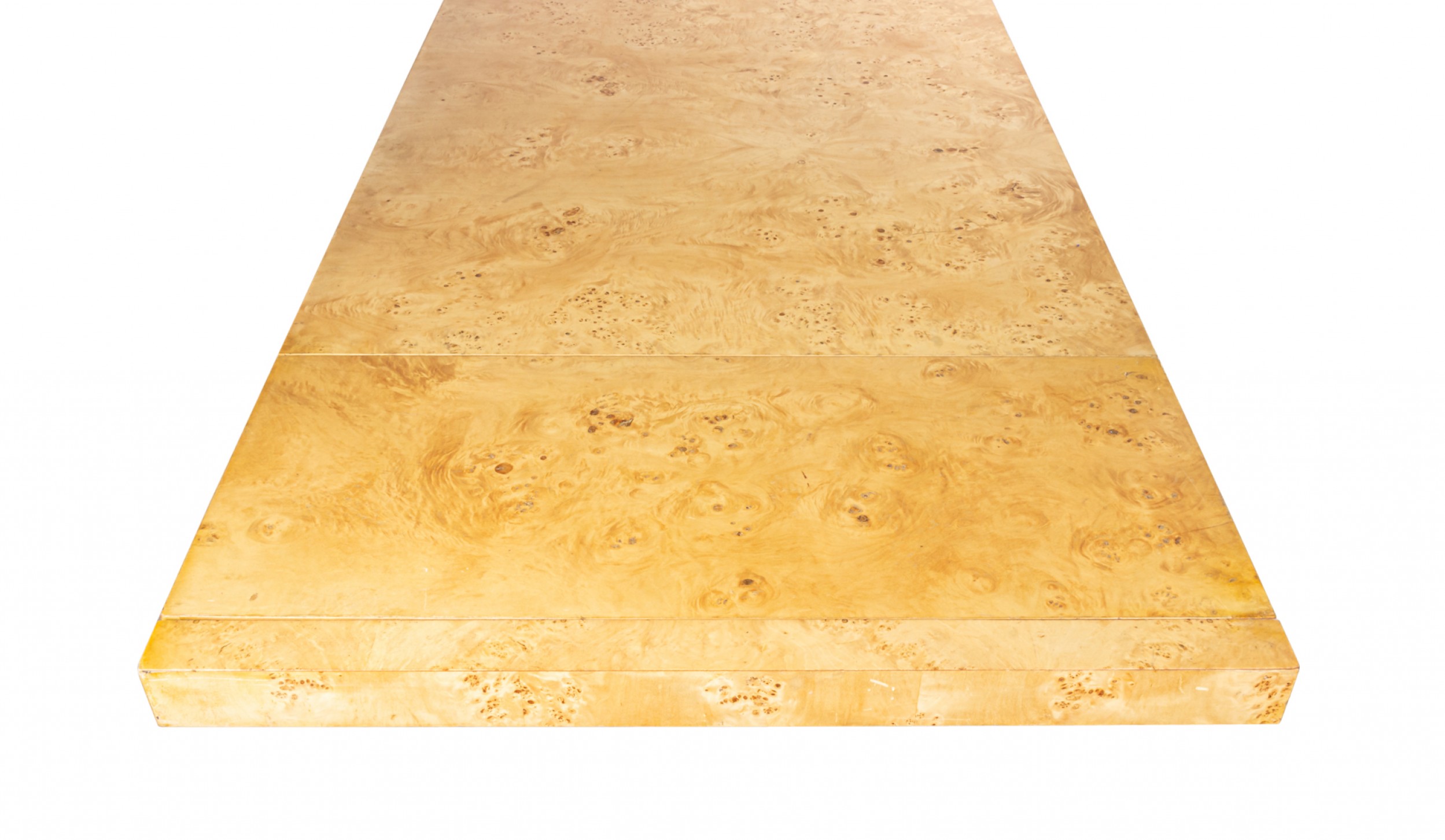 Mid-Century Milo Baughman-style burl wood dining table, with two extending leaves and metal frame on base (leaves are 16.5" each, table is 101" wide with both leaves).