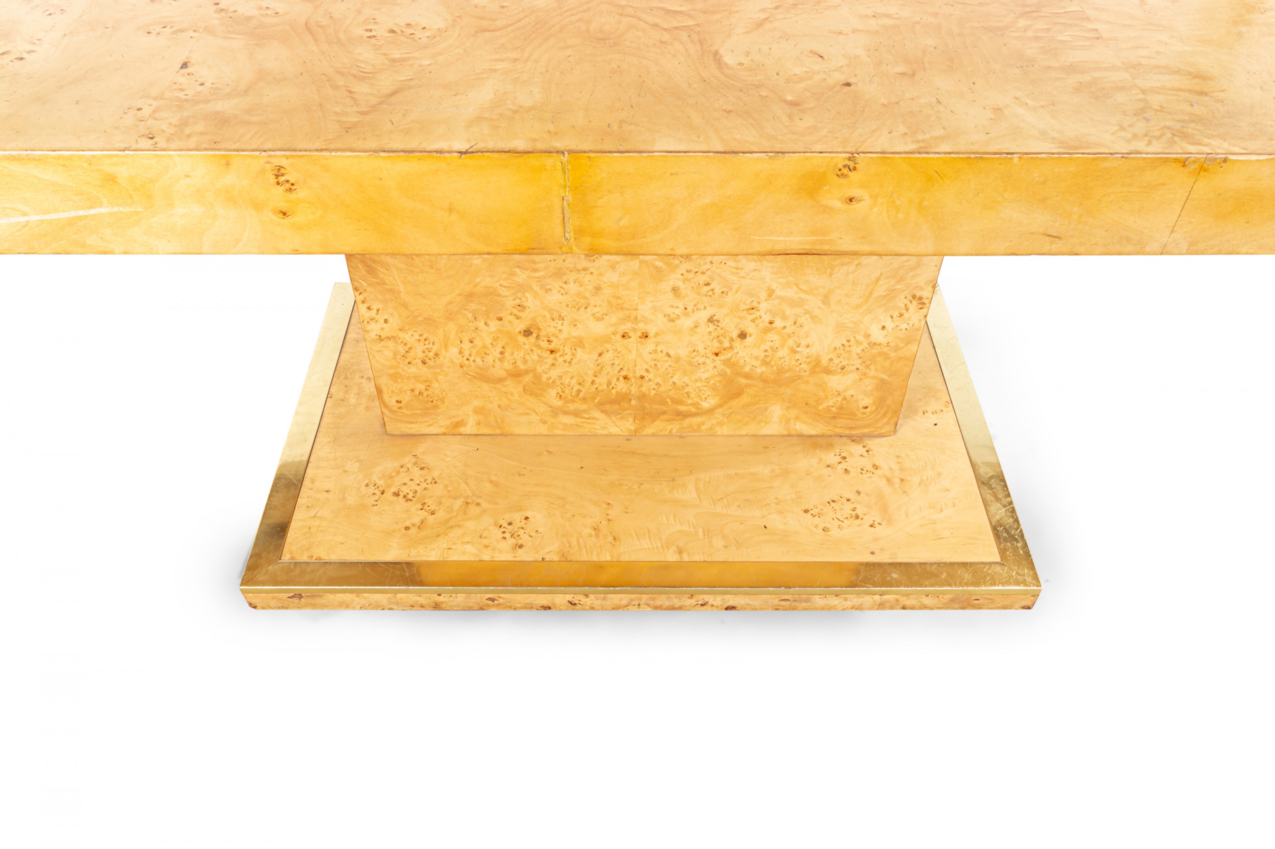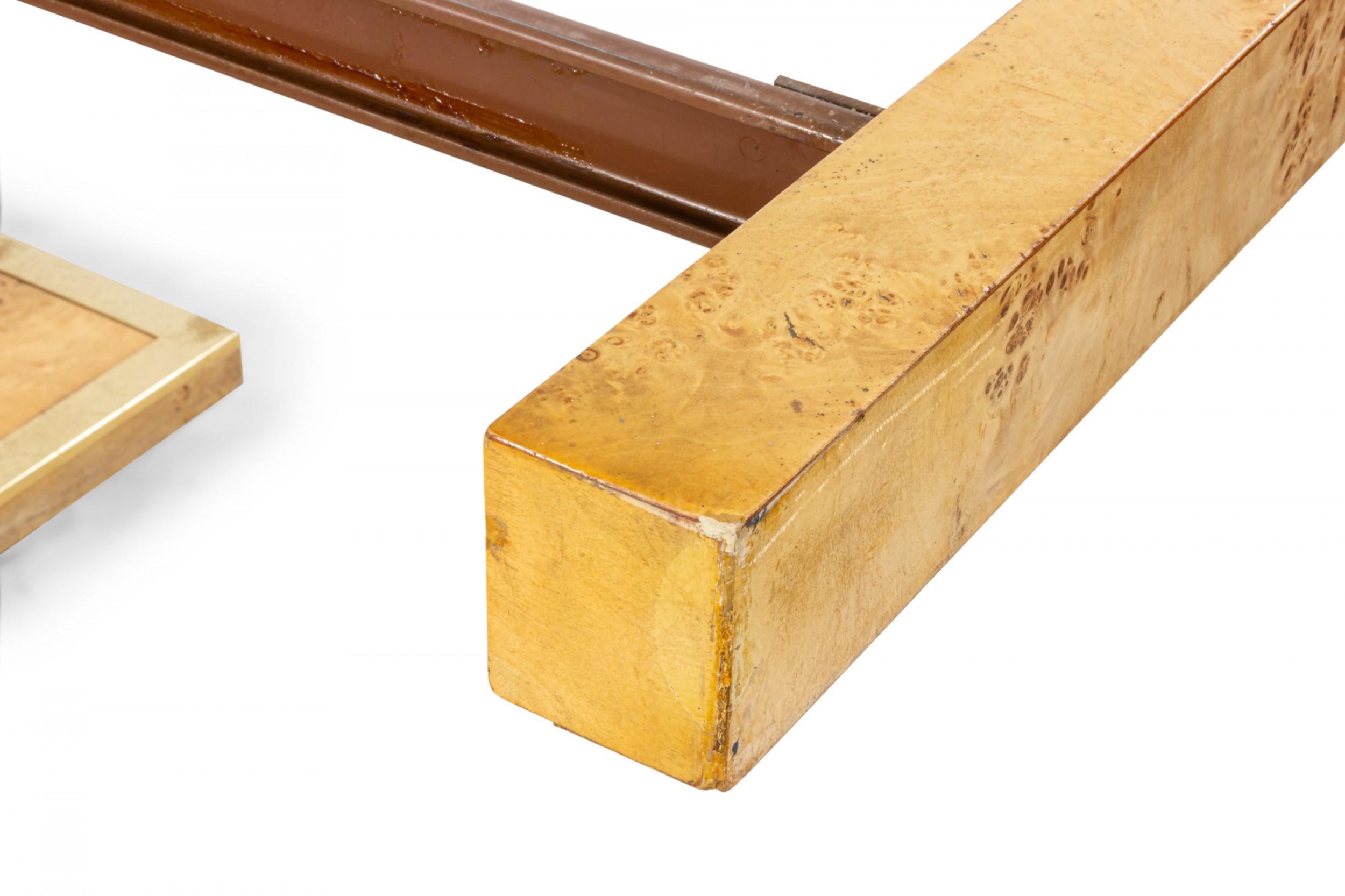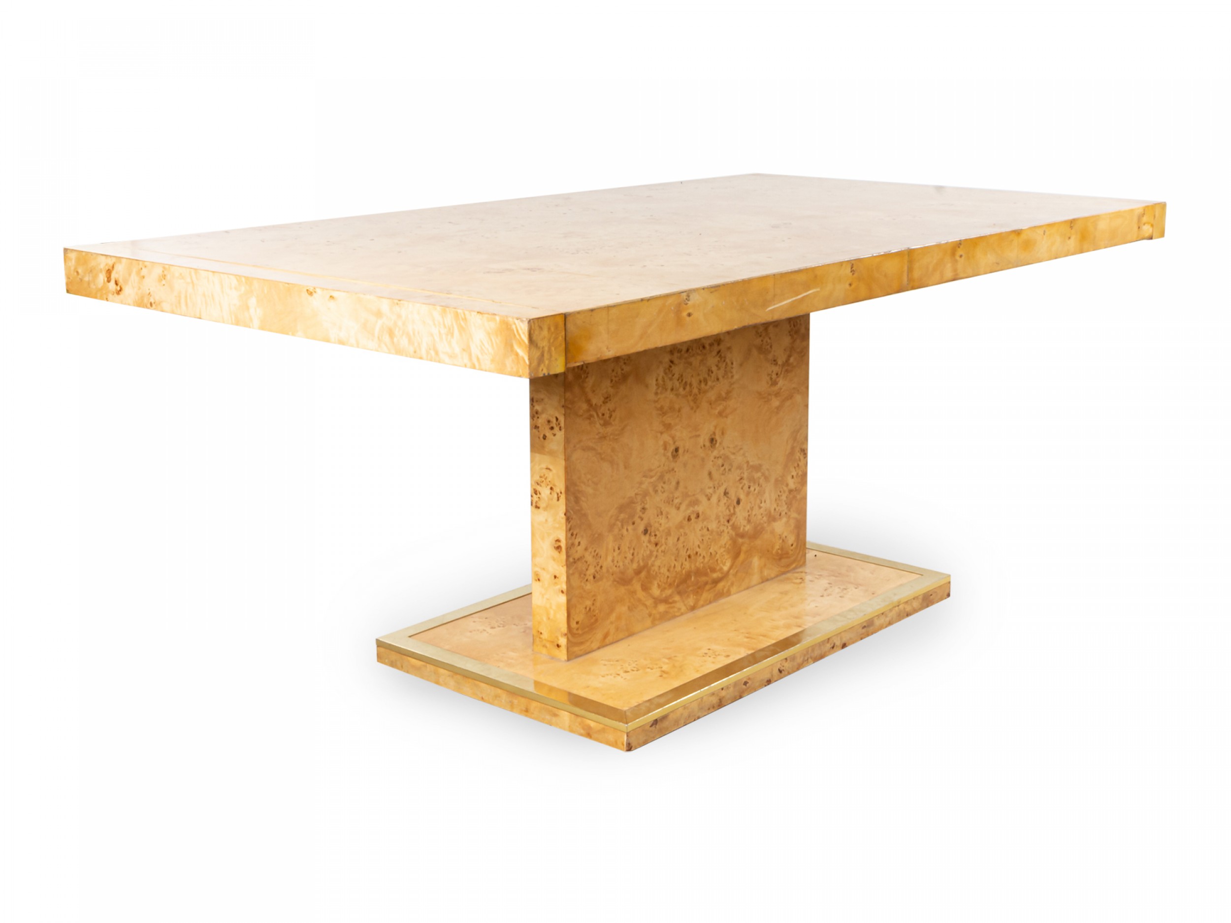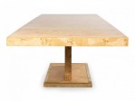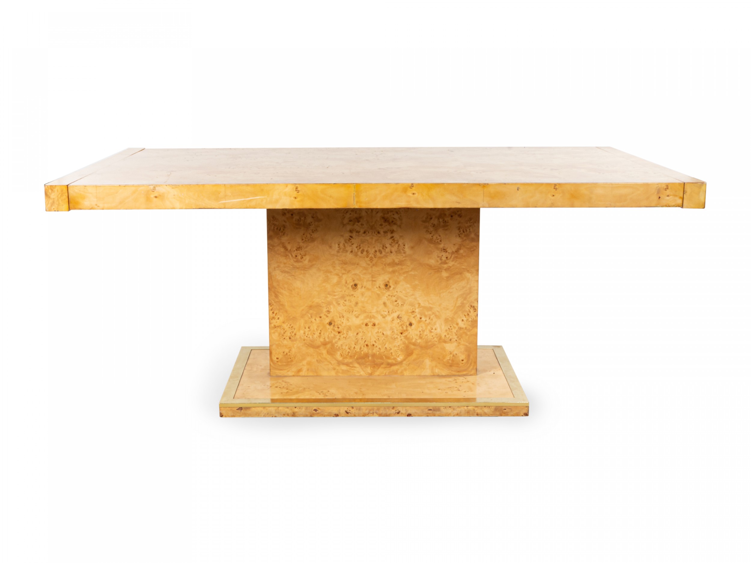Mid-Century Milo Baughman-style burl wood dining table, with two extending leaves and metal frame on base (leaves are 16.5" each, table is 101" wide with both leaves).
