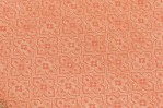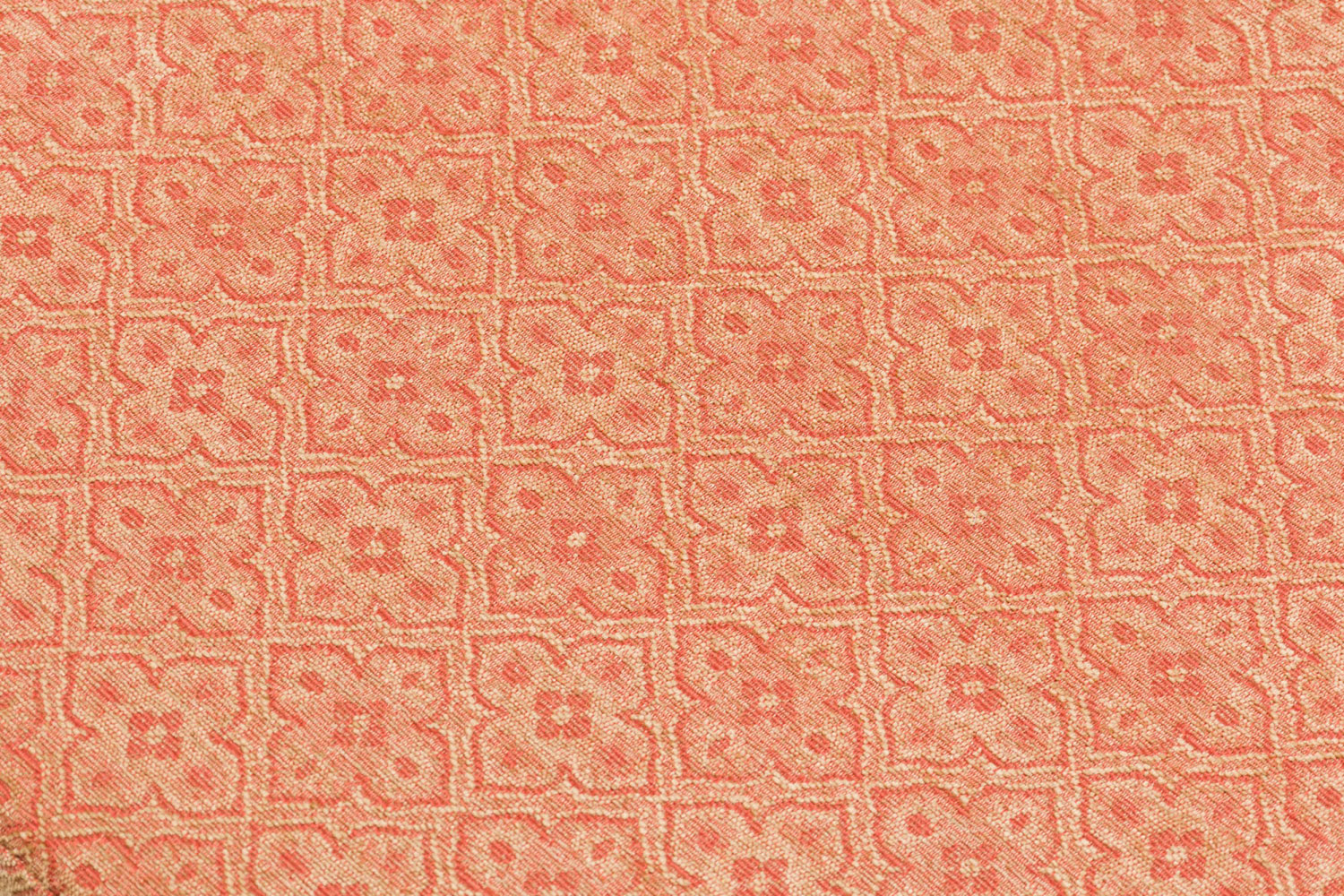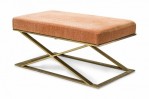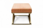 American Mid-Century bench with a pink tessellated floral pattern fabric upholstered seat resting on a brass X-form base. (MILO BAUGHMAN / THAYER COGGIN)(Similar piece: DUF0373).