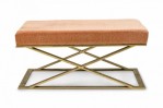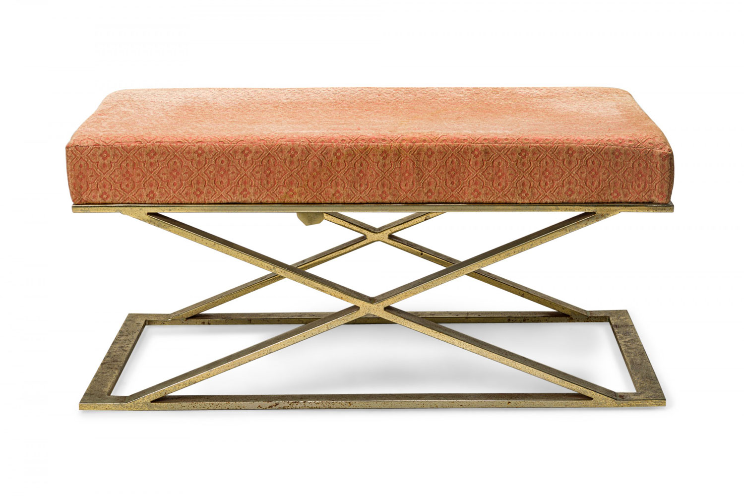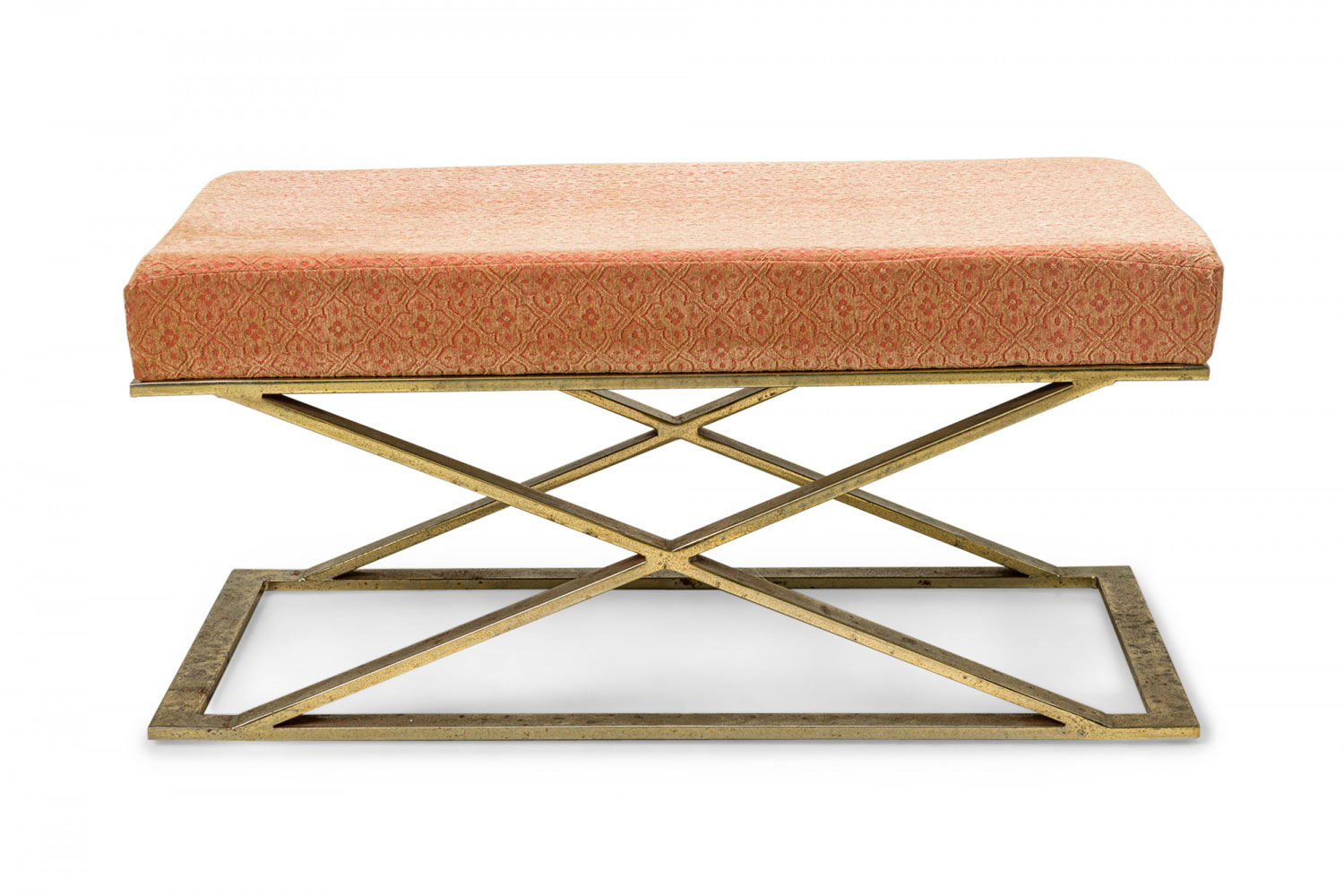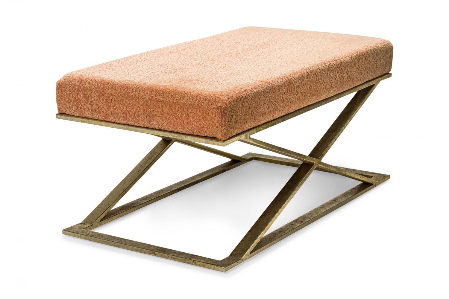 American Mid-Century bench with a pink tessellated floral pattern fabric upholstered seat resting on a brass X-form base. (MILO BAUGHMAN / THAYER COGGIN)(Similar piece: DUF0373)