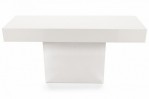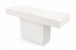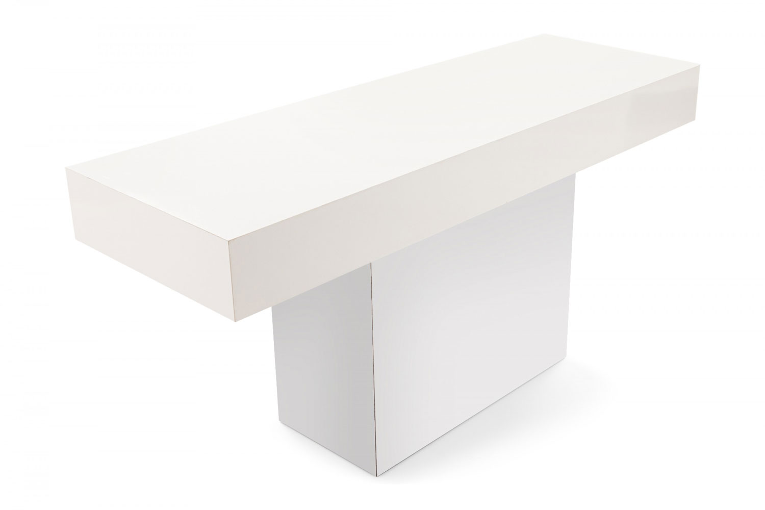 American Mid-Century monolithic console table with a rectangular white laminate top resting on a smaller polished chrome column. (MILO BAUGHMAN FOR DIRECTIONAL).