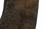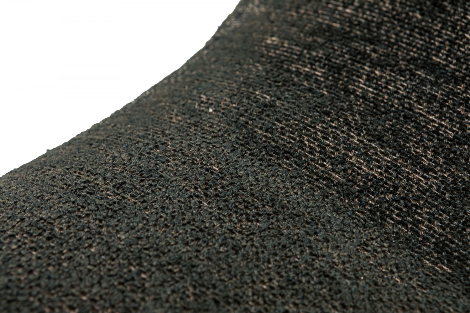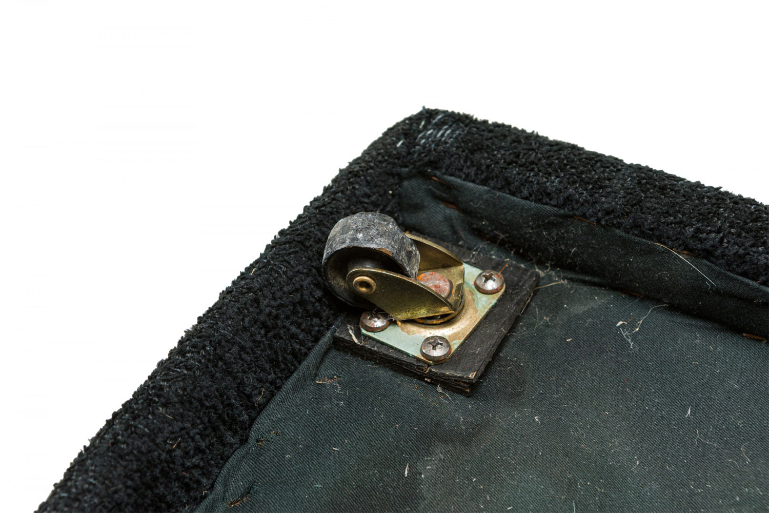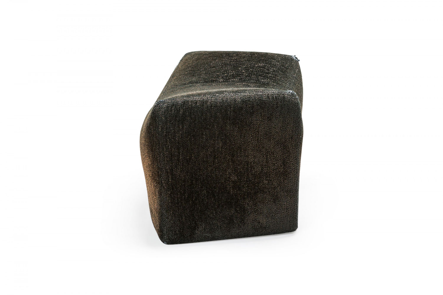 American Mid-Century saddle ottoman with textured black upholstery. (MILO BAUGHMAN)(Pair available in yellow: DUF0344).