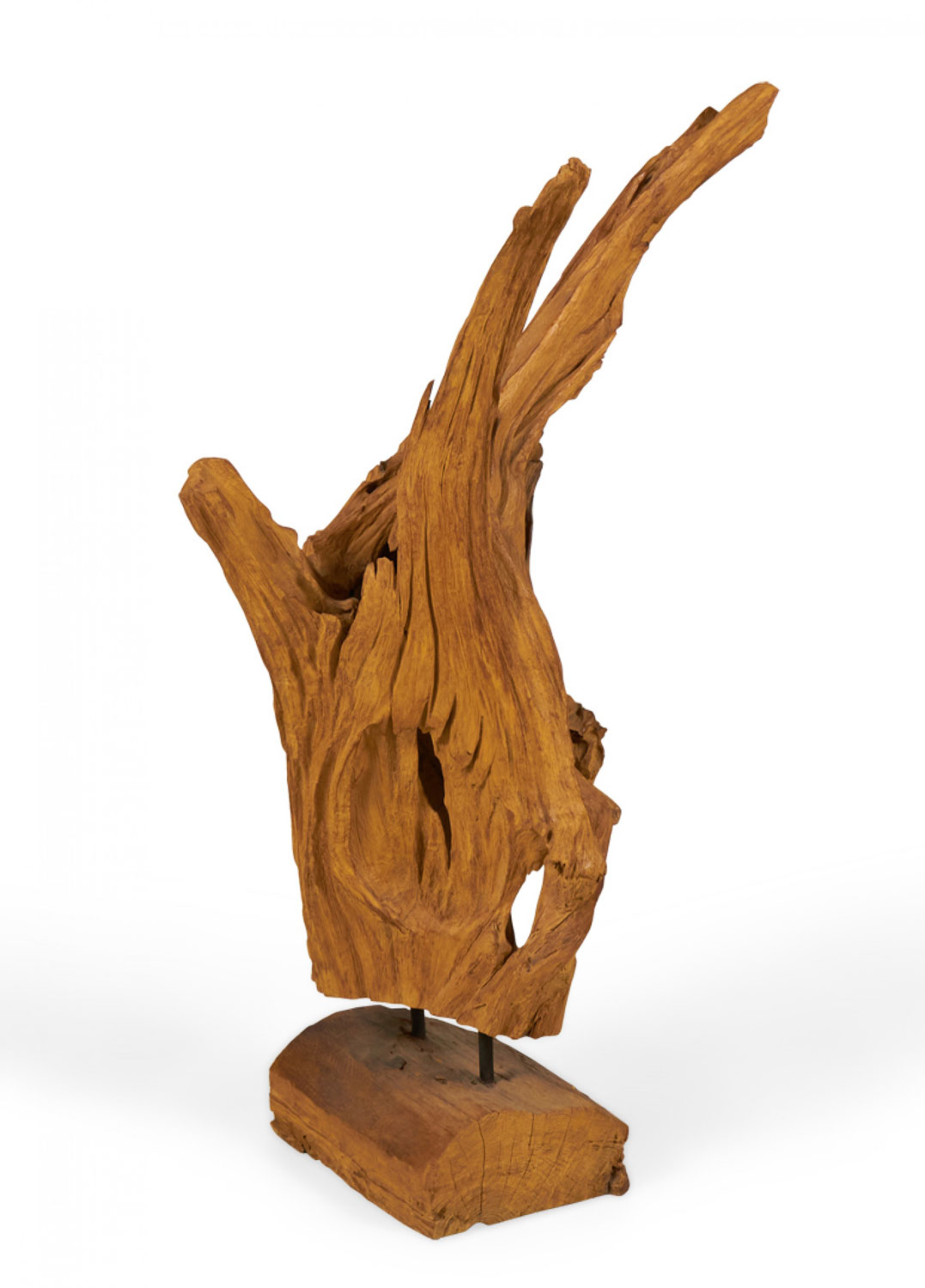 Modern sculpture comprised of an organic root from an Asian teak tree mounted with two metal rods on a rectangular wooden base.