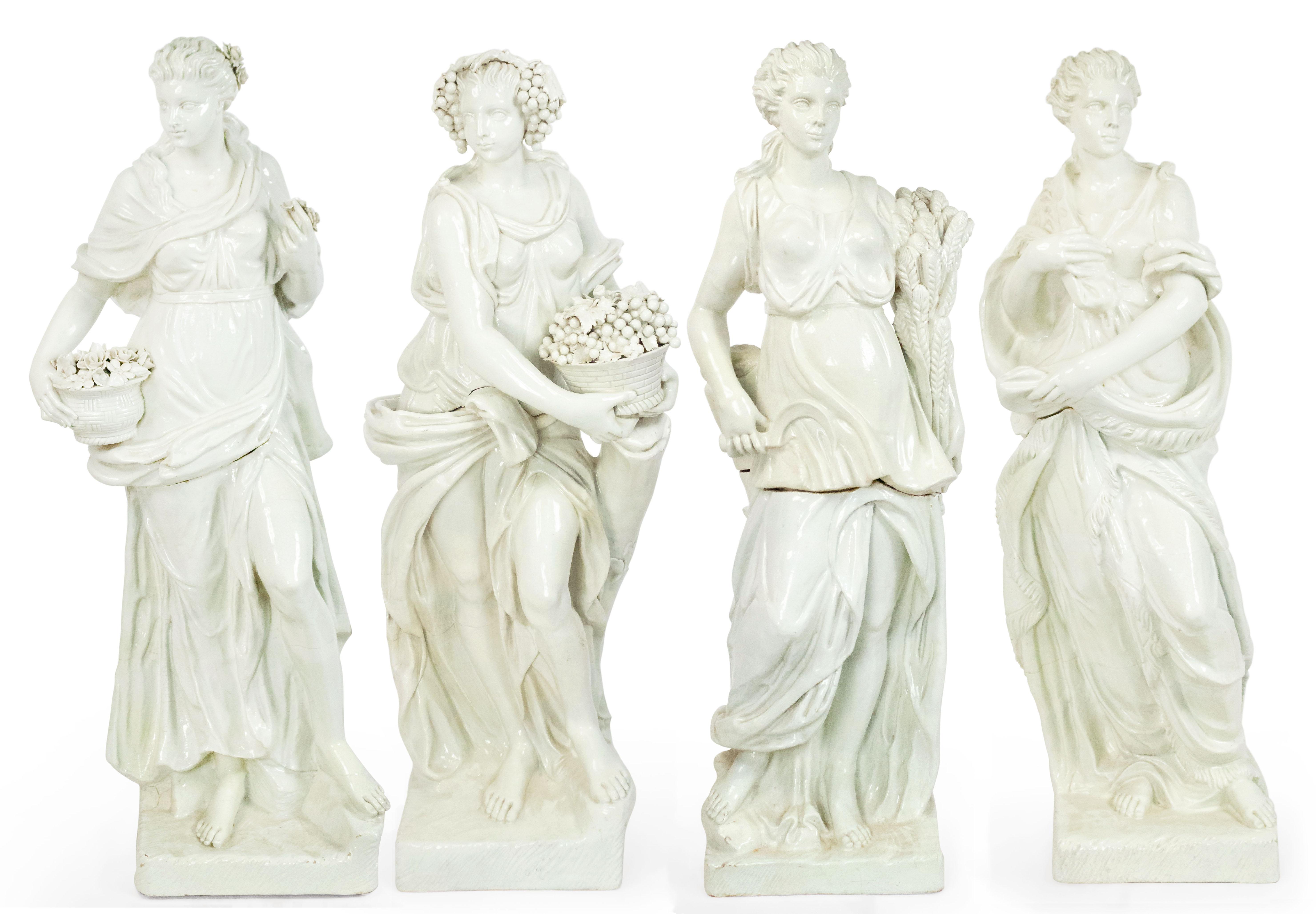 Set of 4 Italian (circa 1850) Neo-classic style large white glazed ceramic (each 2 section) figures personifying the Four Seasons..