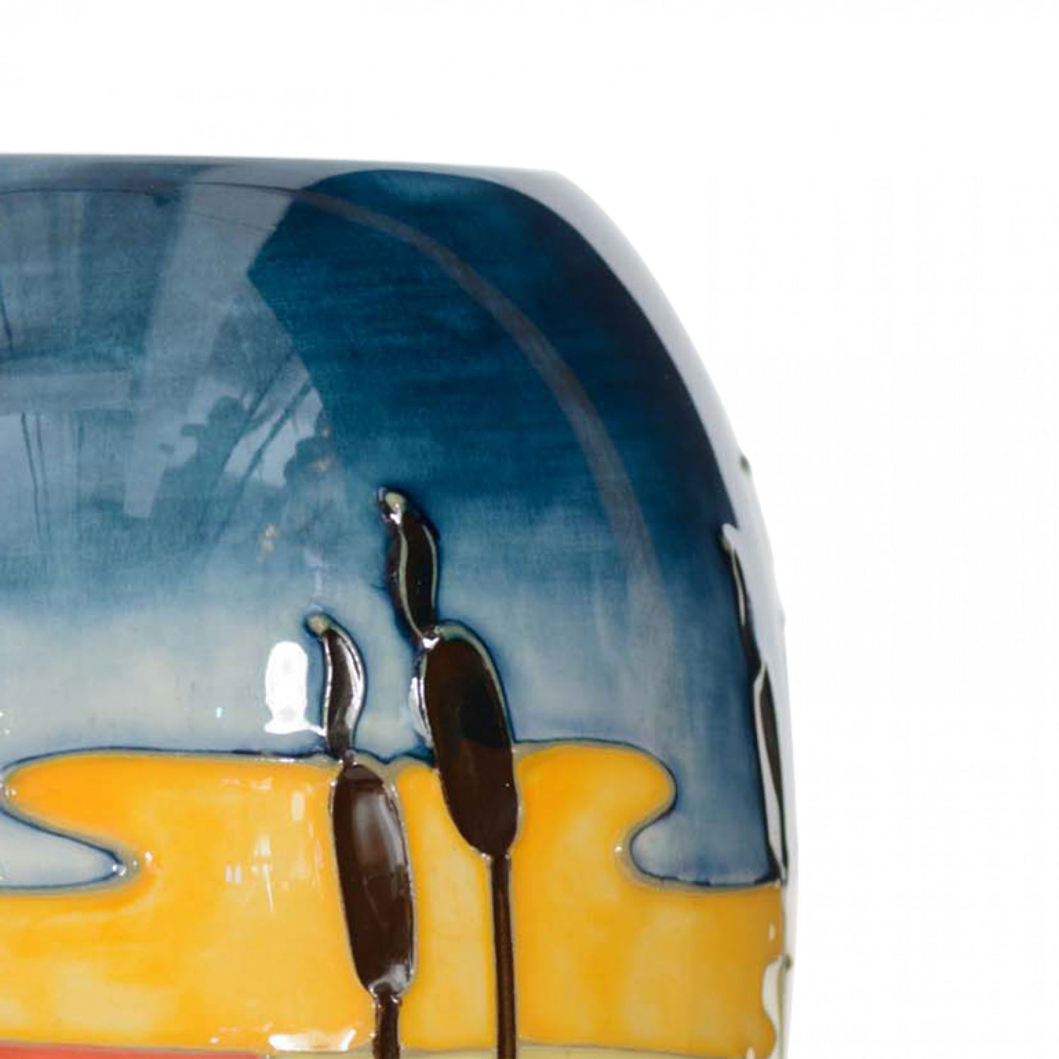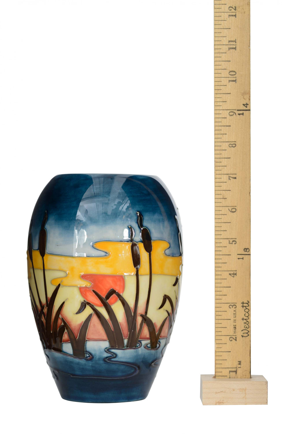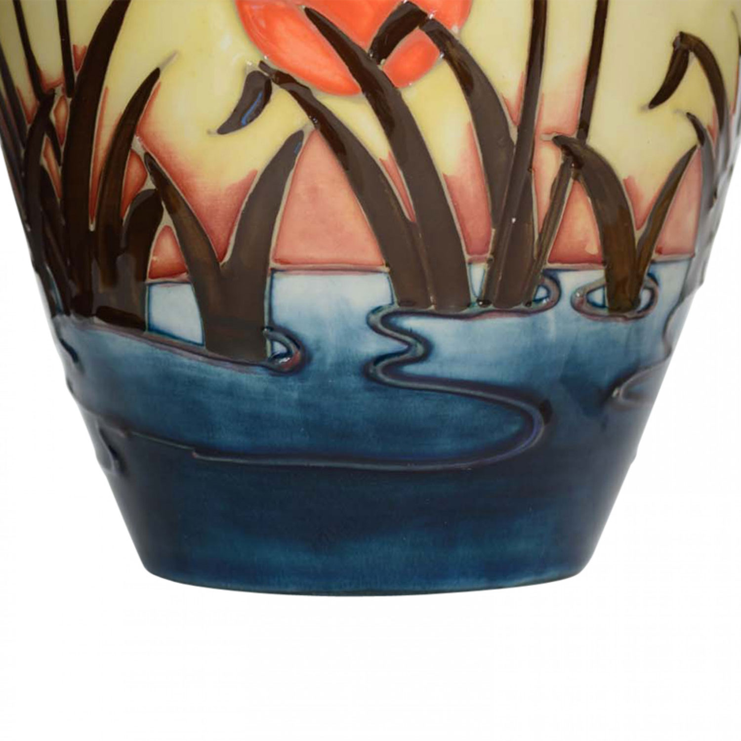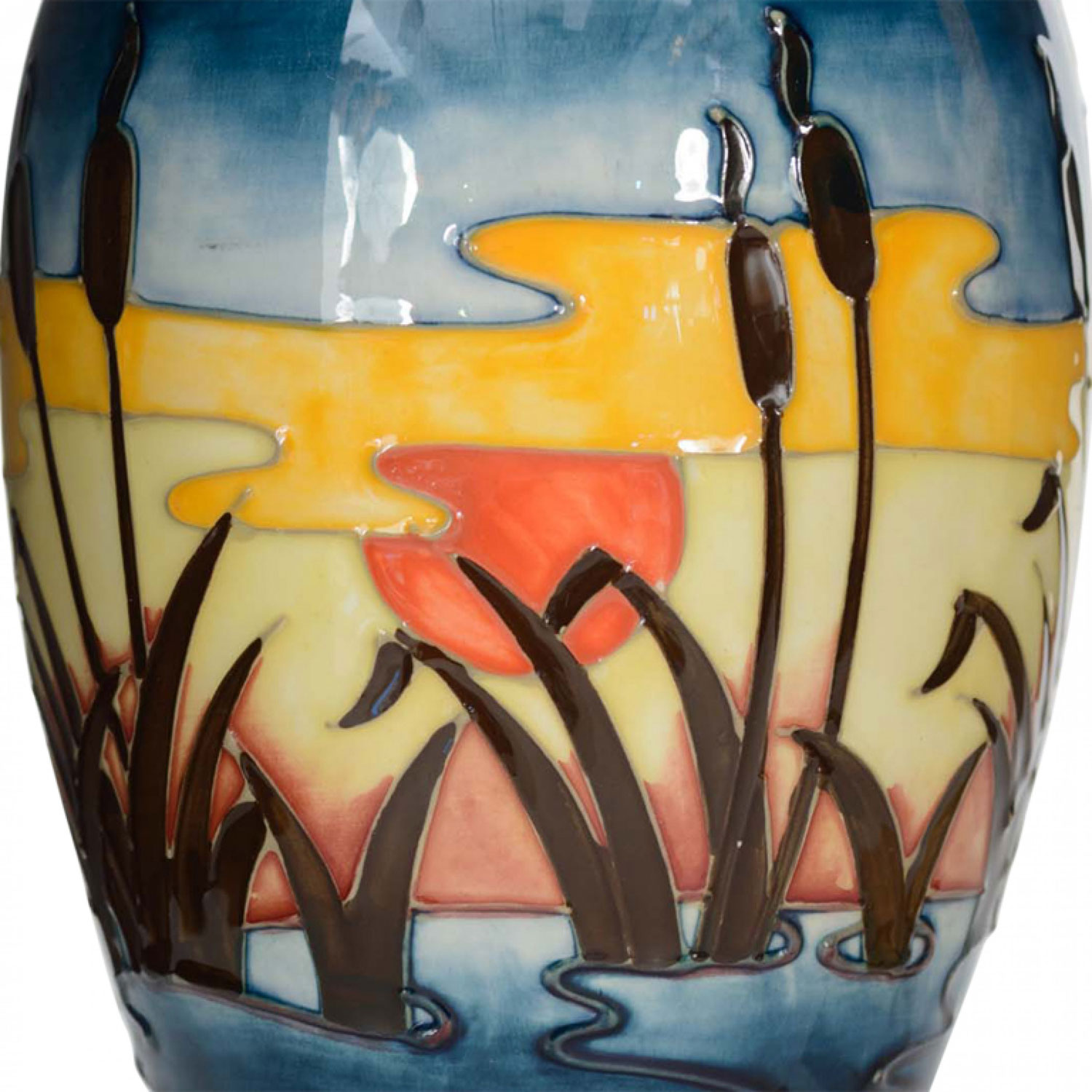 English multi-colored glazed ceramic vase with a raised and painted design featuring cattails in a pond in sunset “Irises And Bullrushes' Pattern” (signed: MOORCROFT with initials "WL" made in England)
