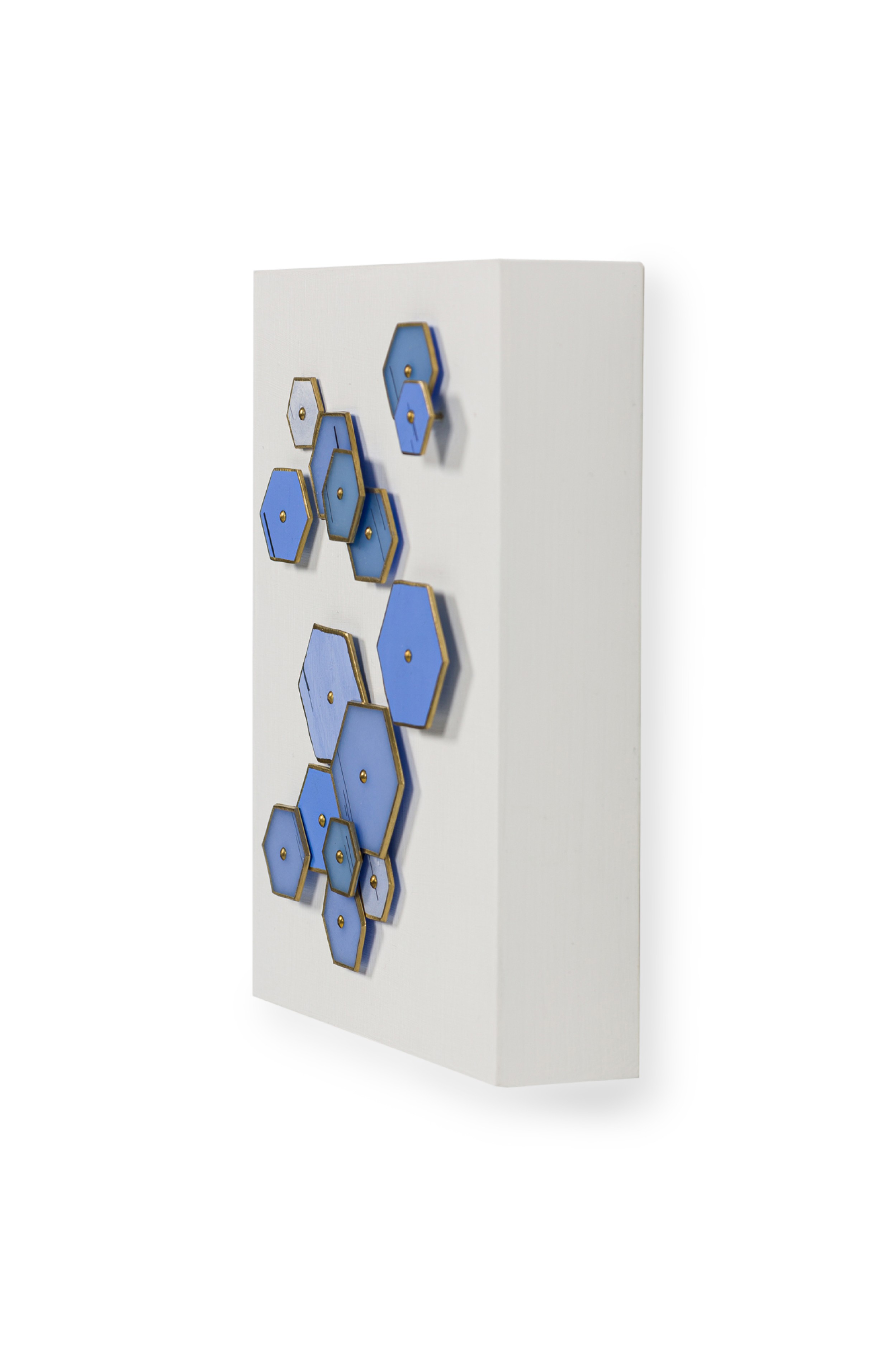 Contemporary mixed media rectangular wall sculpture of hand colored blue thermoplastic hexagonal shapes mounted to a white painted wooden panel (NATALE CREE ADGNOT).