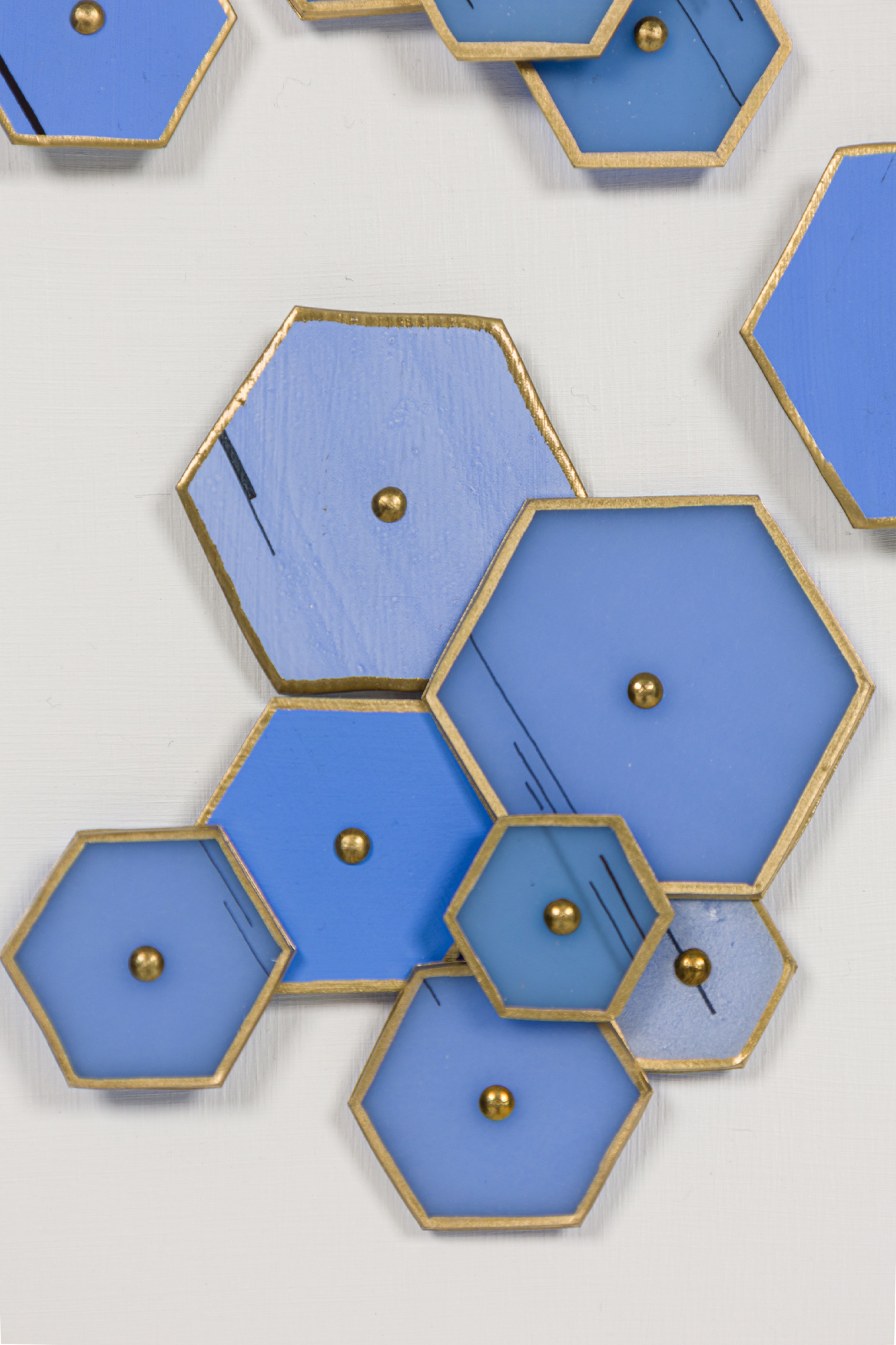 Contemporary mixed media rectangular wall sculpture of hand colored blue thermoplastic hexagonal shapes mounted to a white painted wooden panel (NATALE CREE ADGNOT)
