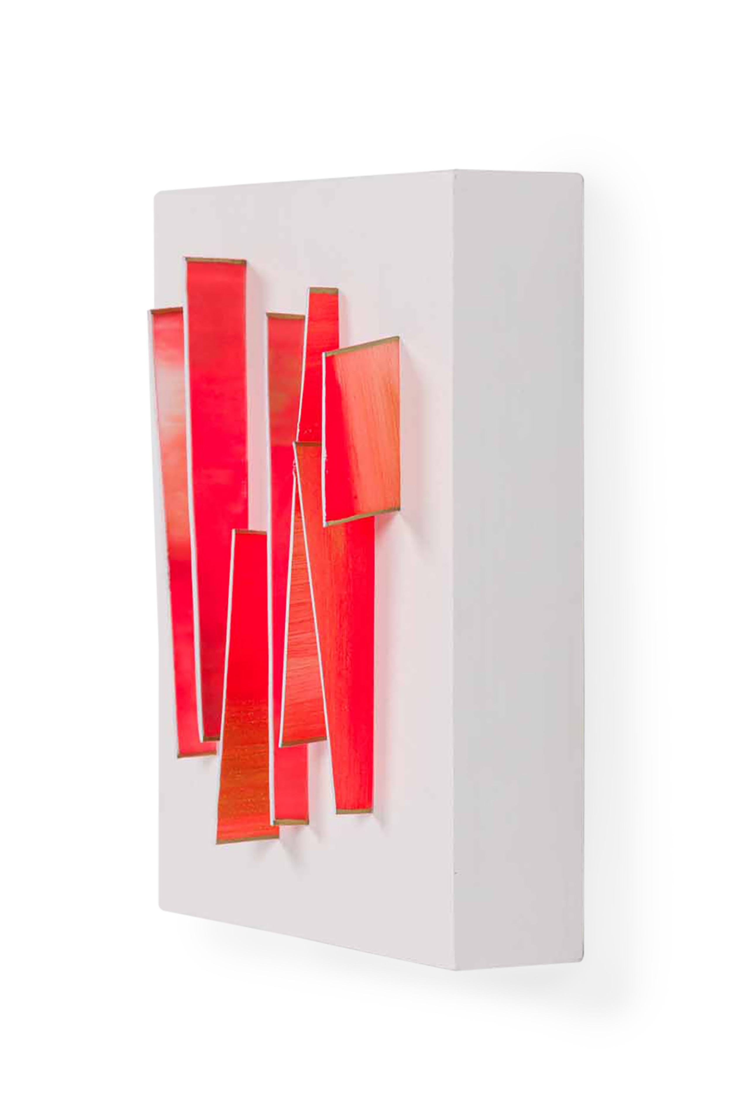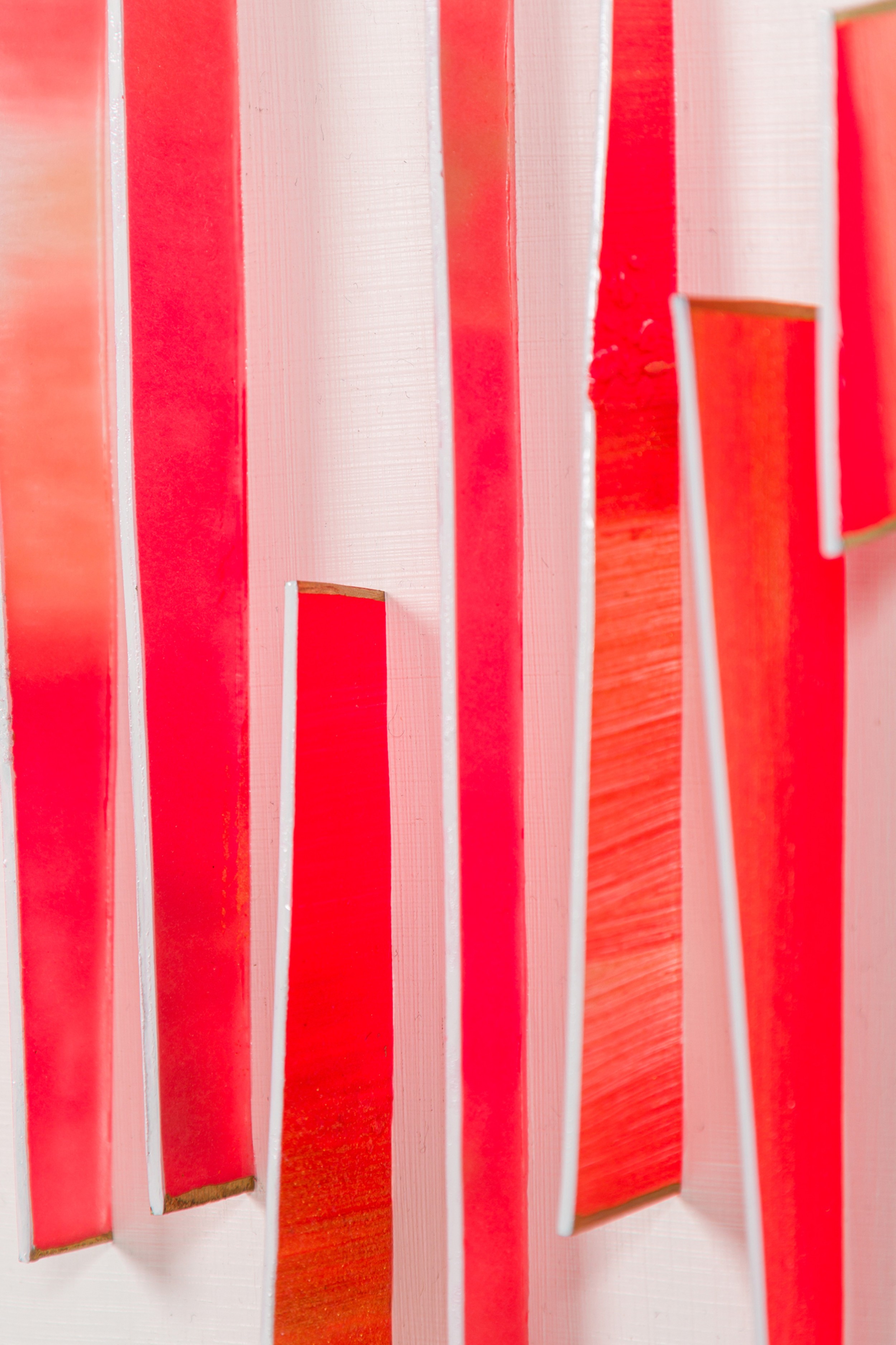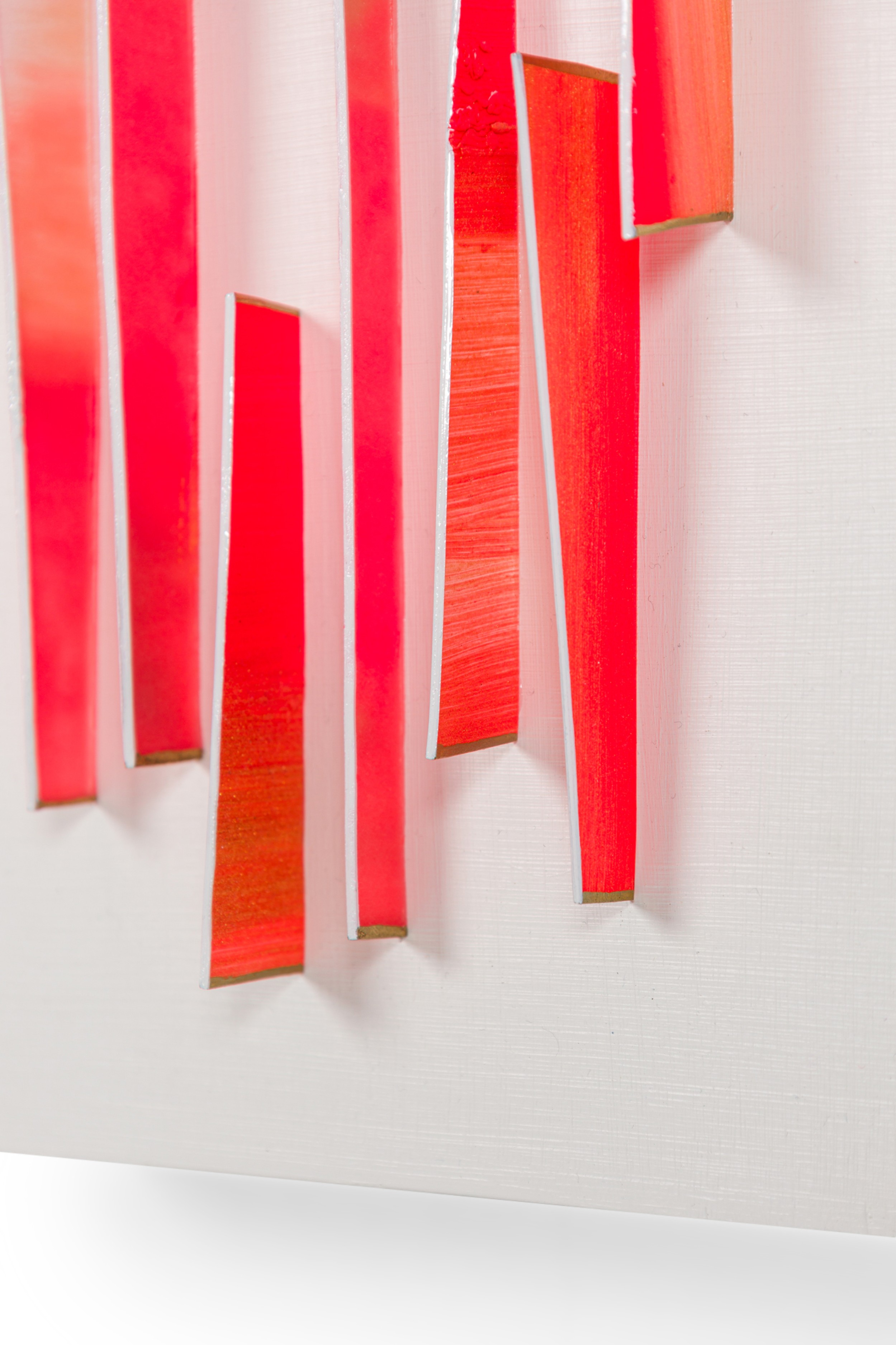 Contemporary mixed media rectangular wall sculpture of hand colored orange thermoplastic platesl mounted vertically to a white painted wooden panel (NATALE CREE ADGNOT)
