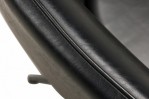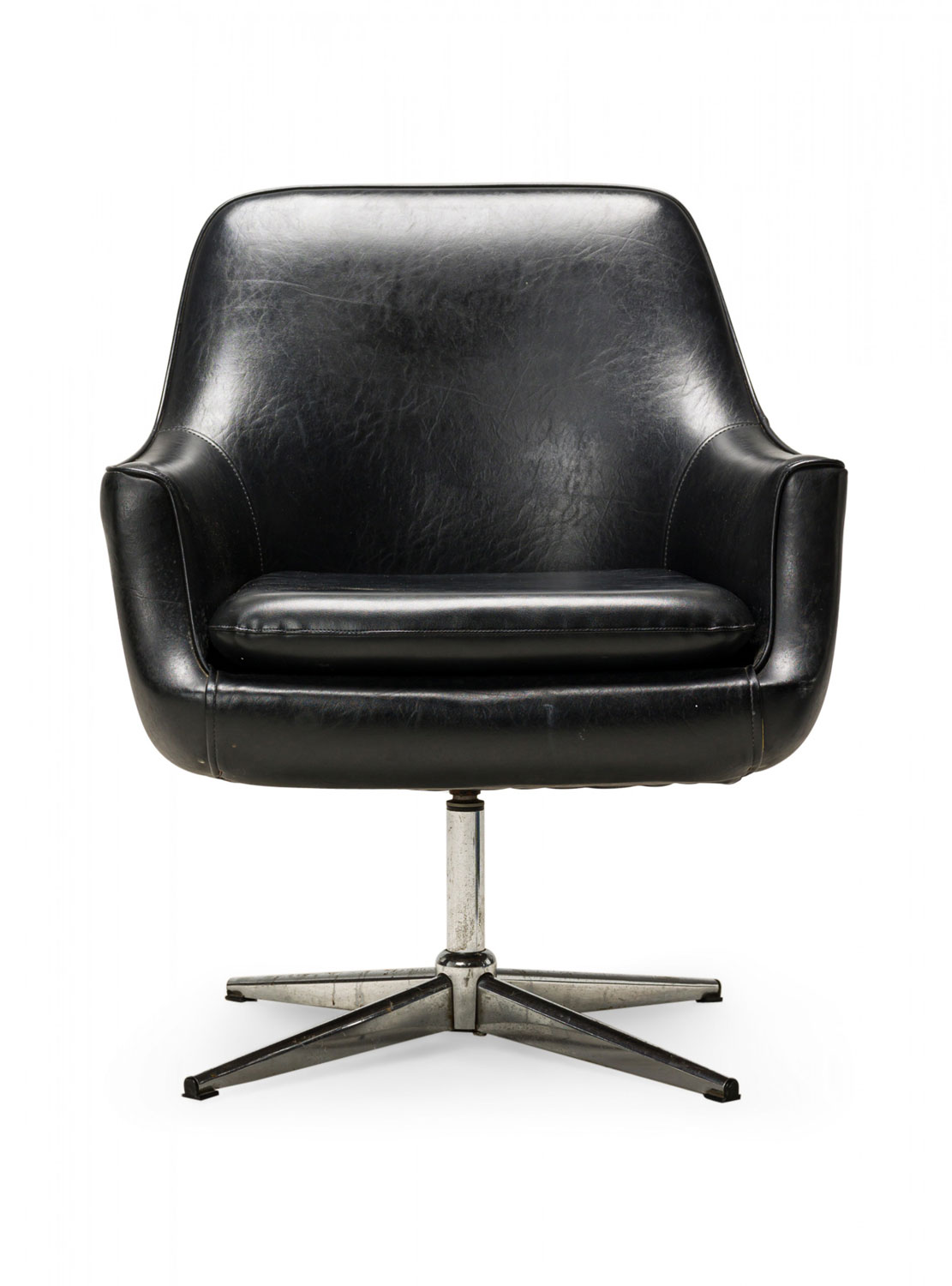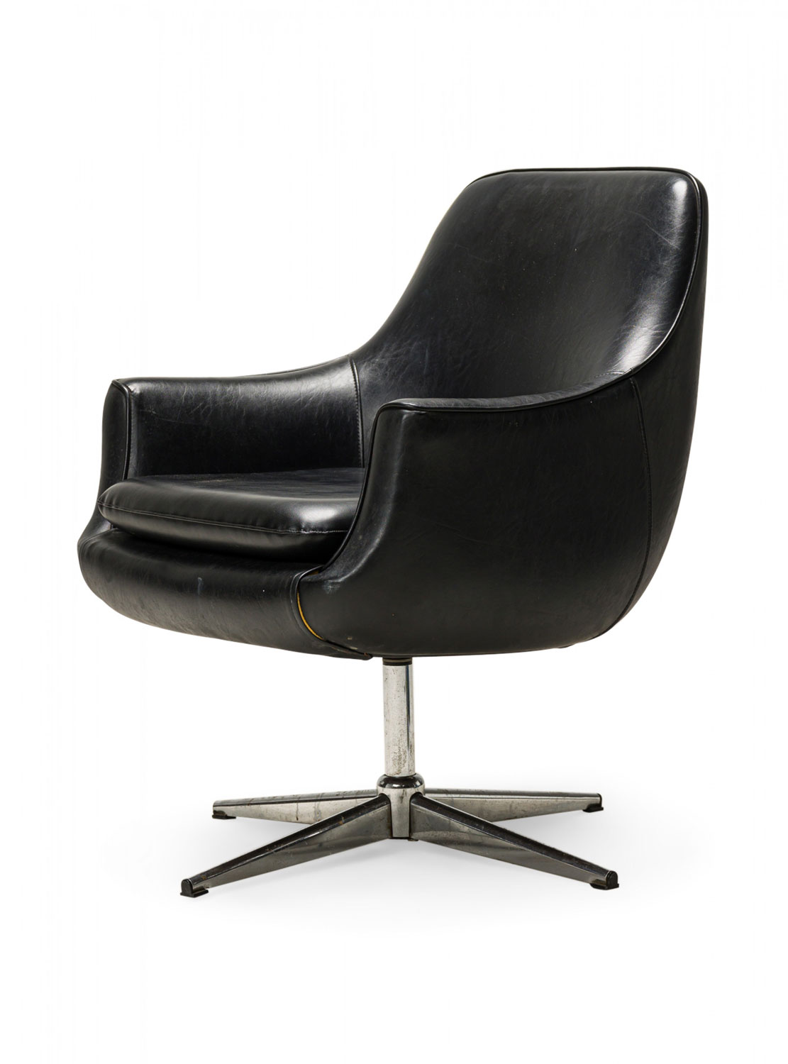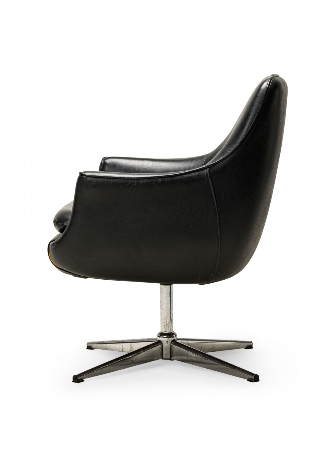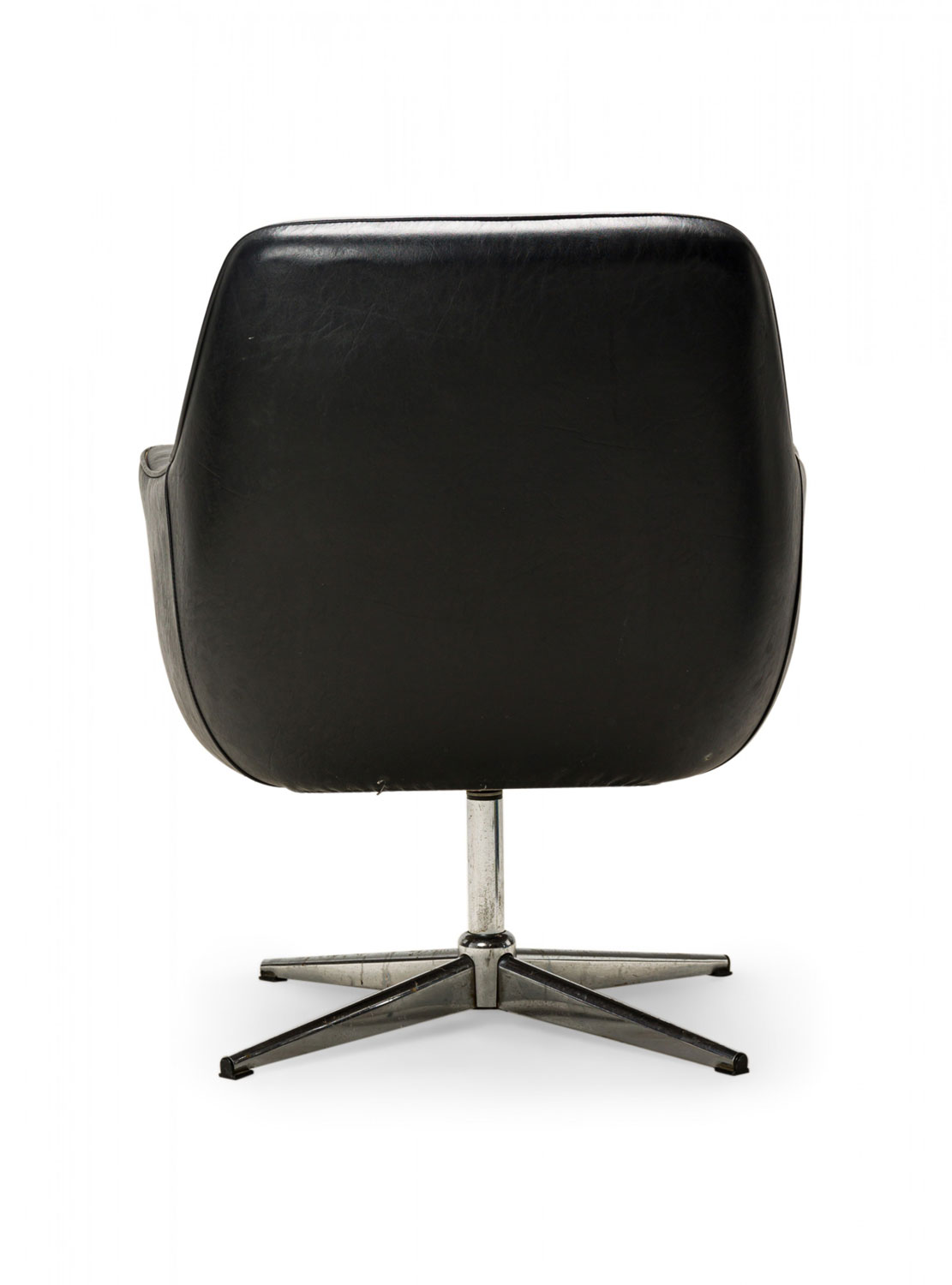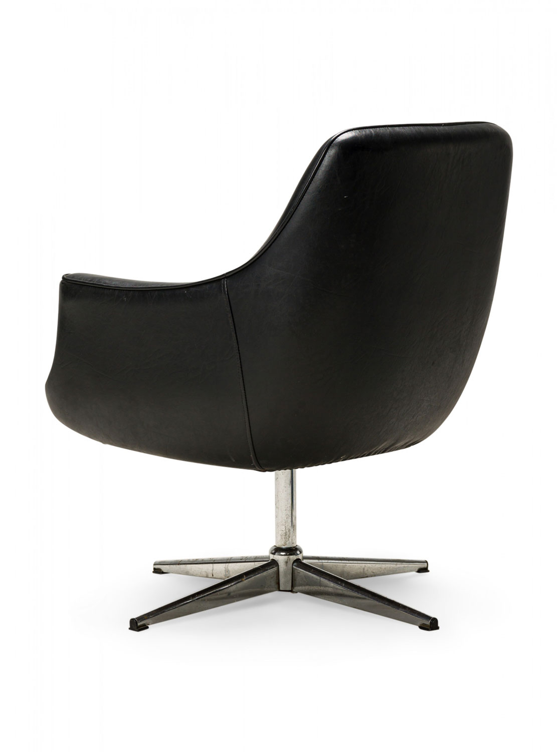 Swedish Mid-Century swivel armchair with black leather upholstery and seat cushion supported on a chrome pedestal base with five legs. (OVERMAN)