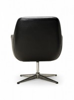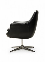 Swedish Mid-Century swivel armchair with black leather upholstery and seat cushion supported on a chrome pedestal base with five legs. (OVERMAN).