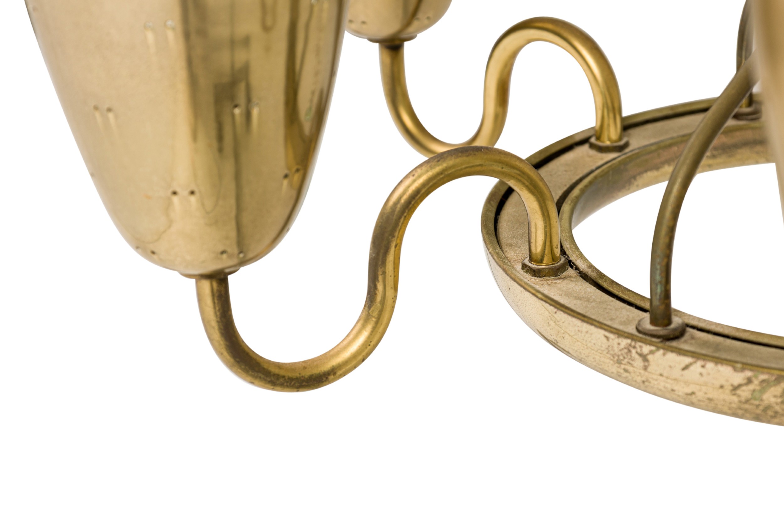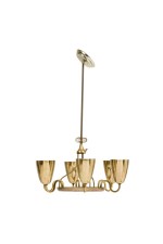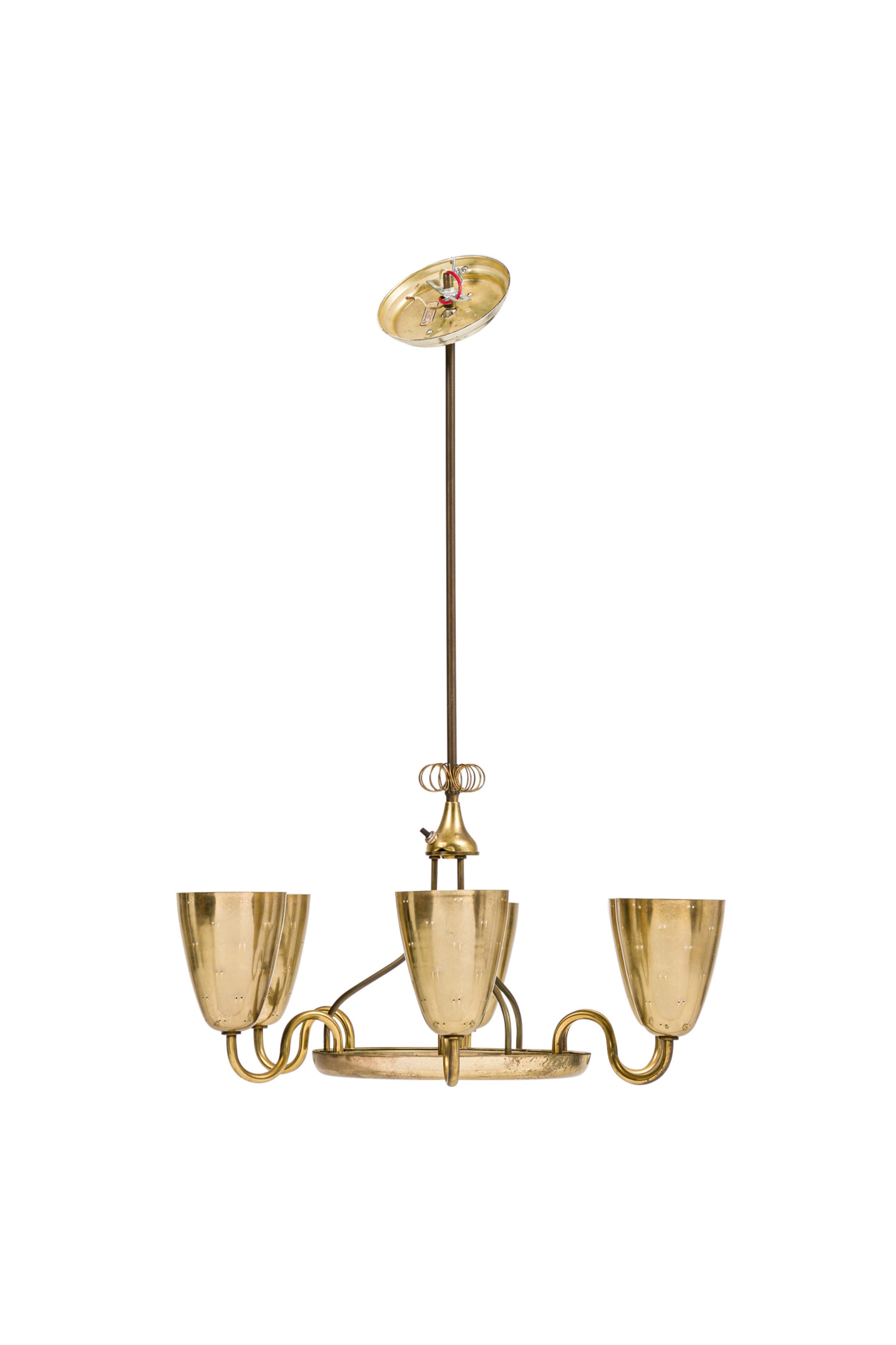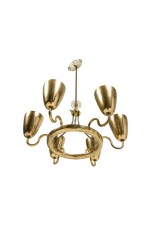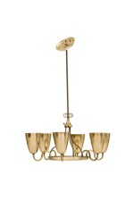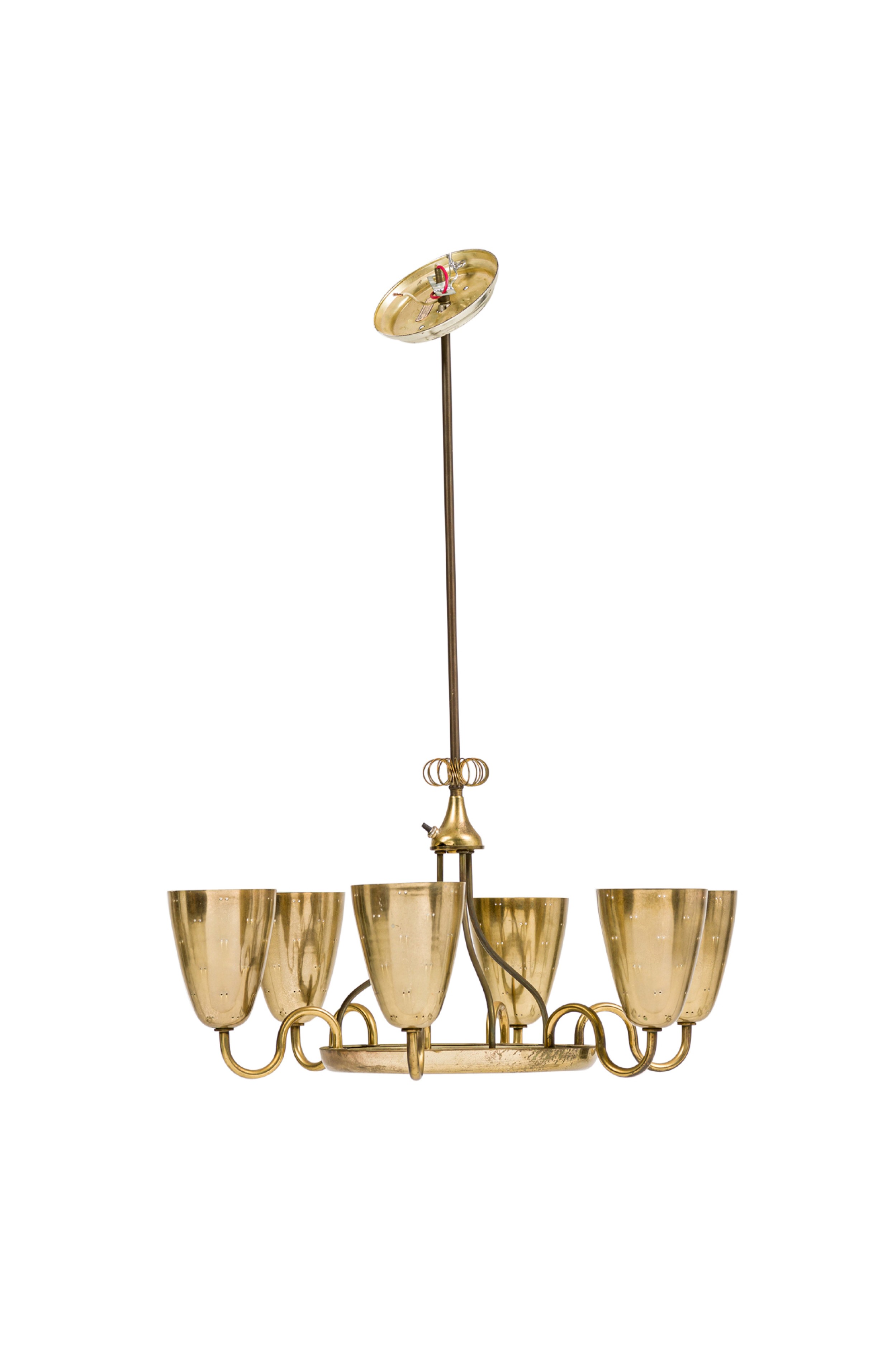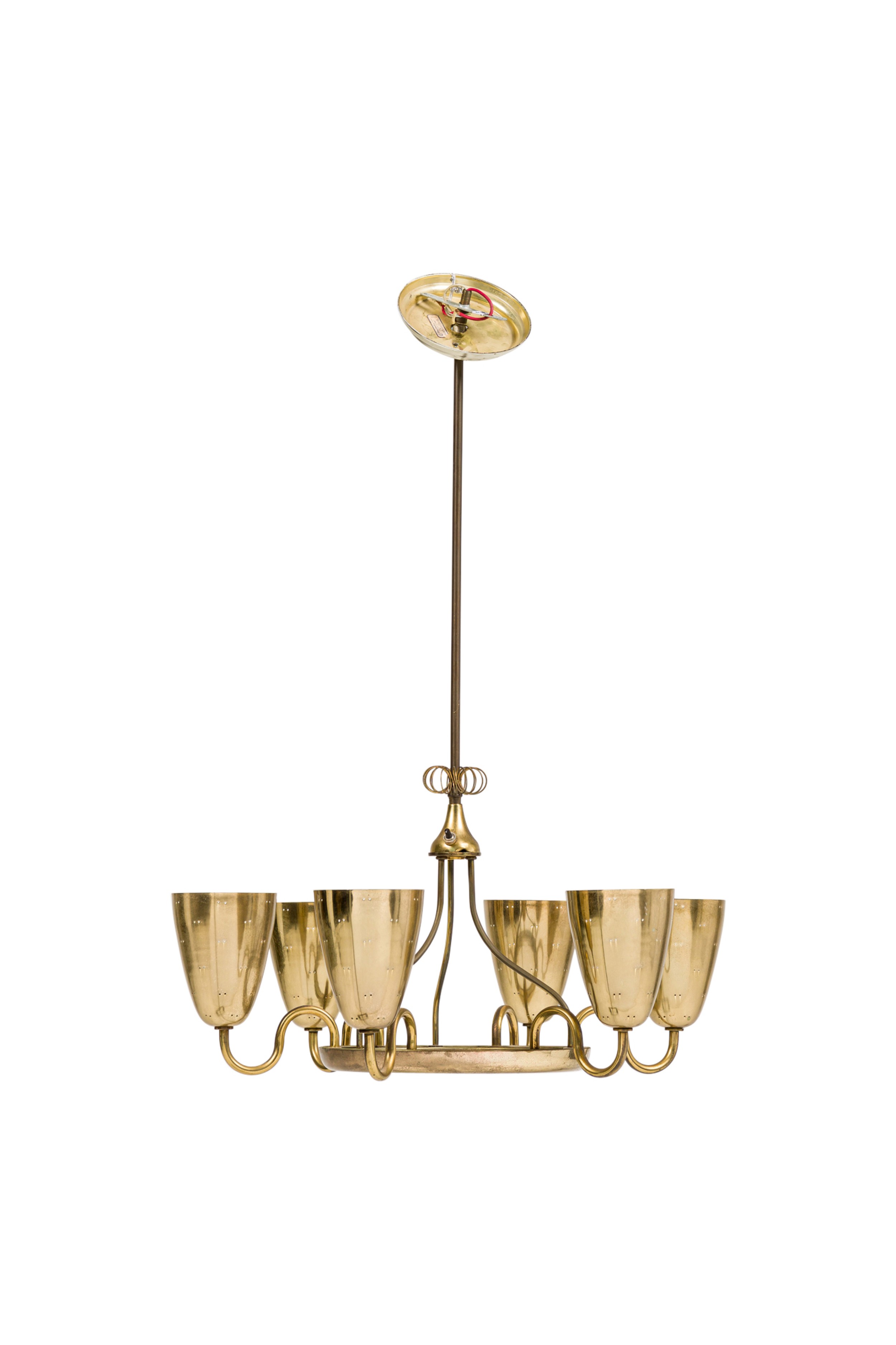 Finnish-Canadian Mid-Century 6-arm 'Ballerina' chandelier with polished brass and perforated cups connected to a center base with curved brass arms (PAAVO TYNELL for LIGHTOLIER).