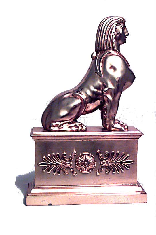 PAIR of French Empire-style (19/20th Century) bronze sphinx andirons on rectangular base (PRICED AS PAIR).