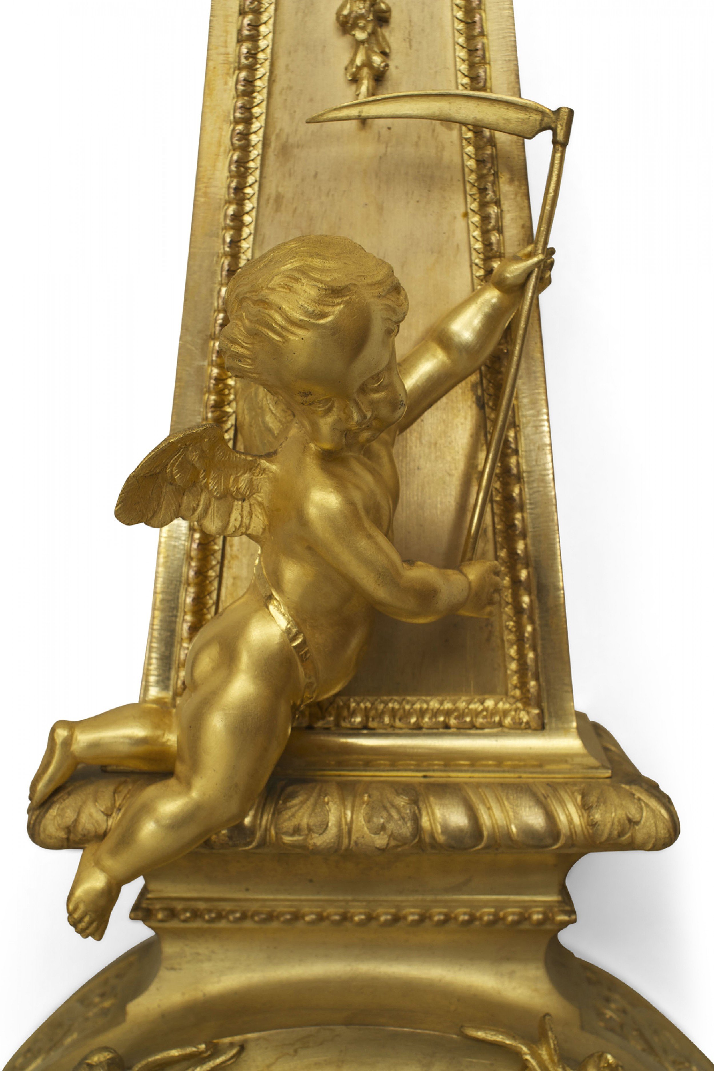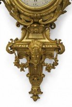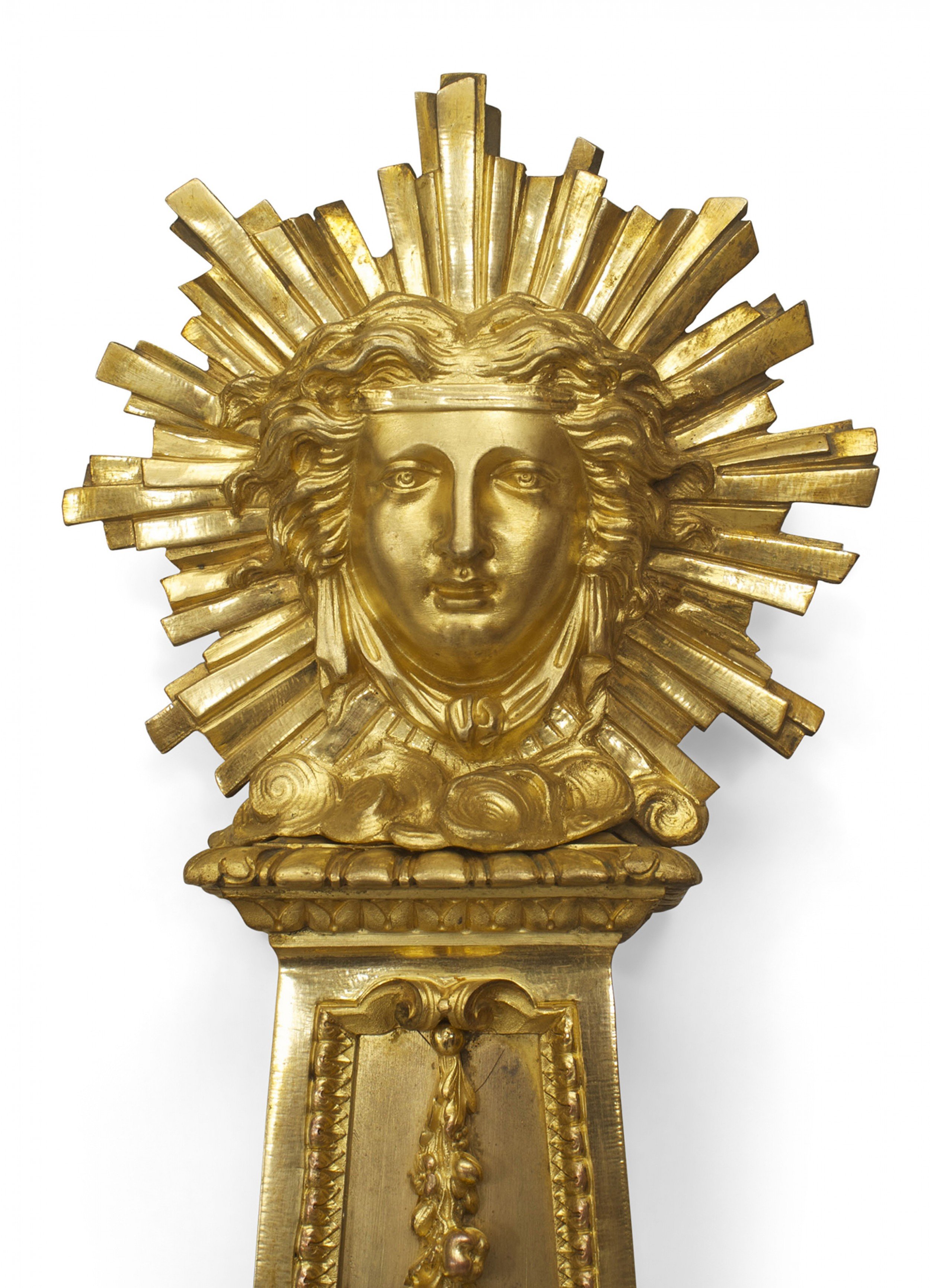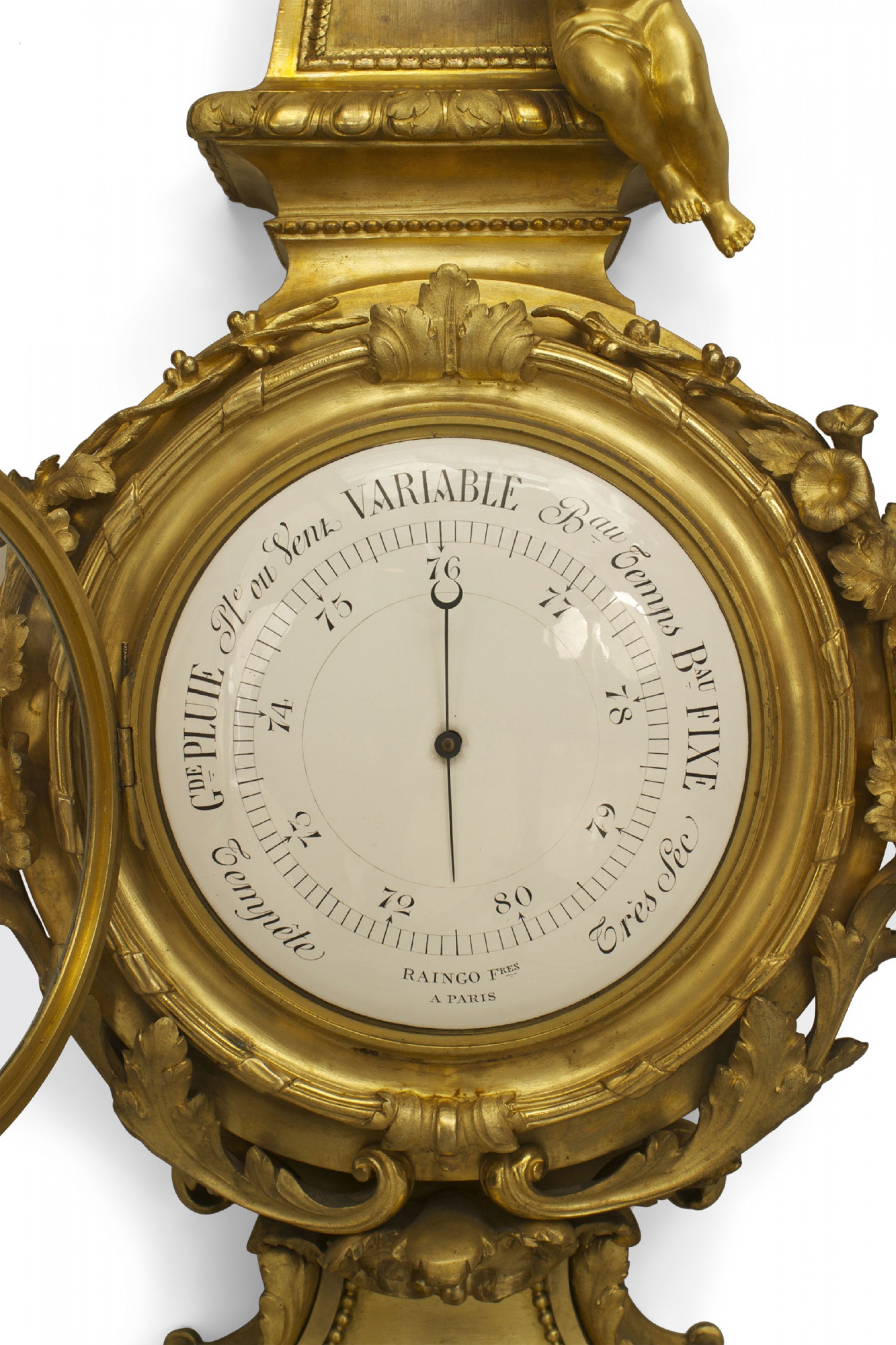 PAIR of French Louis XVI-style (Mid-19th Century) ormolu wall clock and barometer set each of banjo form with Apollo mask above putti and circular dial over bearded mask (Signed RAINGO FRERES/A Paris) (PRICED AS PAIR) (Not working).