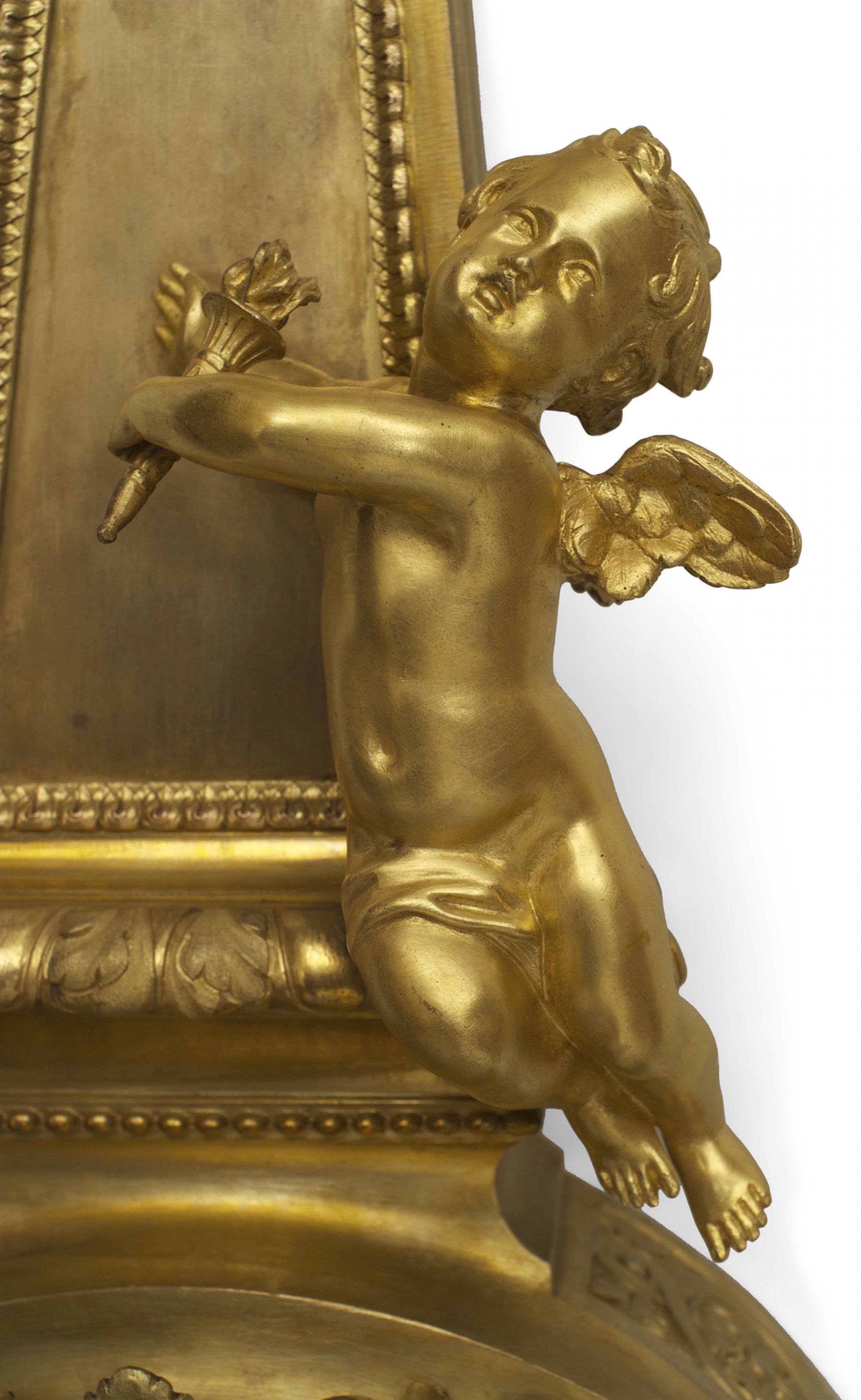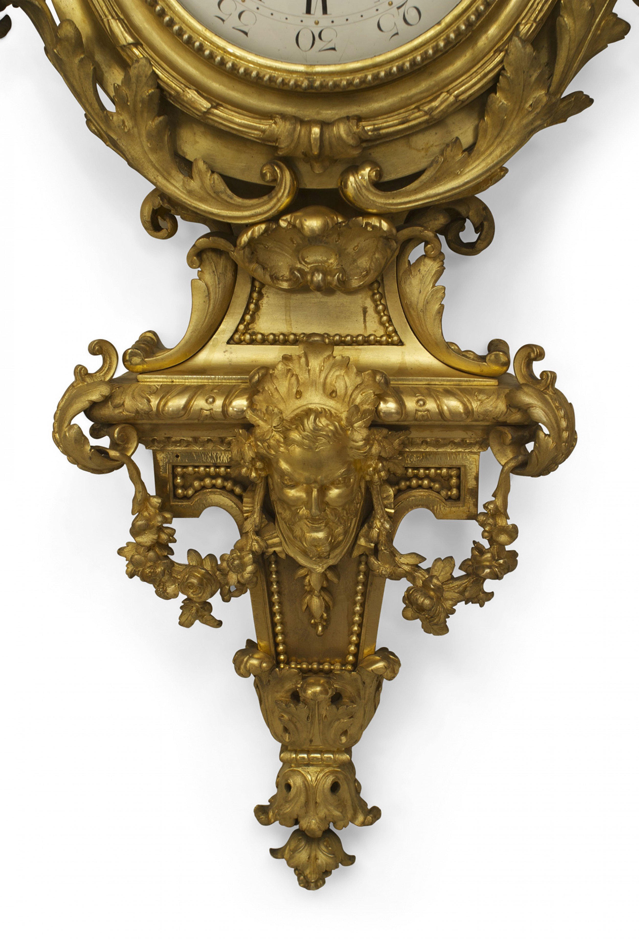 PAIR of French Louis XVI-style (Mid-19th Century) ormolu wall clock and barometer set each of banjo form with Apollo mask above putti and circular dial over bearded mask (Signed RAINGO FRERES/A Paris) (PRICED AS PAIR) (Not working)