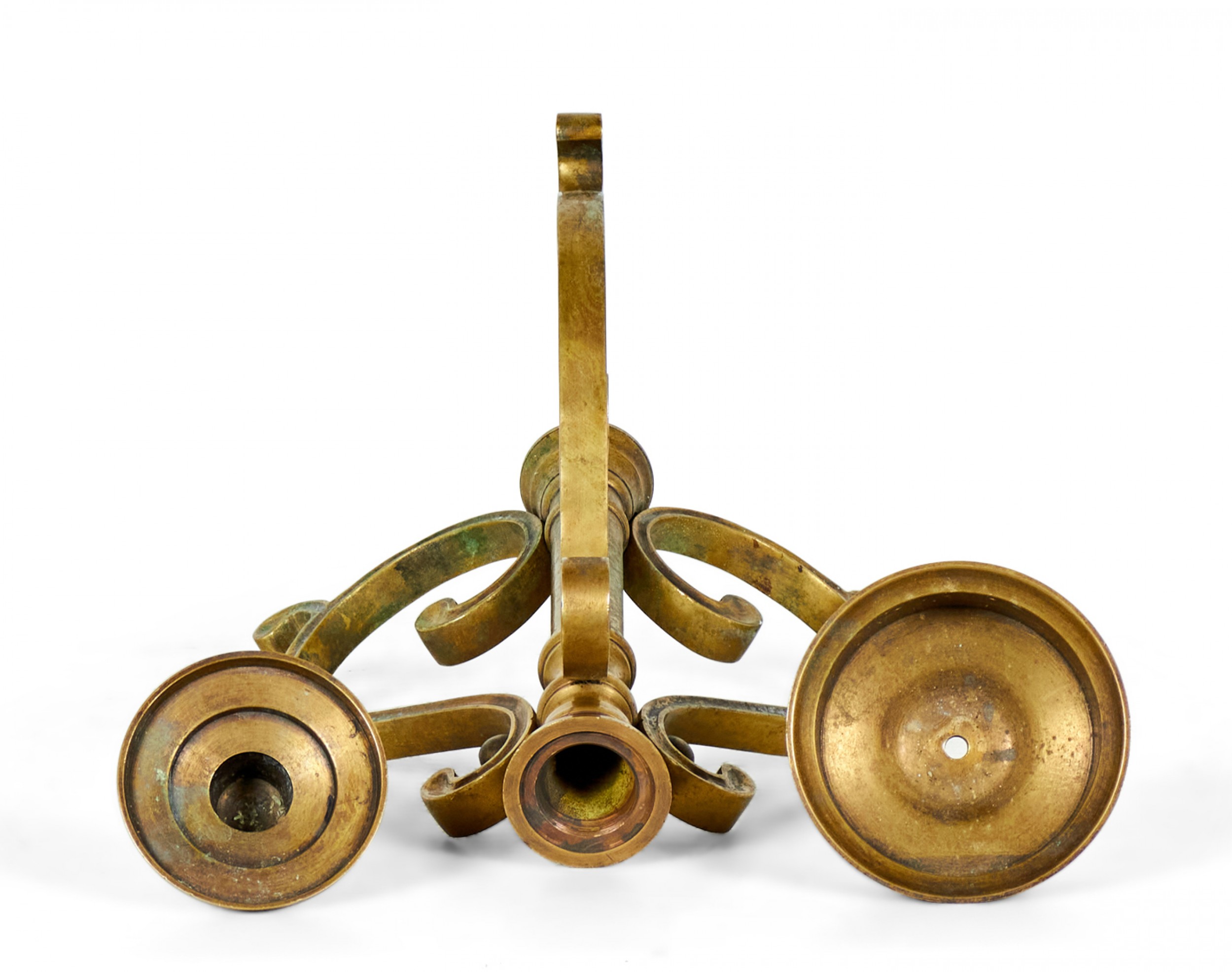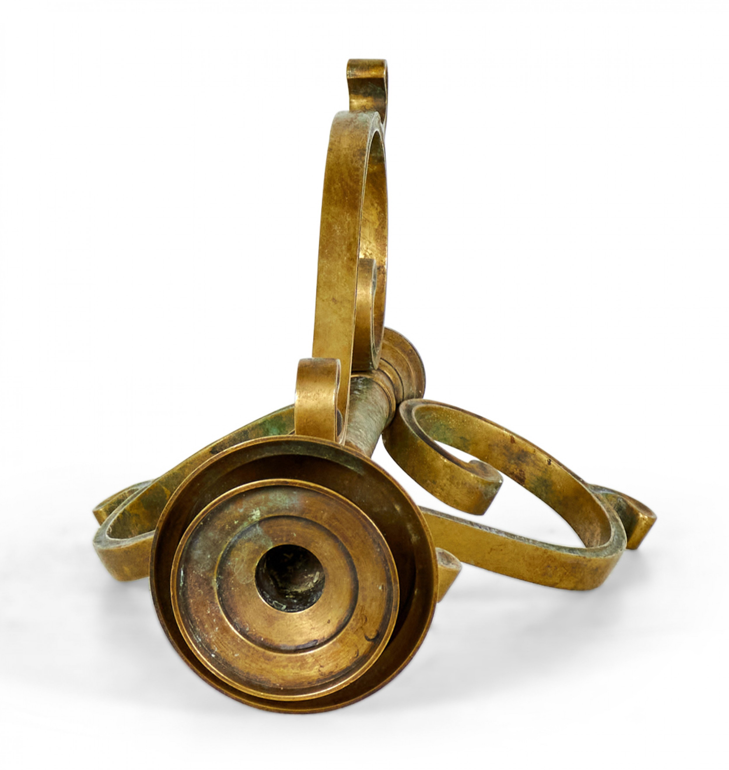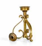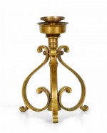 PAIR of American Art Deco-style bronze candlesticks with three scroll design legs supporting a central pillar topped with a holder for a single taper candle. (PRICED AS PAIR)