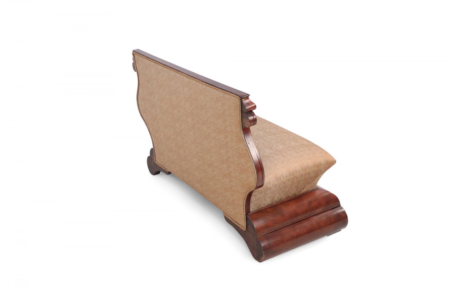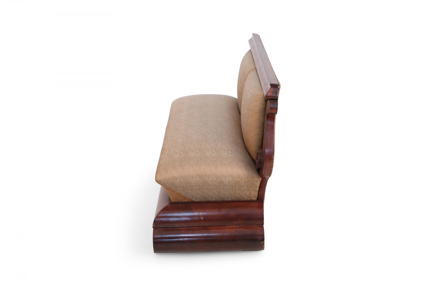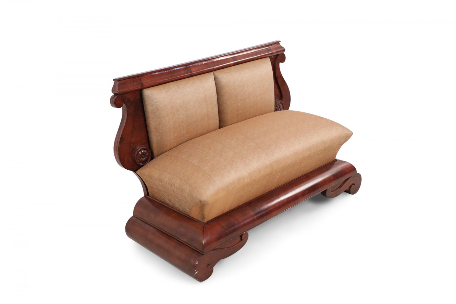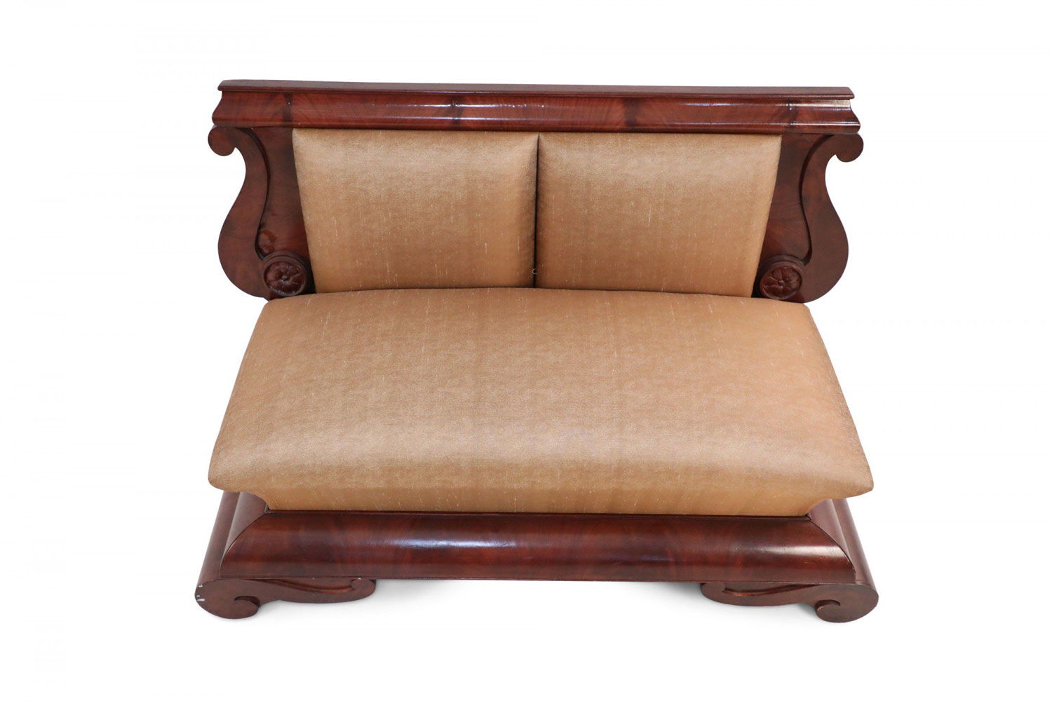 PAIR of American Empire (circa 1840) window seats with crotch mahogany veneer frames, lyre-shaped backs, and beige satin upholstered seat & back resting on large tiered base. (PRICED AS PAIR)
