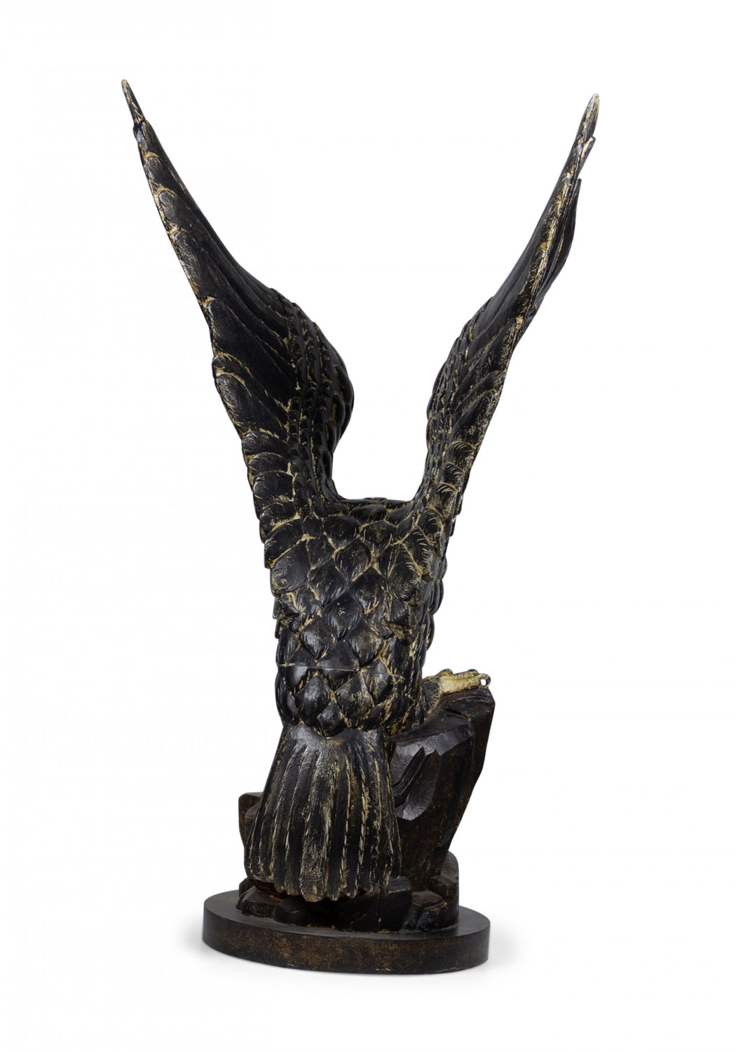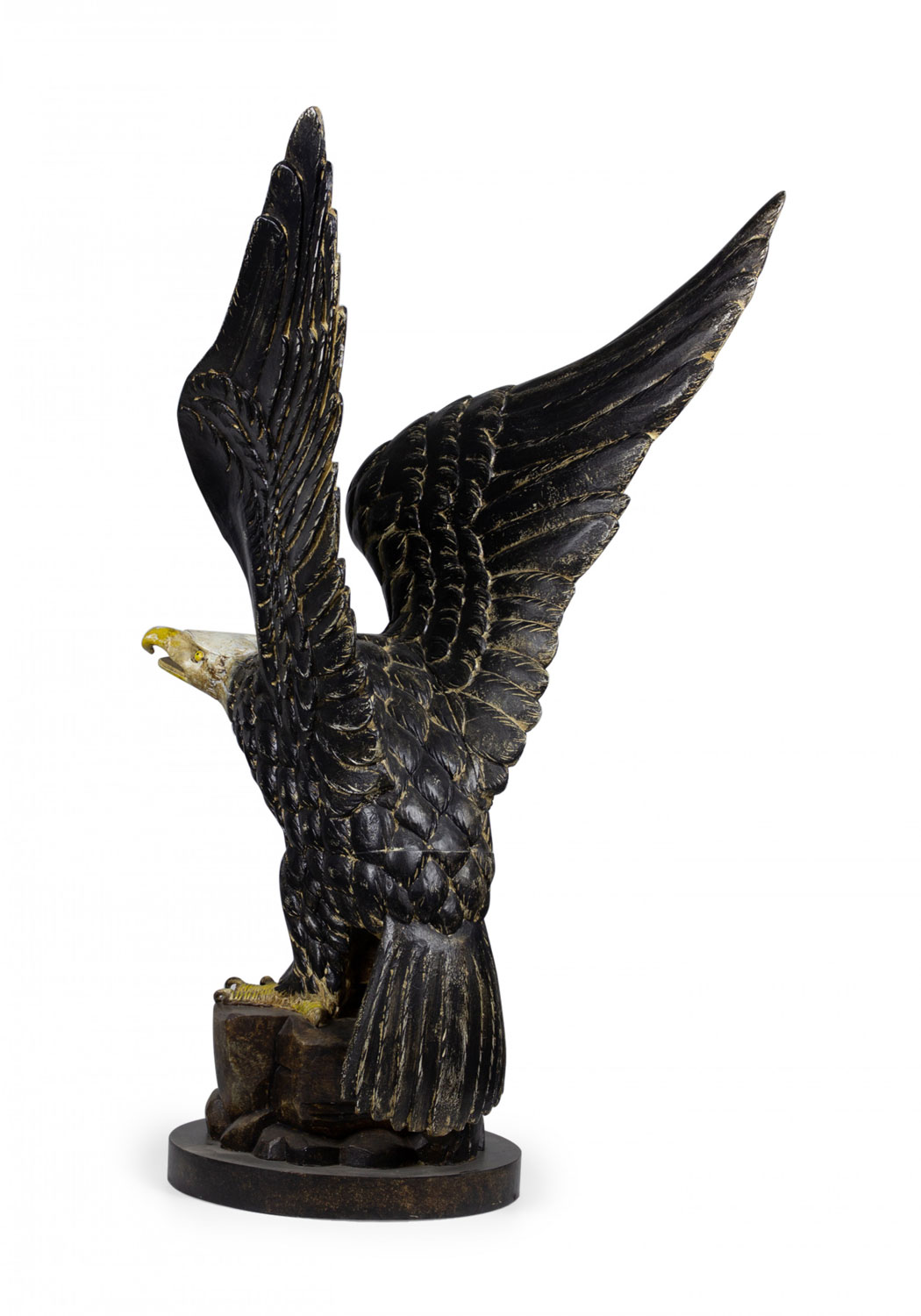 PAIR of American Federal-style carved sculptural bald eagles with wings outstretched perching on a log base with a painted brown and white finish. (PRICED AS PAIR)(Similar eagles with different finish: NWL2662).