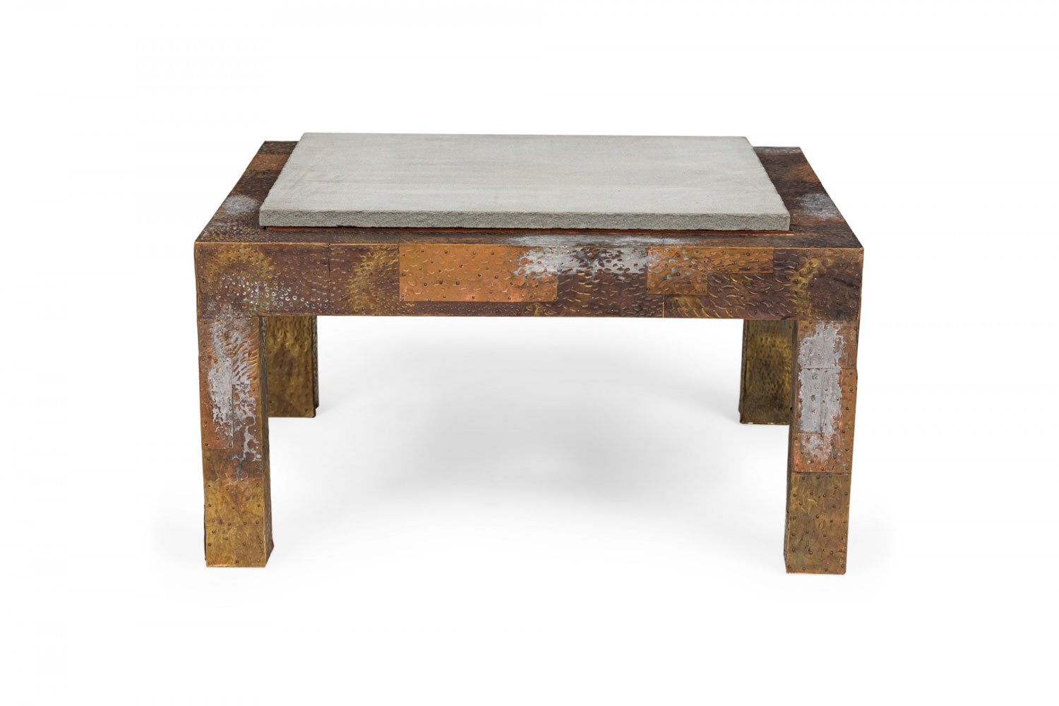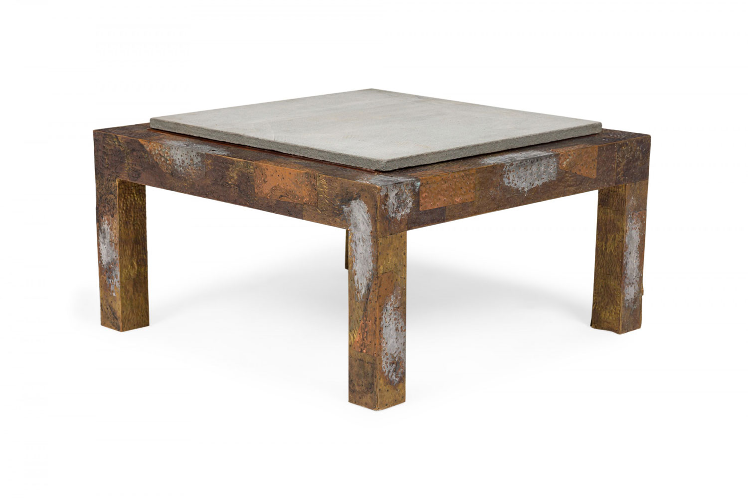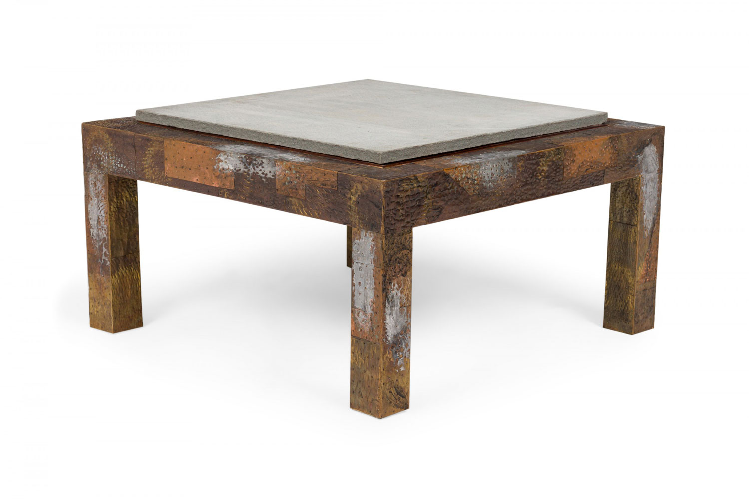 PAIR of American Mid-Century square coffee / cocktail tables with textured metal clad frames and pronounced light gray slate tops. (manner of PAUL EVANS)(PRICED AS PAIR).