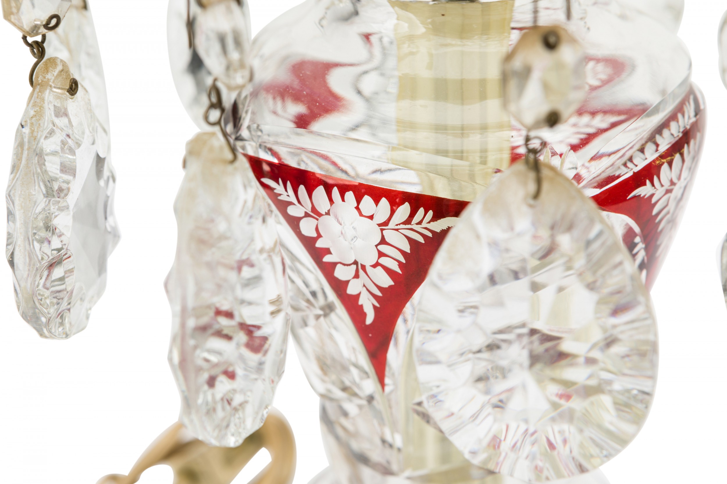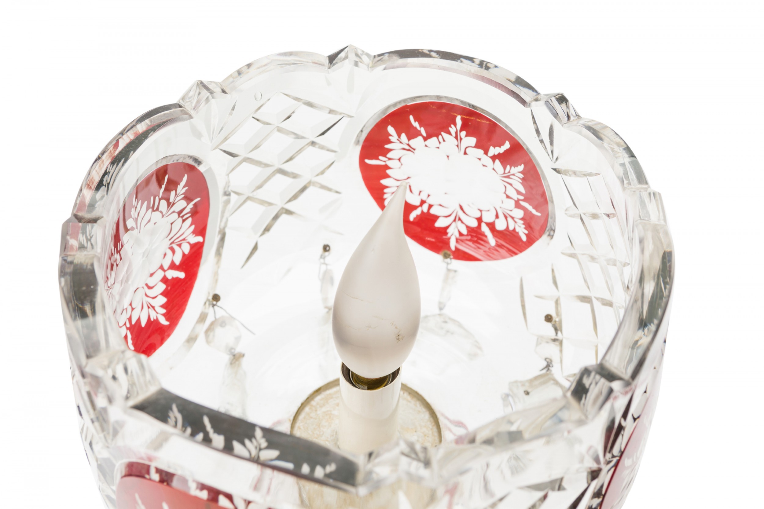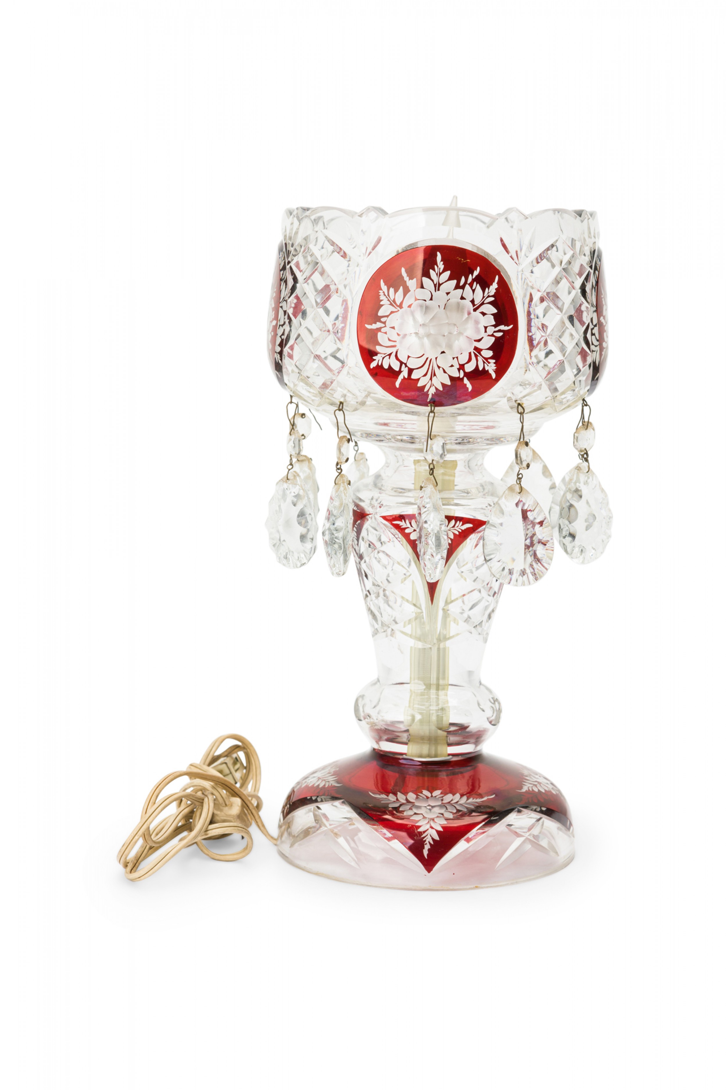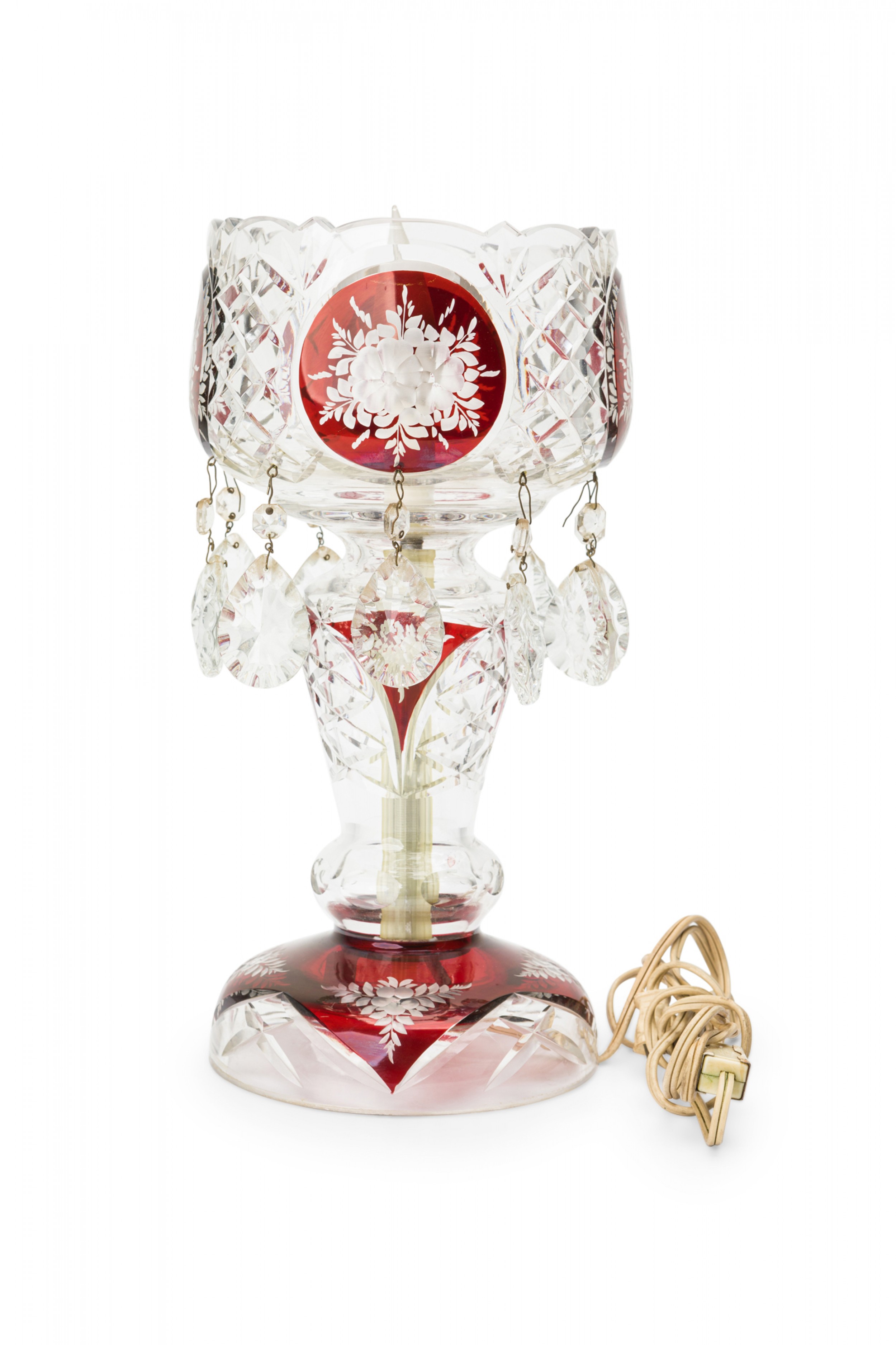 PAIR of American Victorian luster style table lamps with cut crystal open top upper shades with red glass medallions centering a frosted floral design supporting hanging crystal pendants over a shaped crystal column and circular red glass feet with additional floral designs. (PRICED AS PAIR)