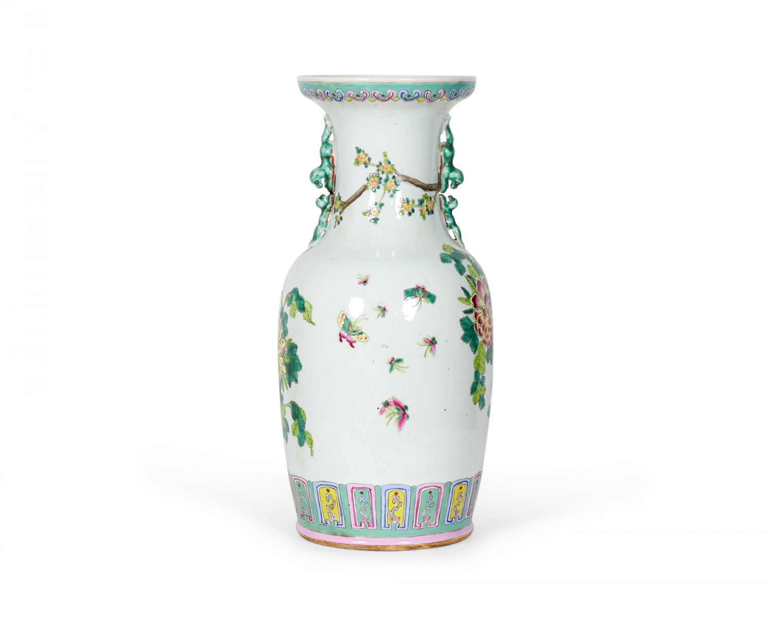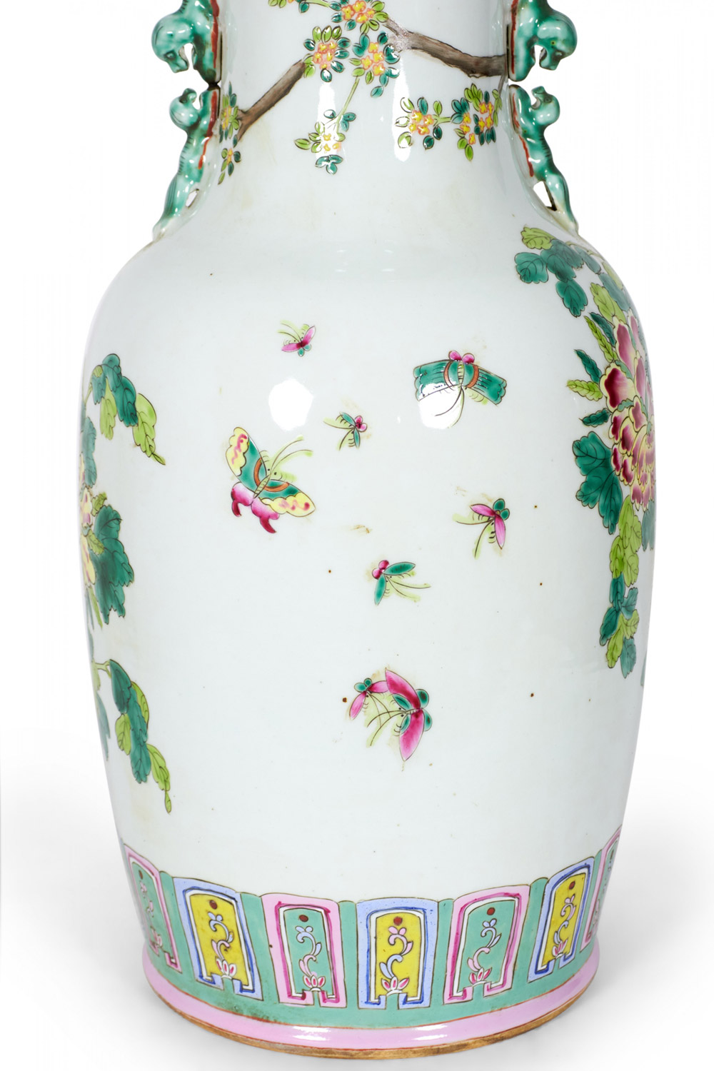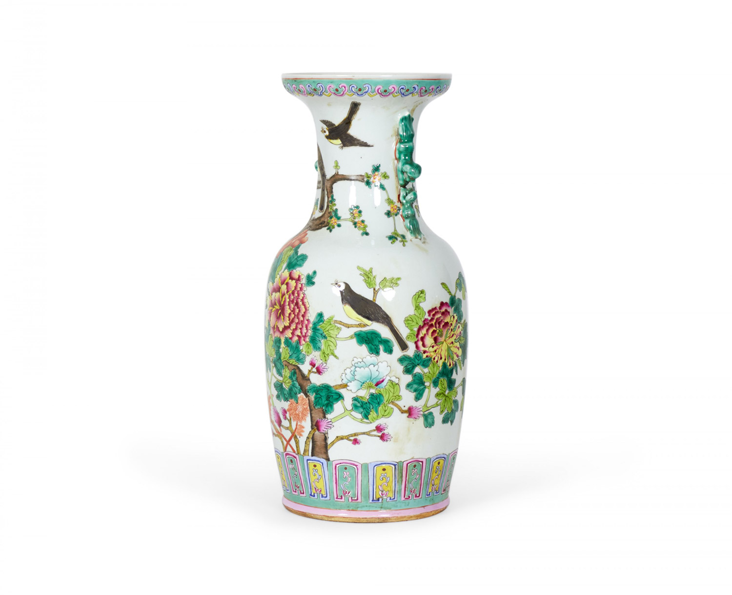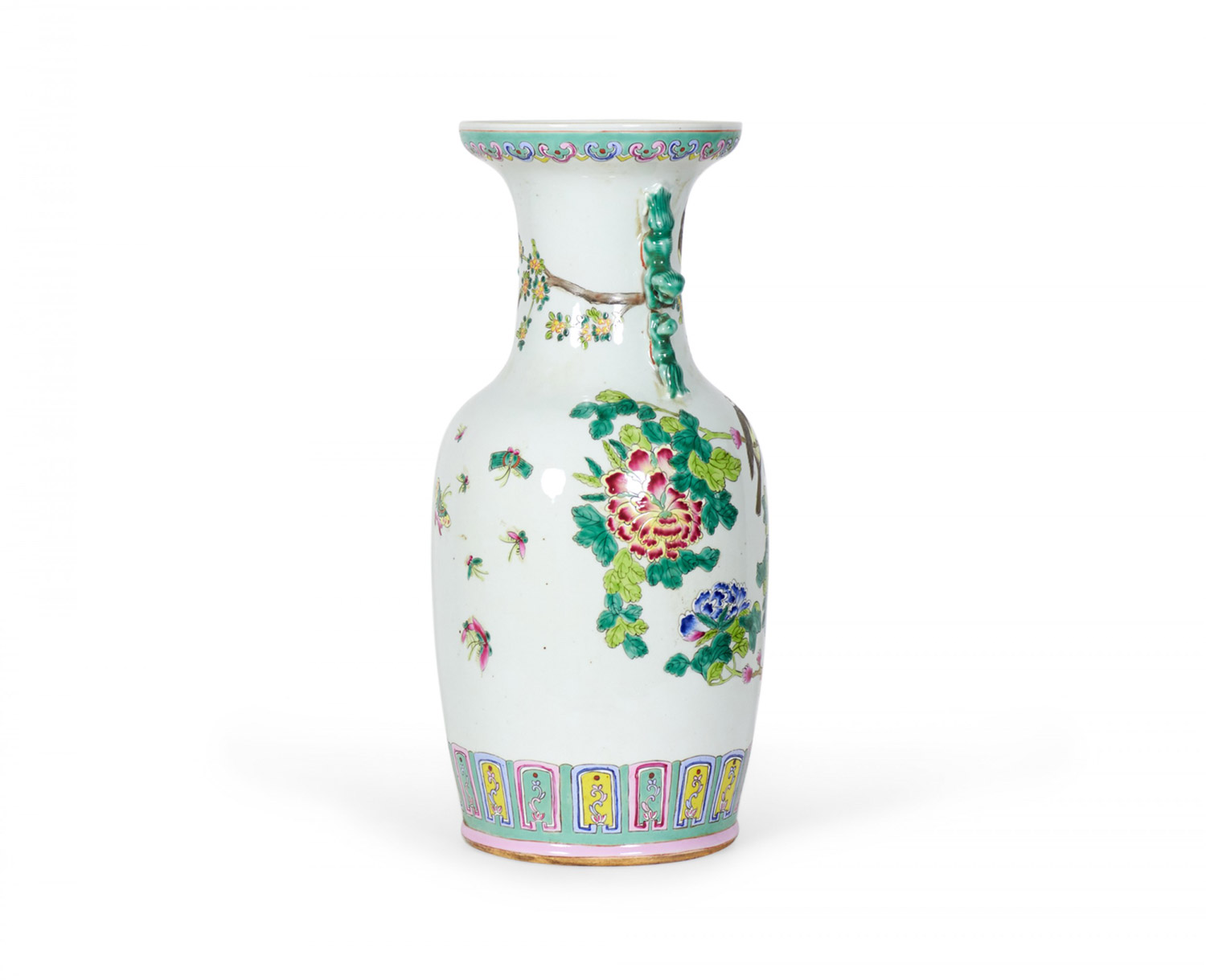 PAIR of Antique Chinese (late 19th-early 20th Century) porcelain rouleau-form vases with a pattern featuring sprawling tree branches and foliage in greens, pinks, and browns, and birds in flight against a beige background. (PRICED AS PAIR)
