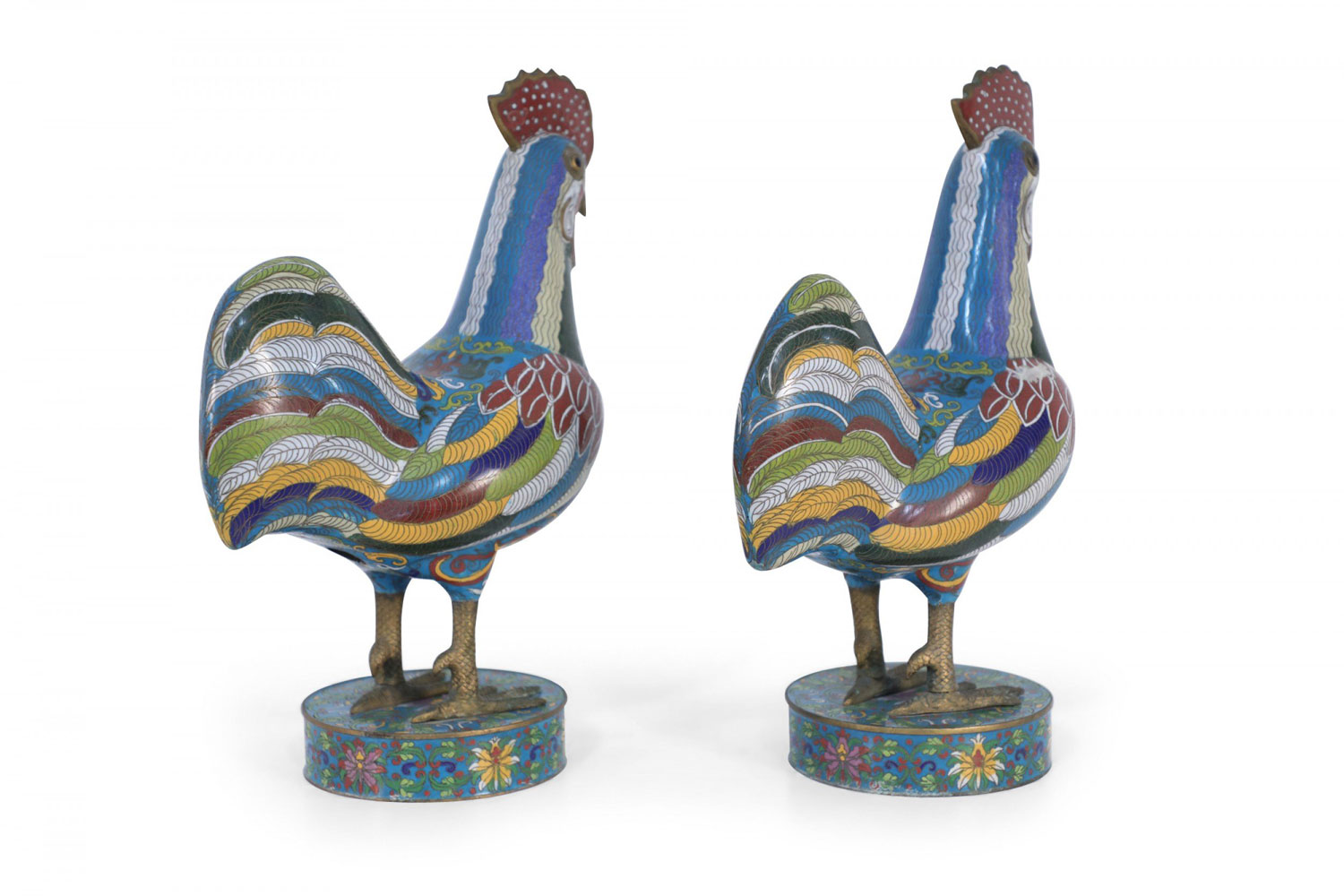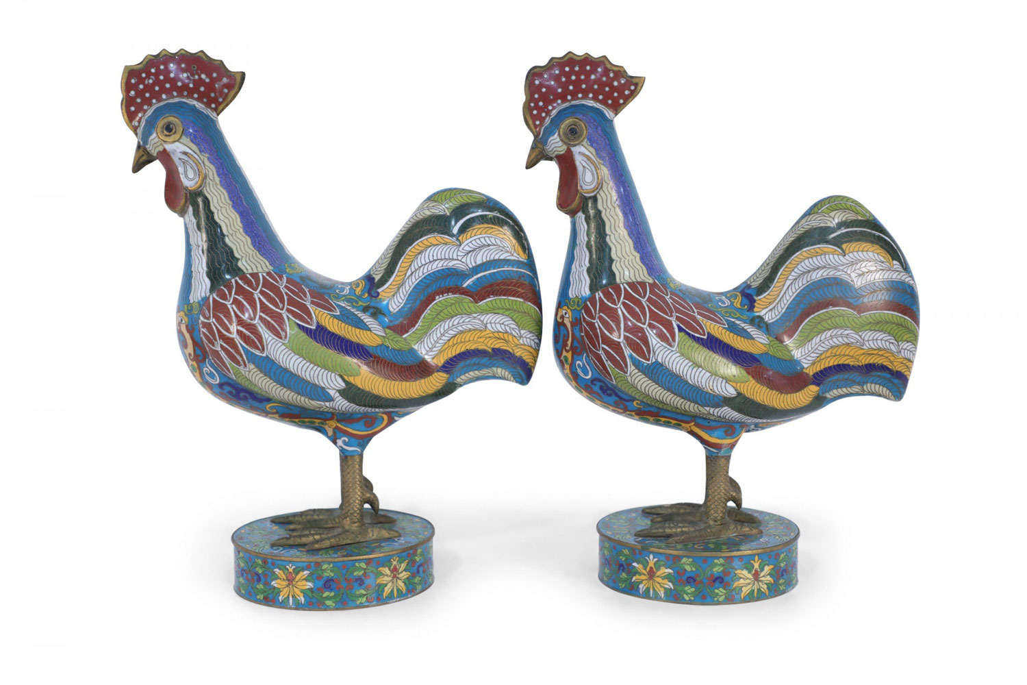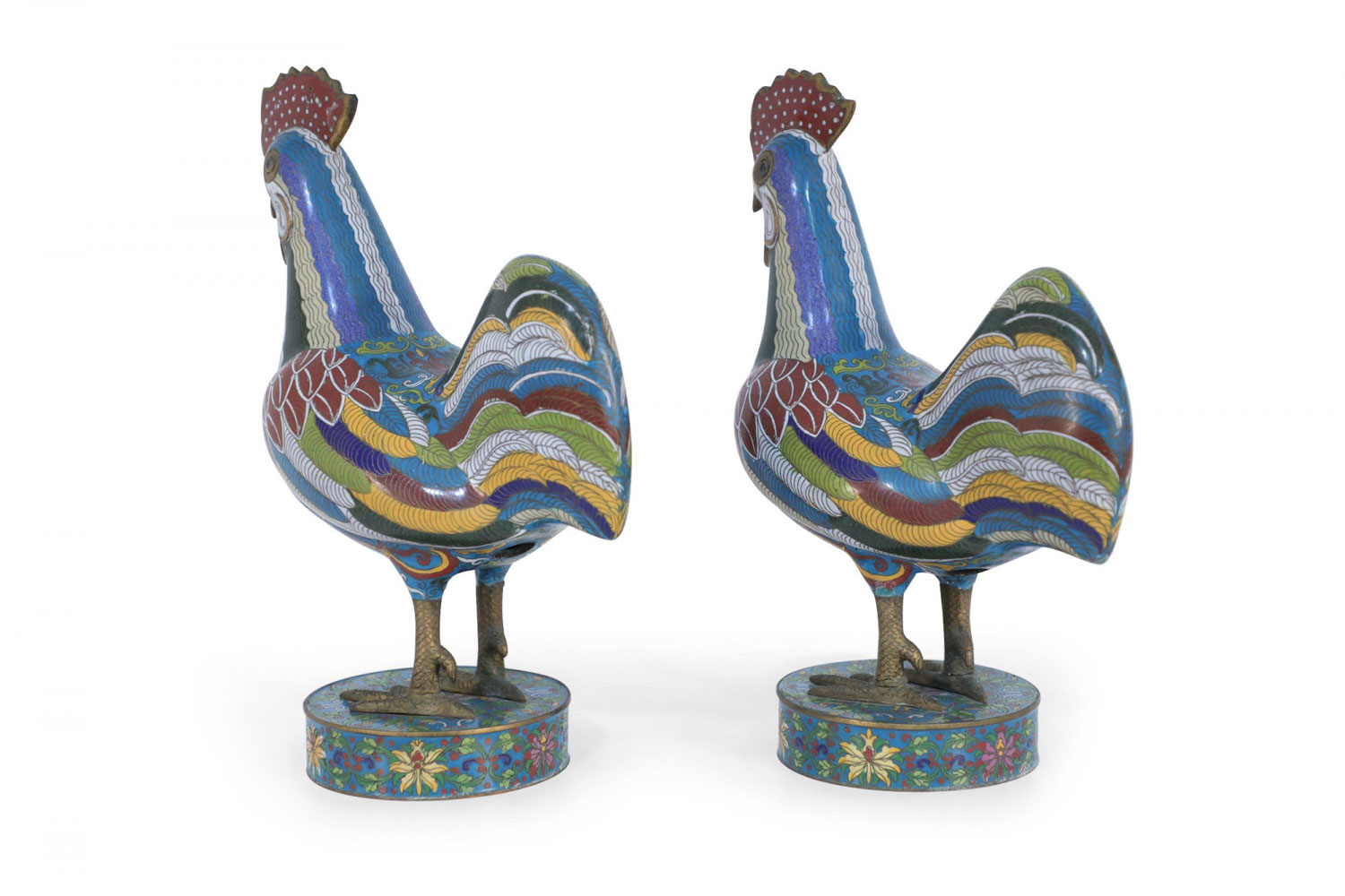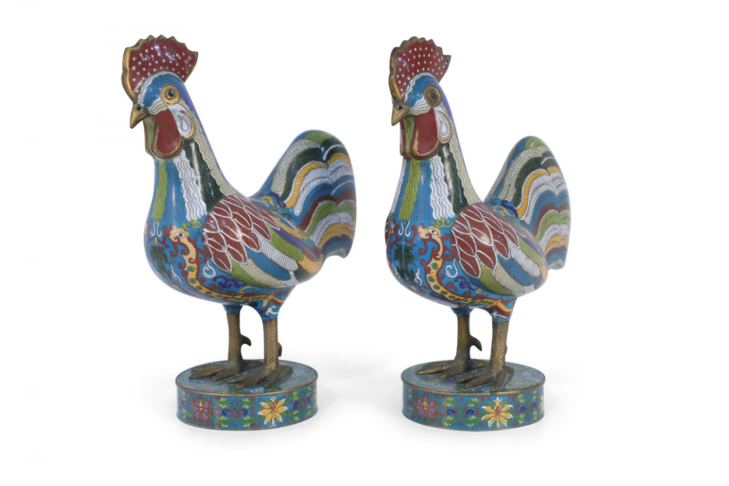 PAIR of Early 20th Century Chinese cloisonne rooster sculptures with red, white, blue, green, and yellow enamels standing on circular cloisonne bases with a floral border design. (PRICED AS PAIR)