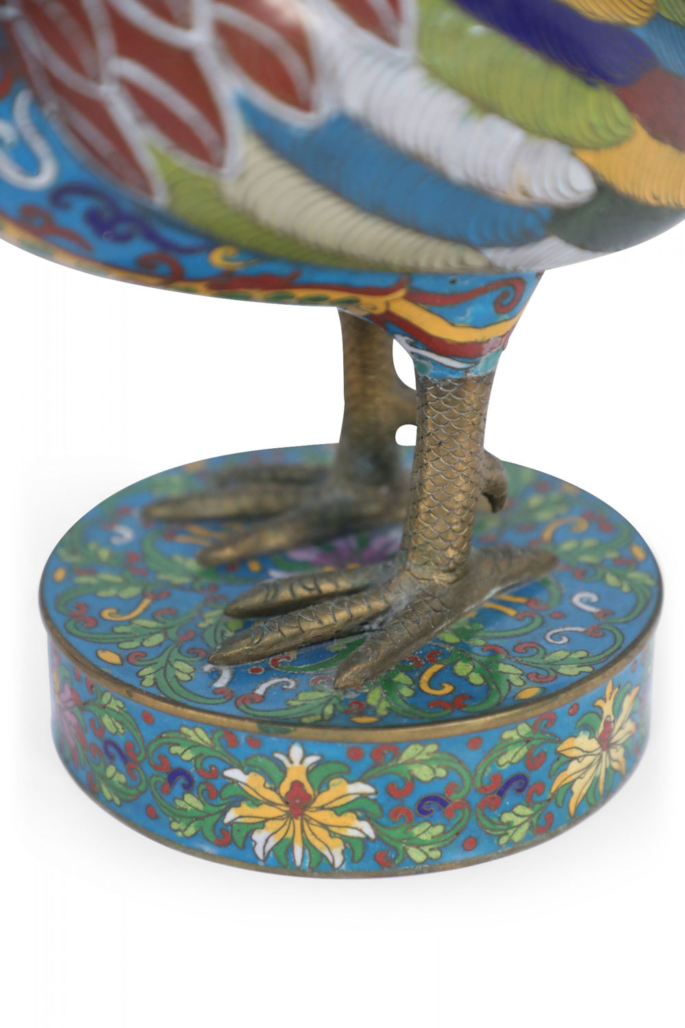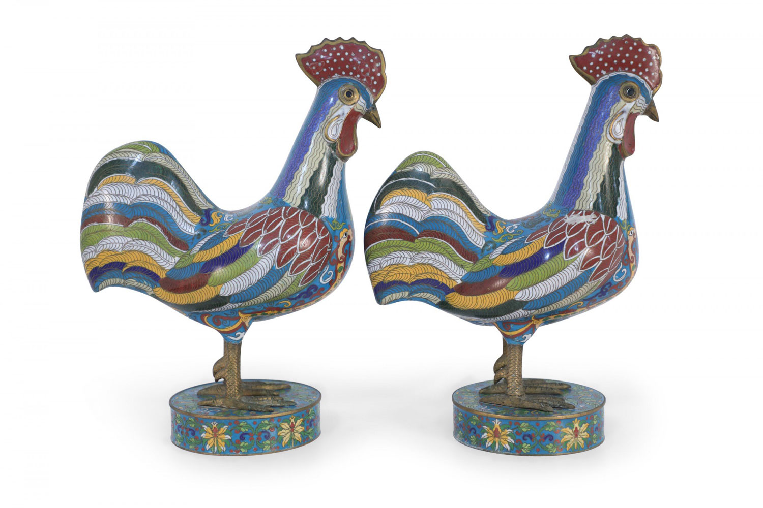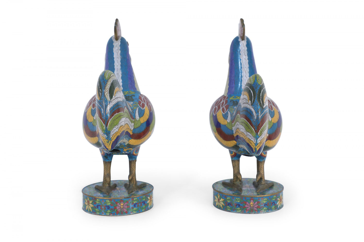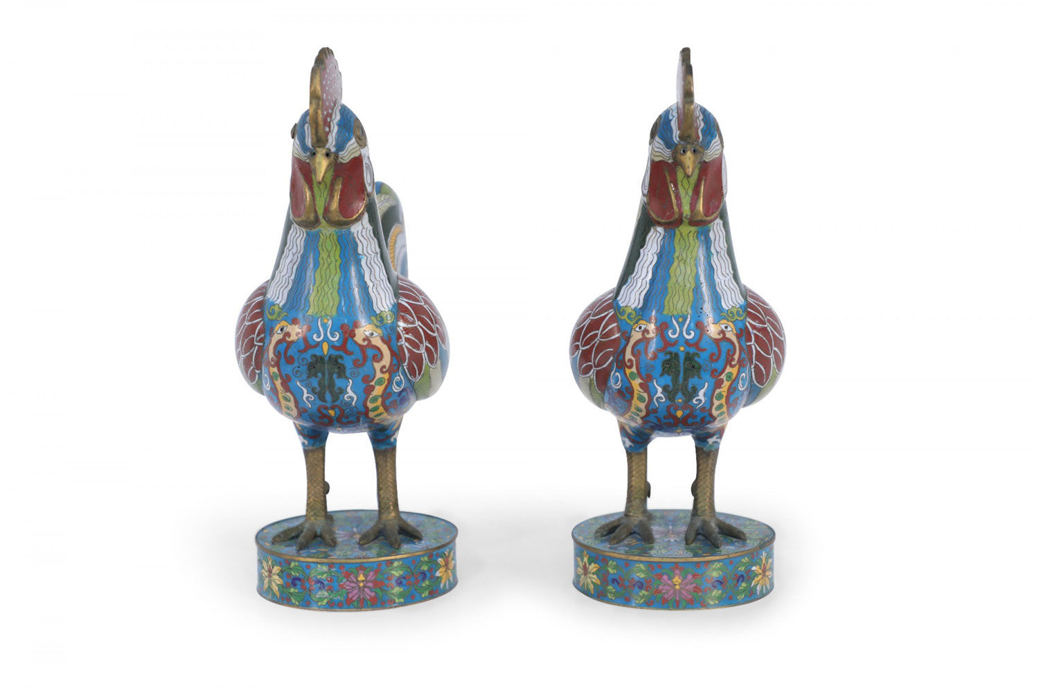 PAIR of Early 20th Century Chinese cloisonne rooster sculptures with red, white, blue, green, and yellow enamels standing on circular cloisonne bases with a floral border design. (PRICED AS PAIR)