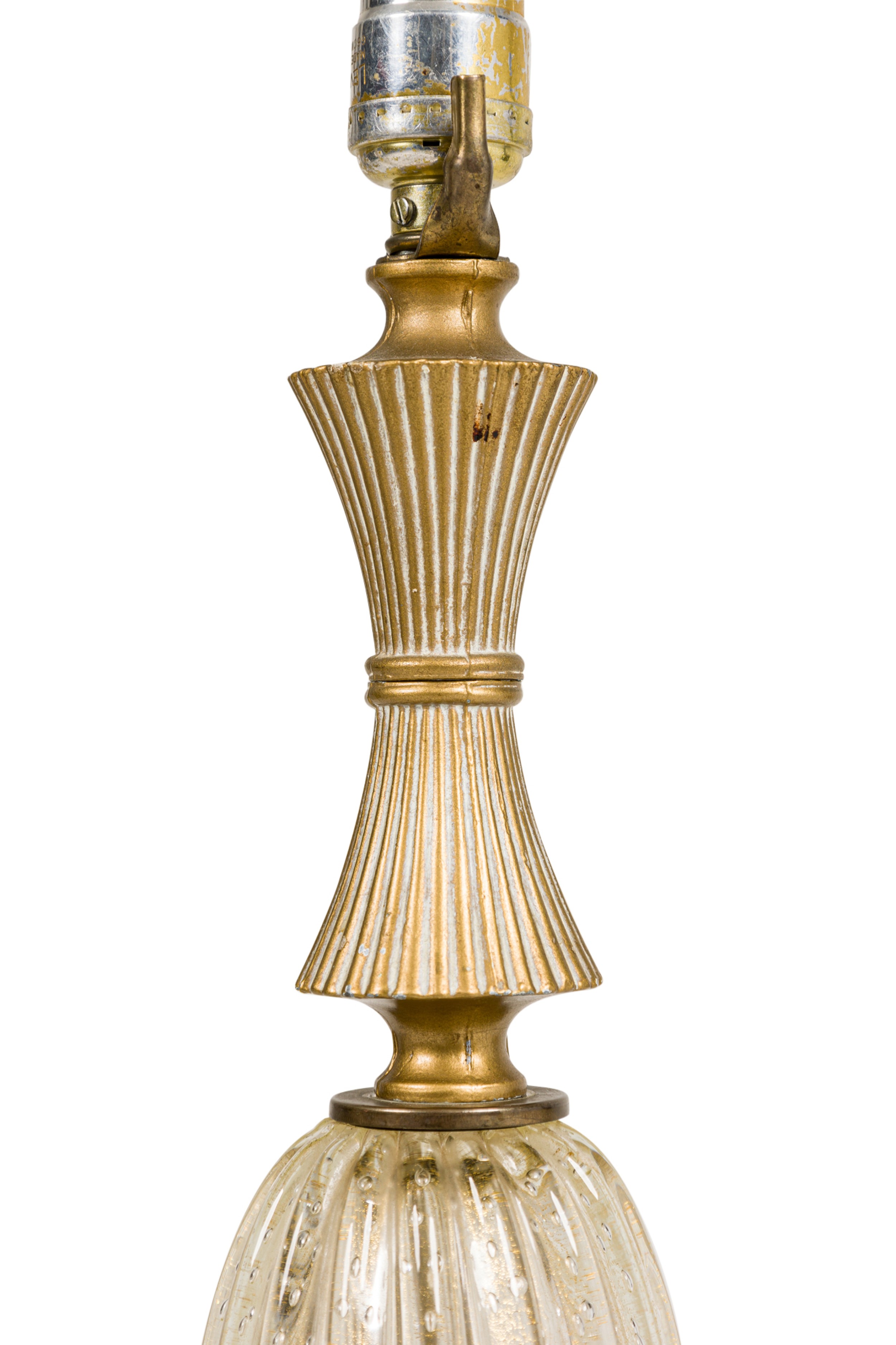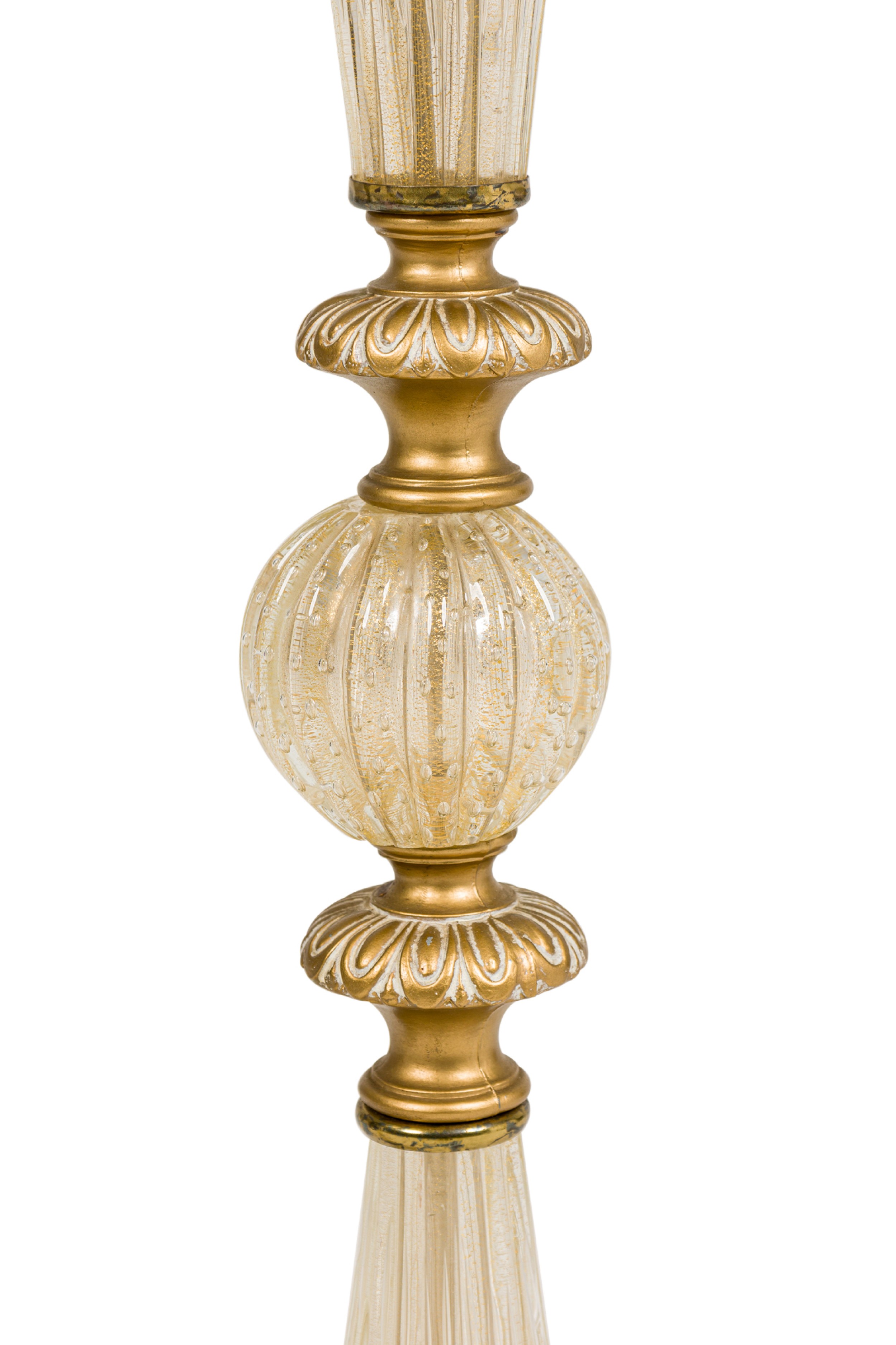 2 Italian Mid-Century standing floor lamps featuring a glass ball in the center with brass finials dividing 2 urn shaped hand blown Murano bubble and gold fleck components (PRICED EACH) (BAROVIER & TOSO).