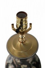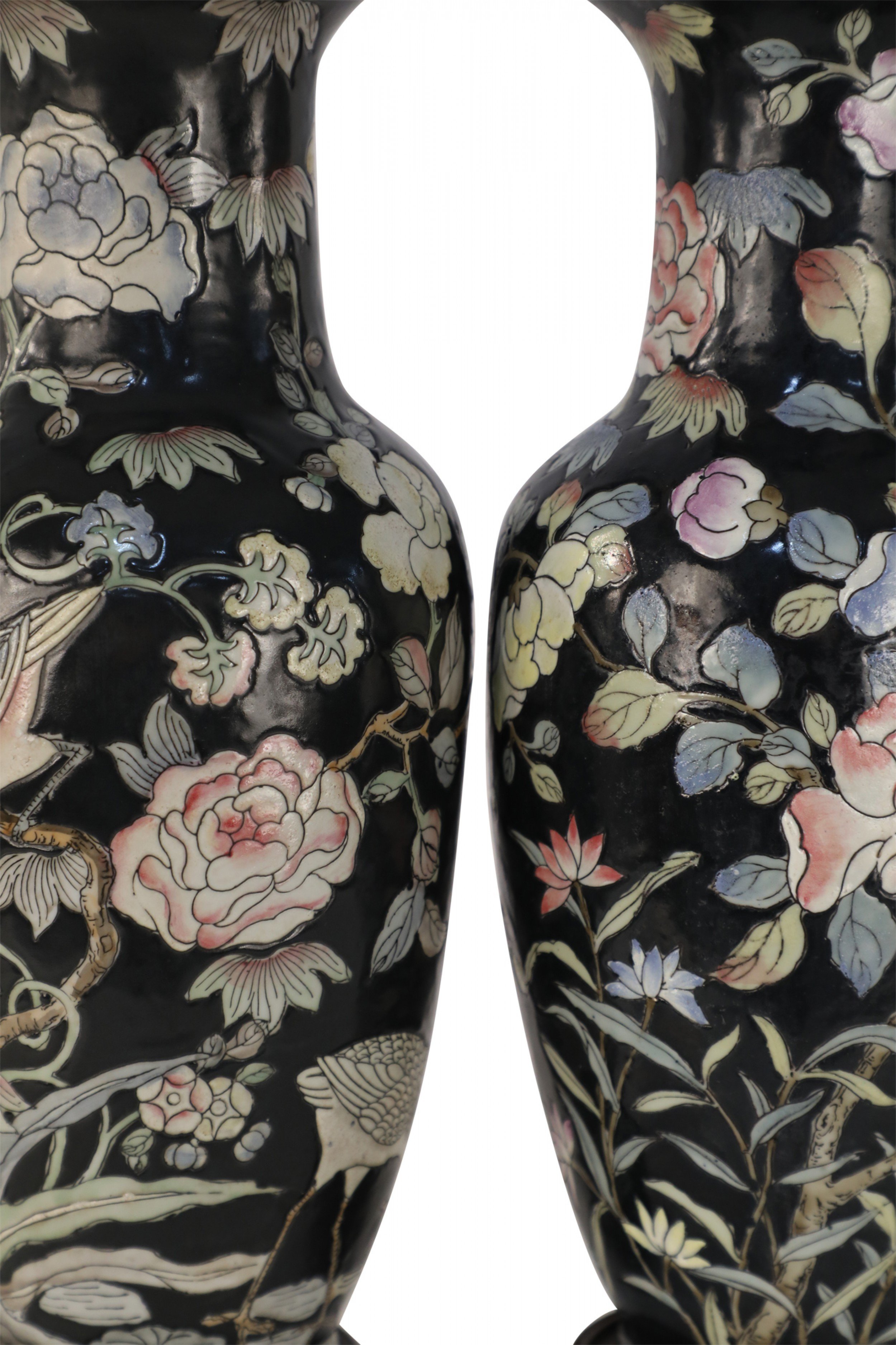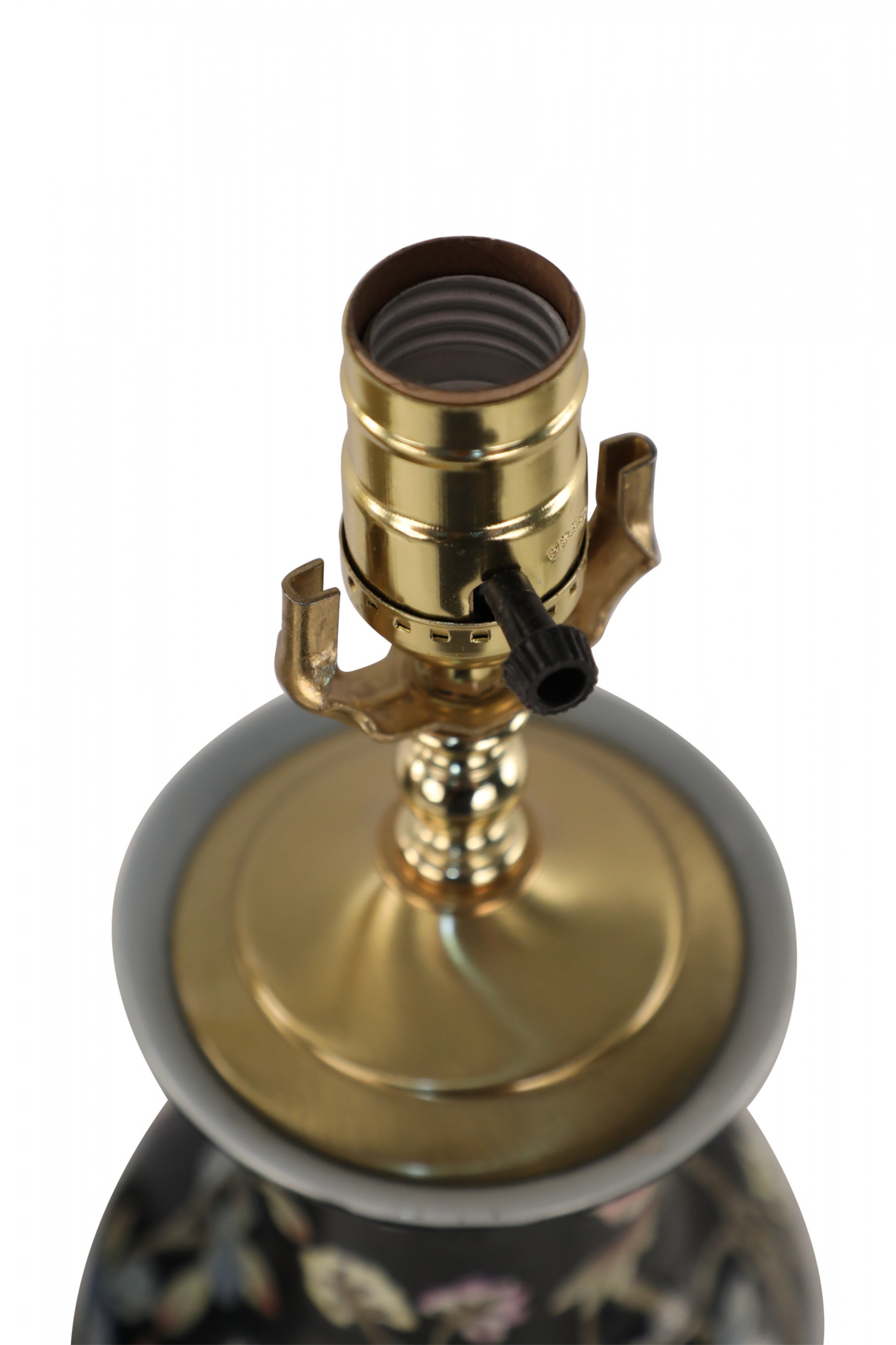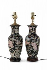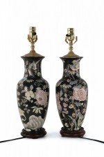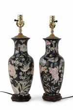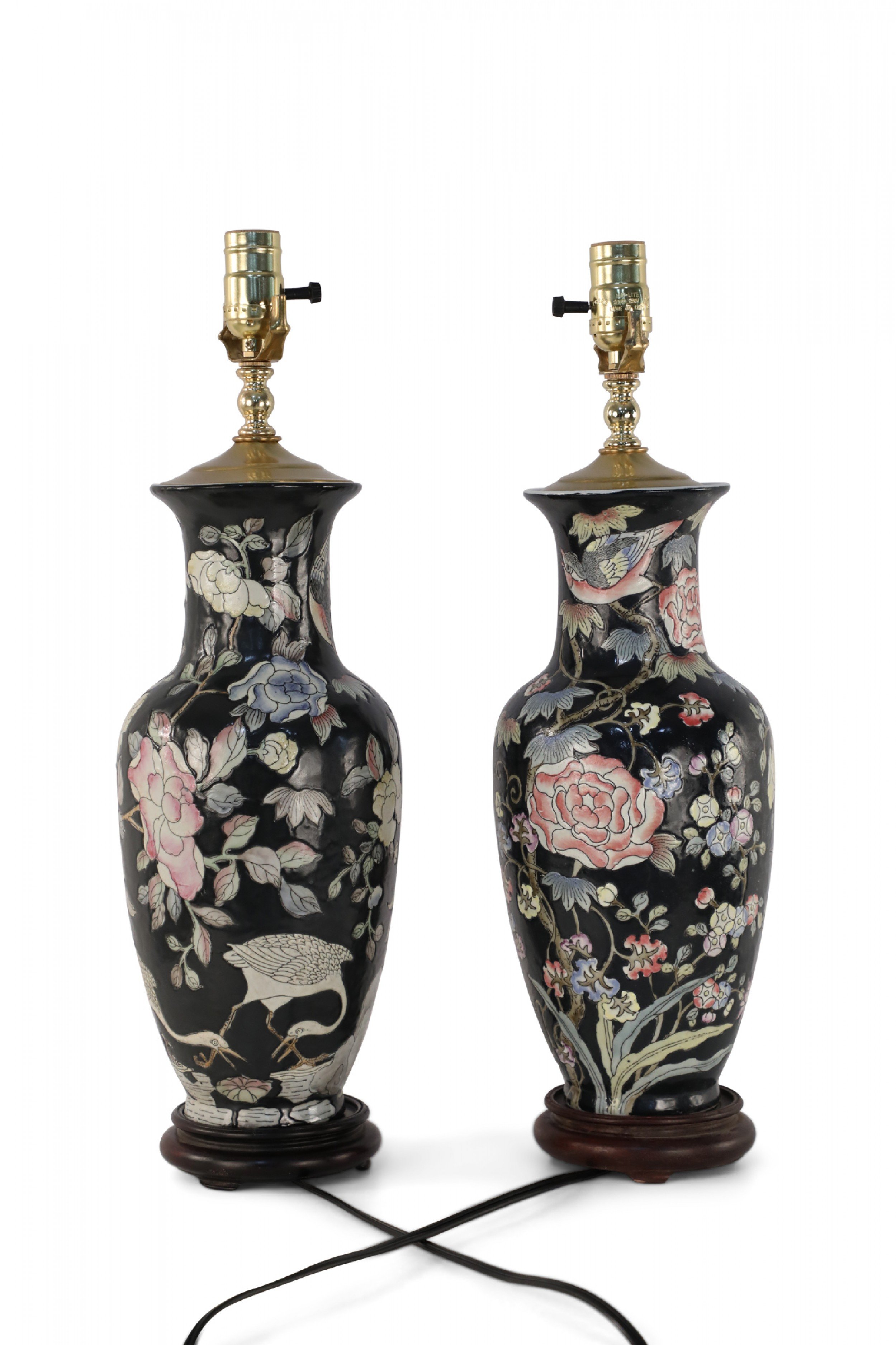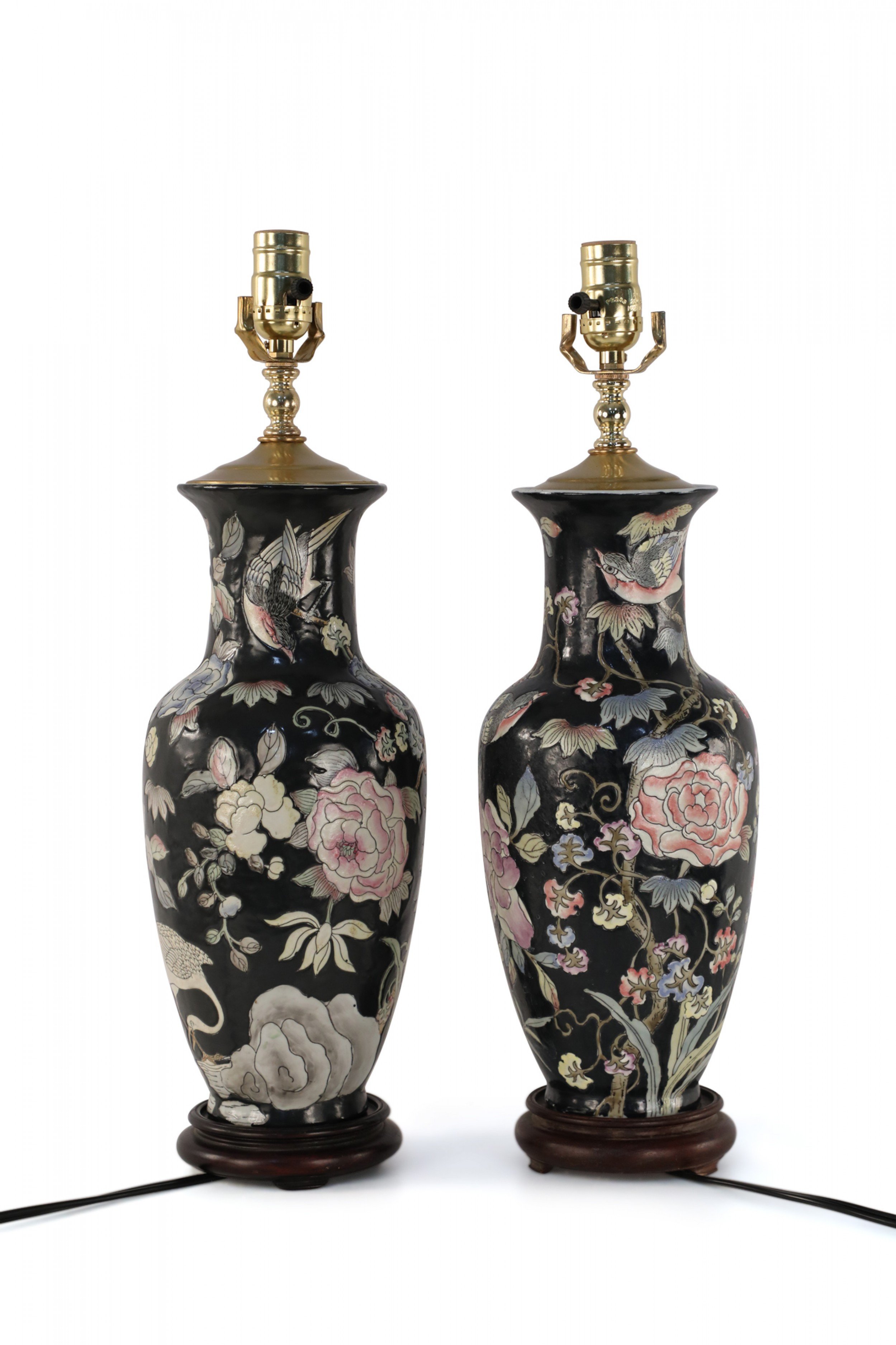 PAIR of Chinese black ceramic table lamps made from baluster-shaped vases decorated with birds amid blooming florals in pinks, yellows, and blues, and wooden bases with brass hardware (PRICED AS PAIR).