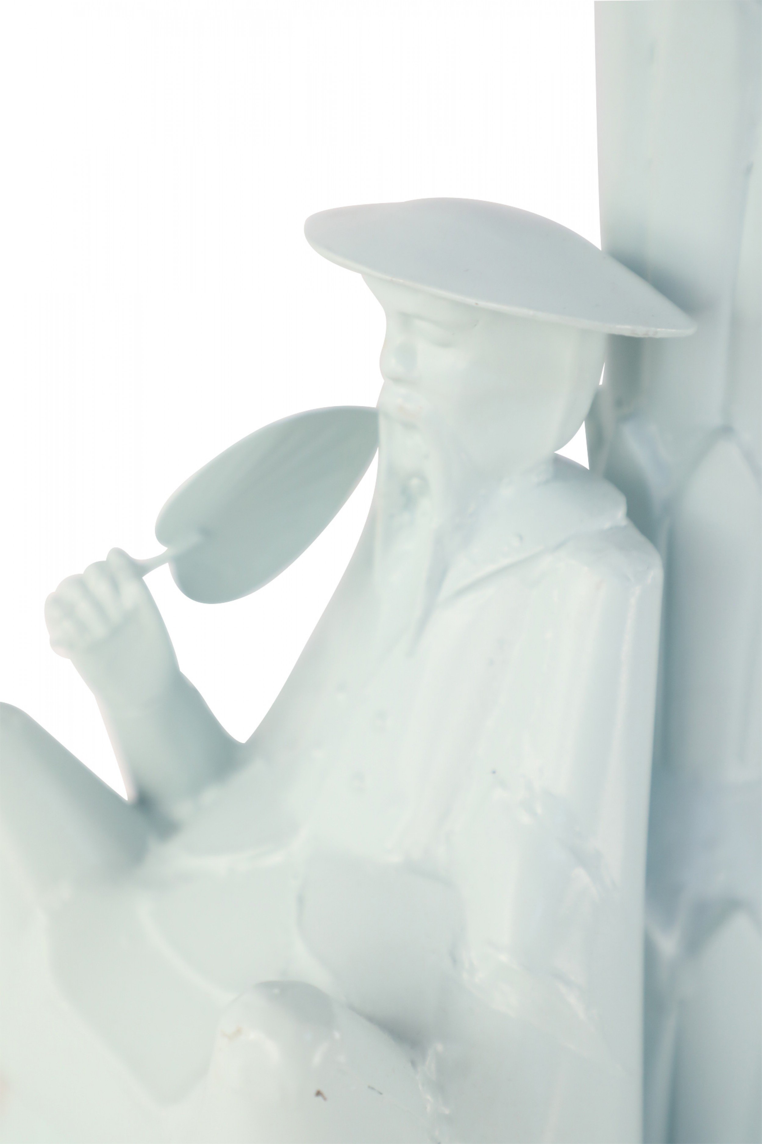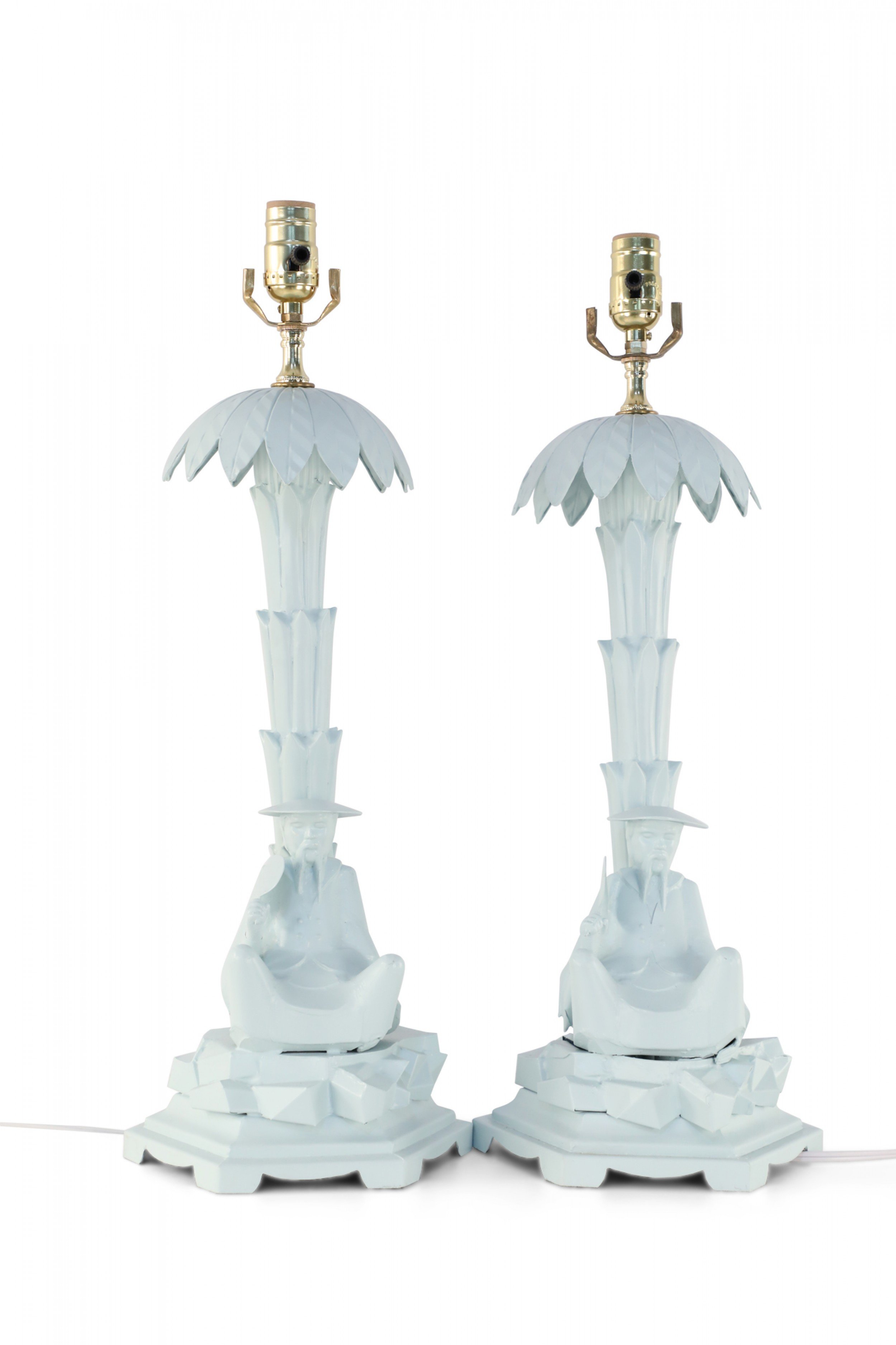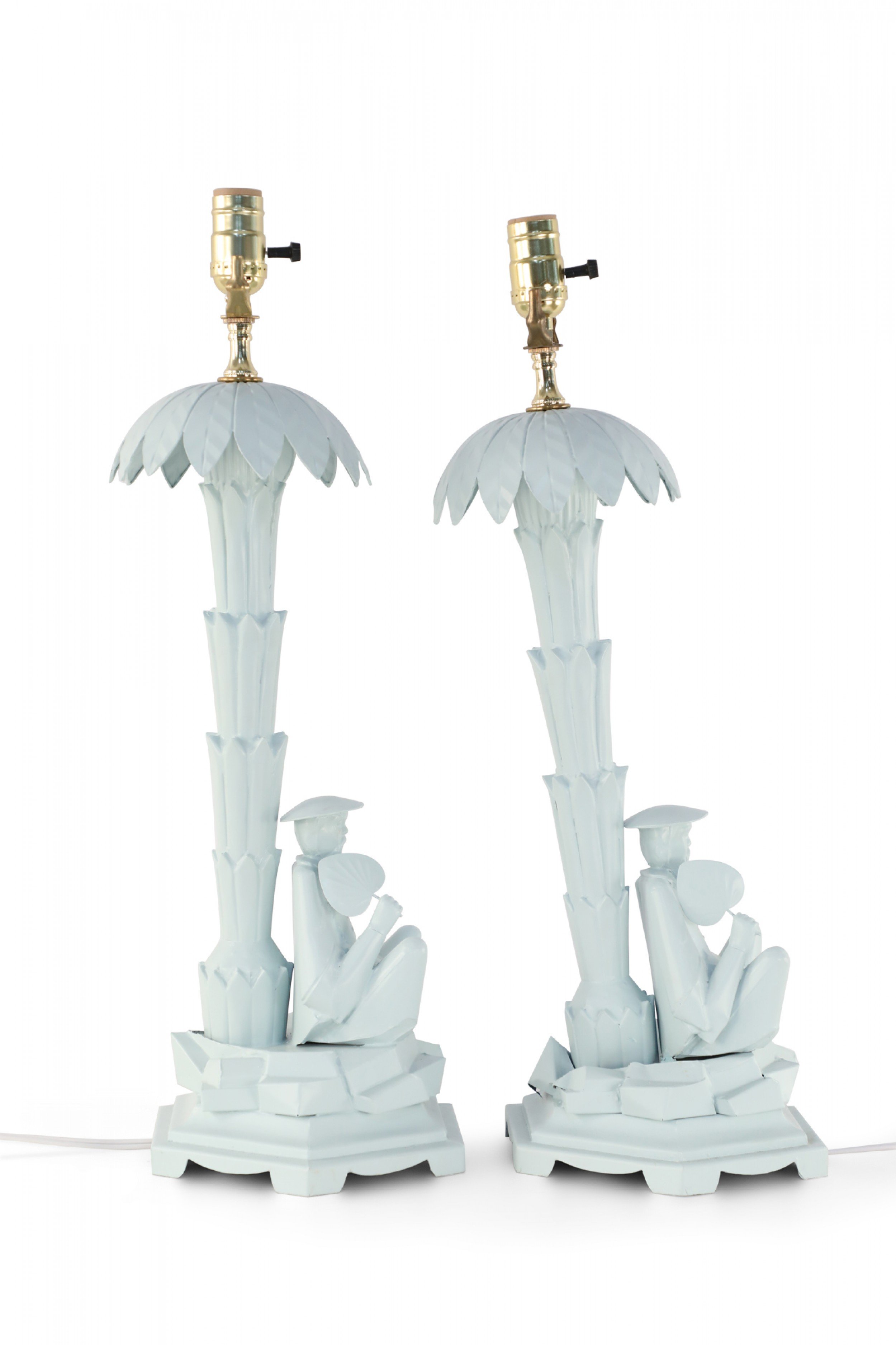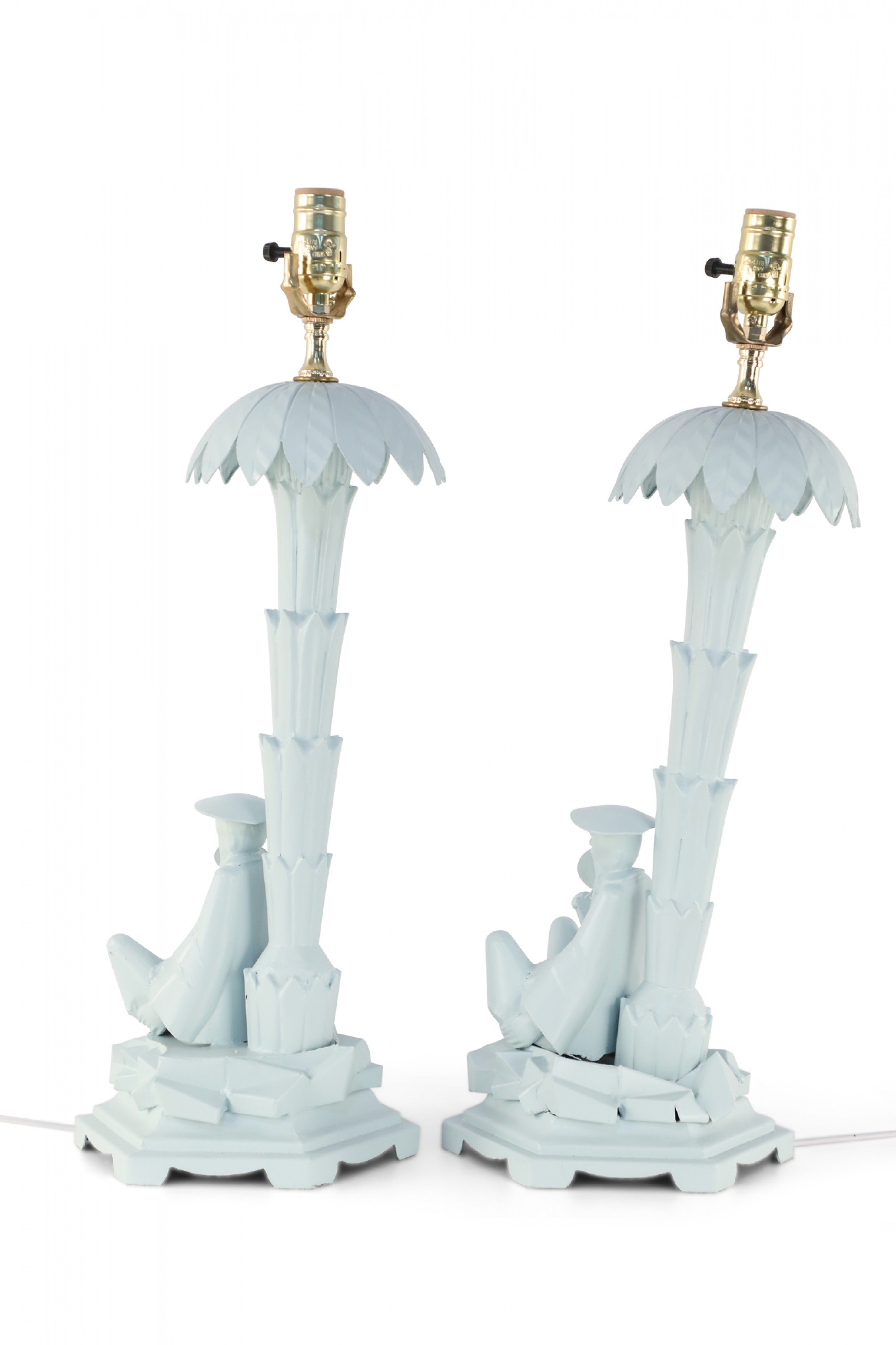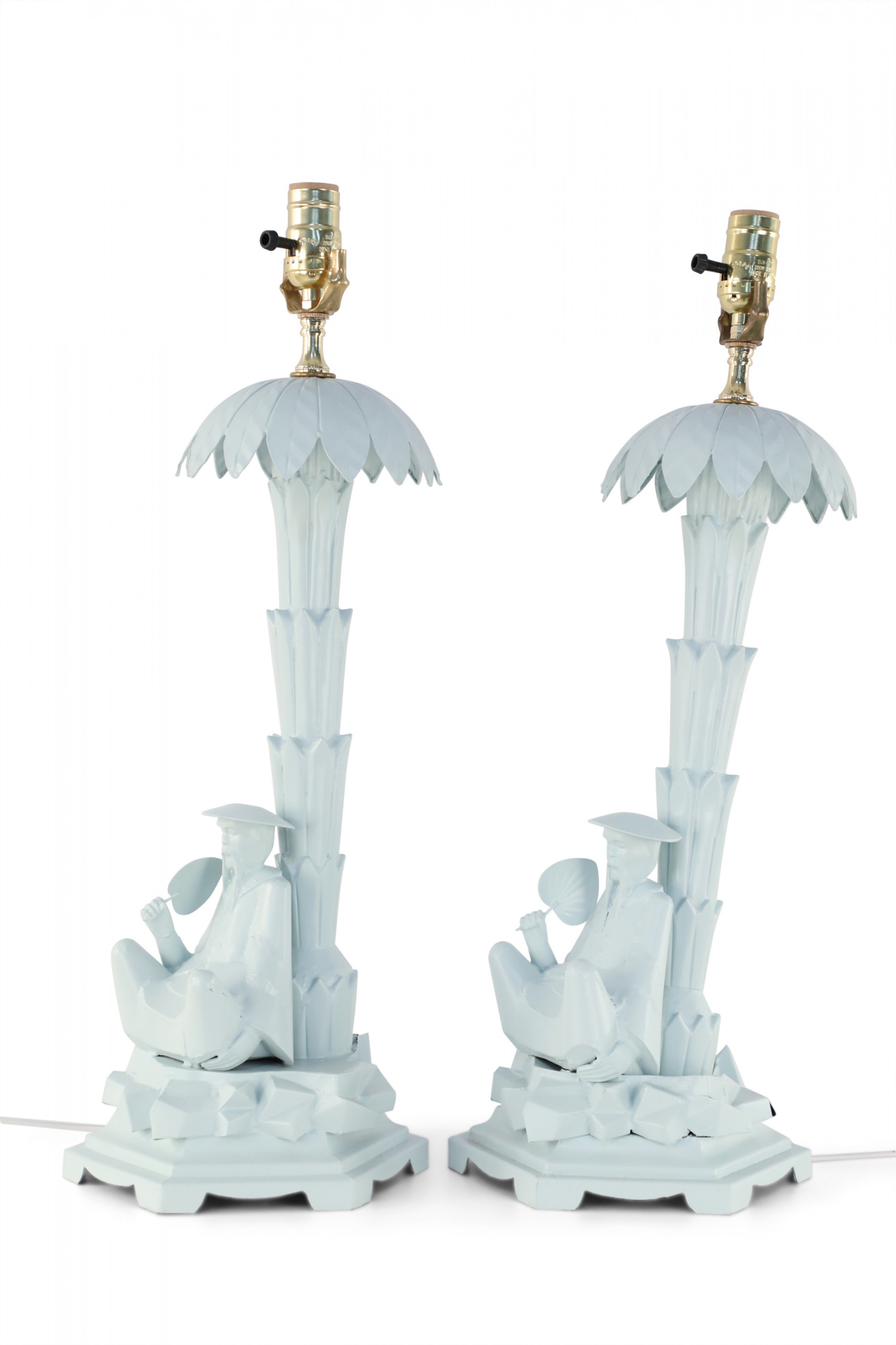 PAIR of Chinese light blue tole table lamps depicting a man holding a fan sitting in the shade of a palm tree. (PRICED AS PAIR)(Companion lamps: NWL2012)