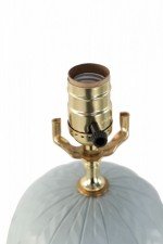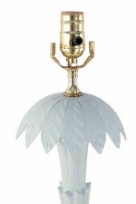 PAIR of Chinese light blue tole table lamps depicting a man holding a fan sitting in the shade of a palm tree. (PRICED AS PAIR)(Companion lamps: NWL2012).