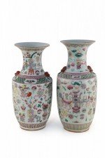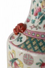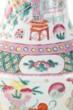 PAIR of Chinese (Early 20th Century) similar off-white lobed porcelain vases with red foo dog side ornaments and a pink and green traditional bogu pattern featuring bonsai, art objects, and calligraphy. (mark on bottom) (PRICED AS PAIR)