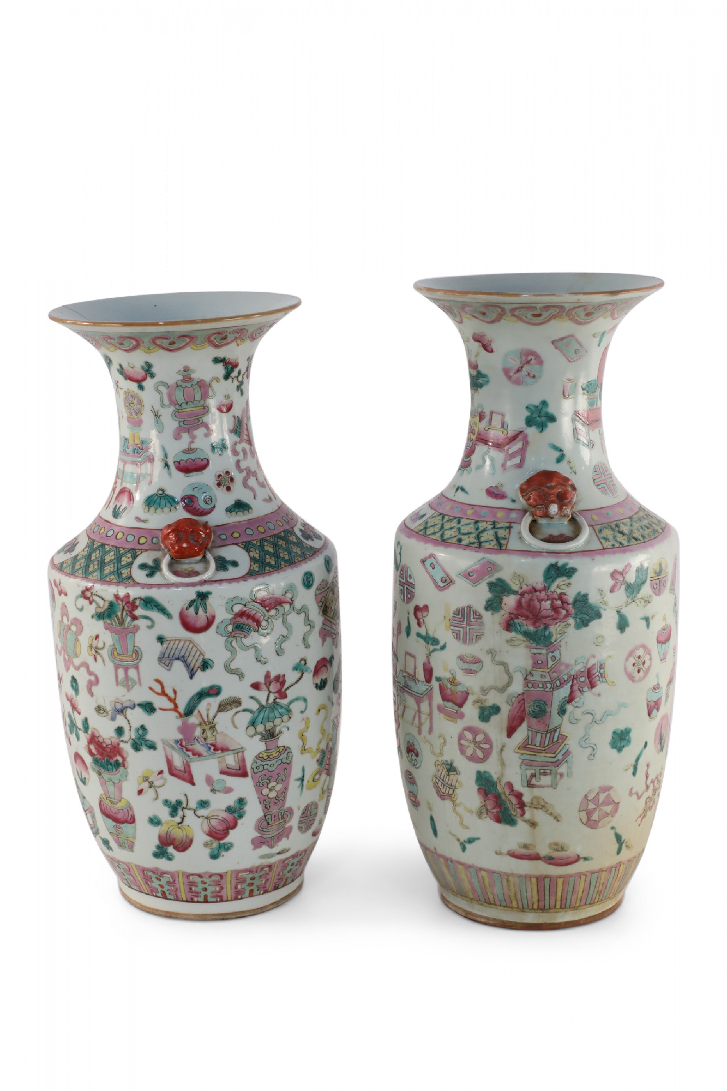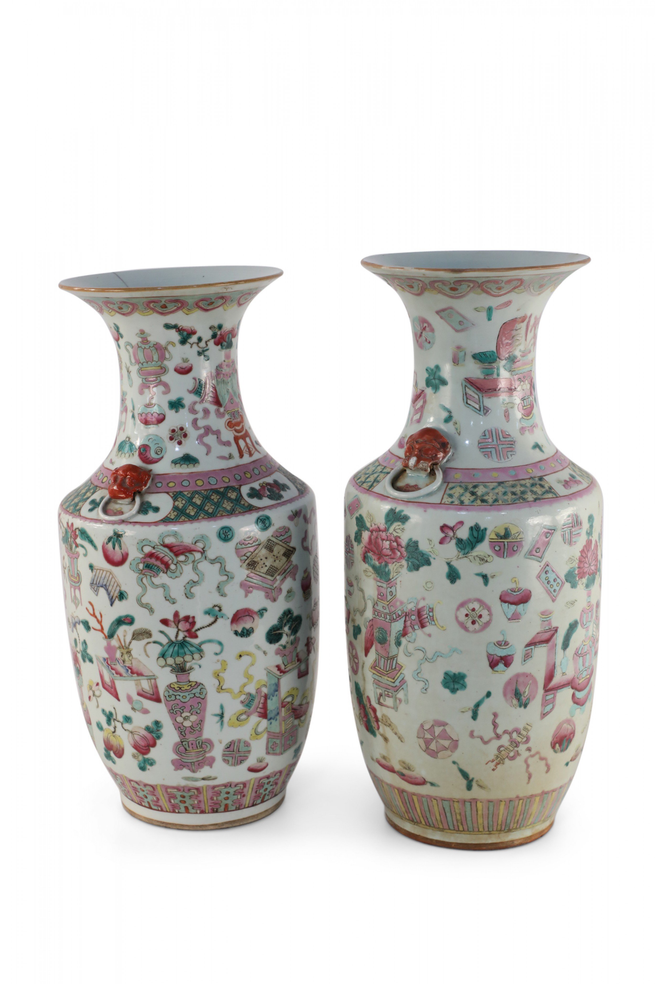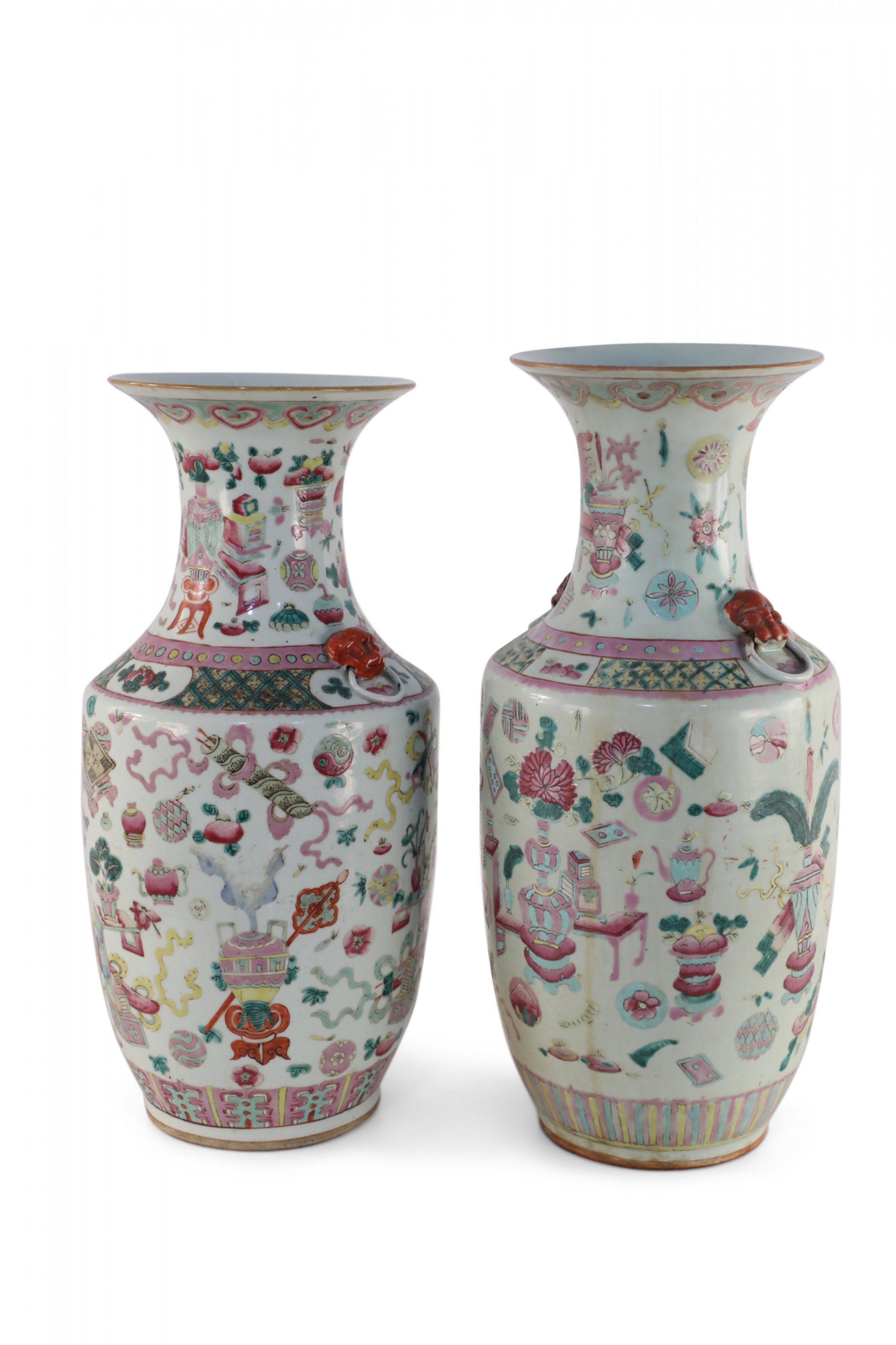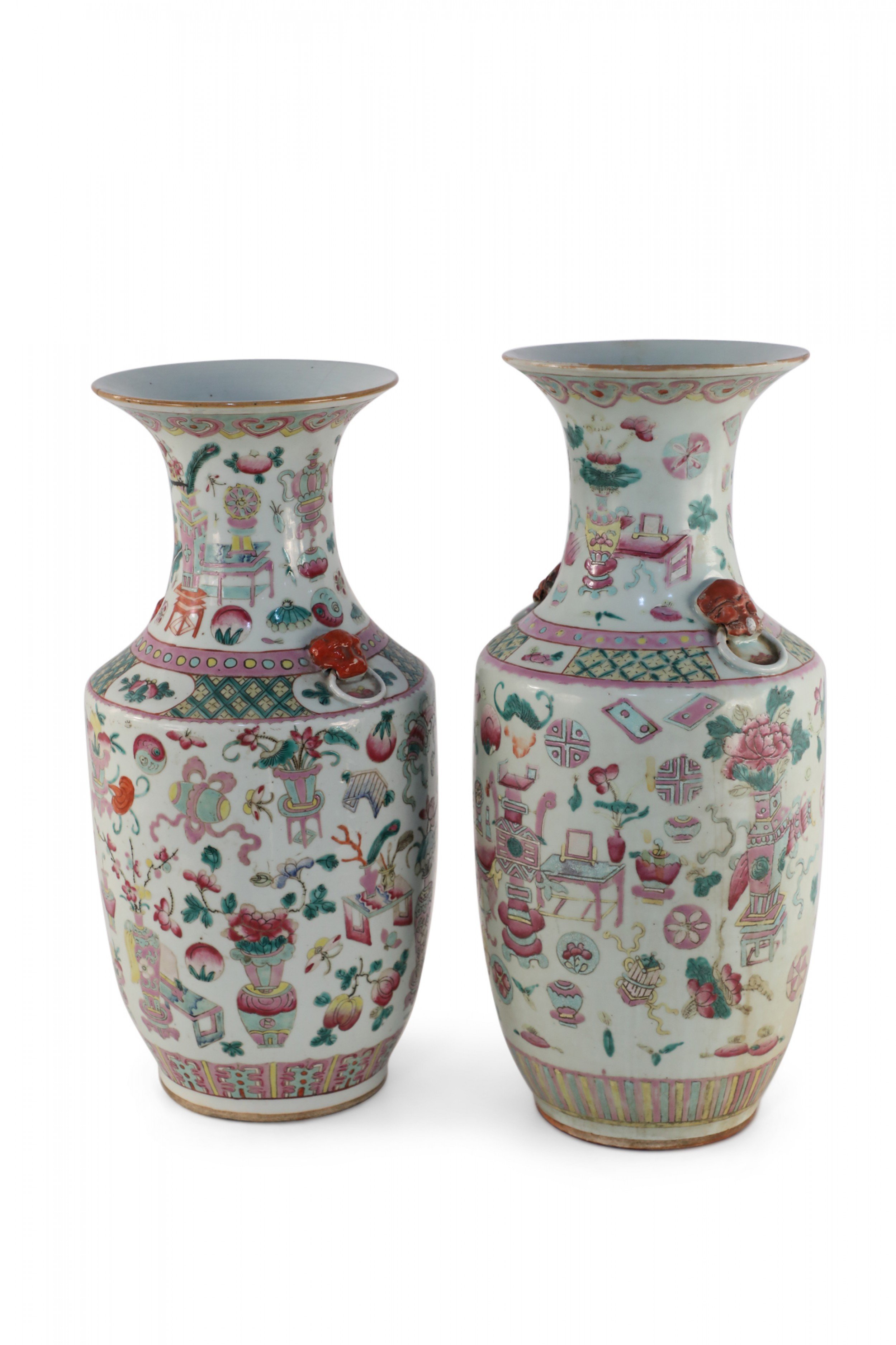 PAIR of Chinese (Early 20th Century) similar off-white lobed porcelain vases with red foo dog side ornaments and a pink and green traditional bogu pattern featuring bonsai, art objects, and calligraphy. (mark on bottom) (PRICED AS PAIR).