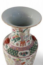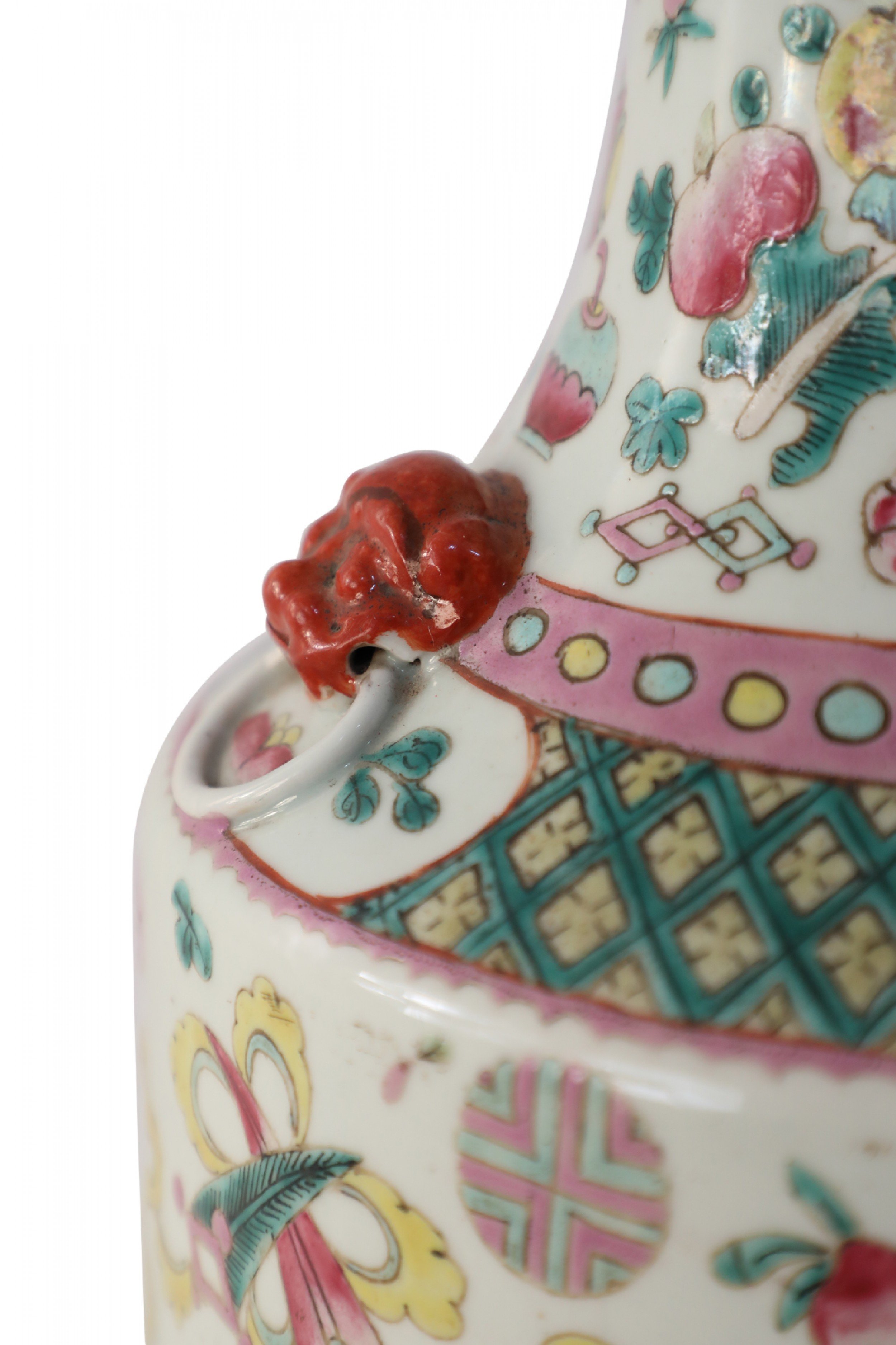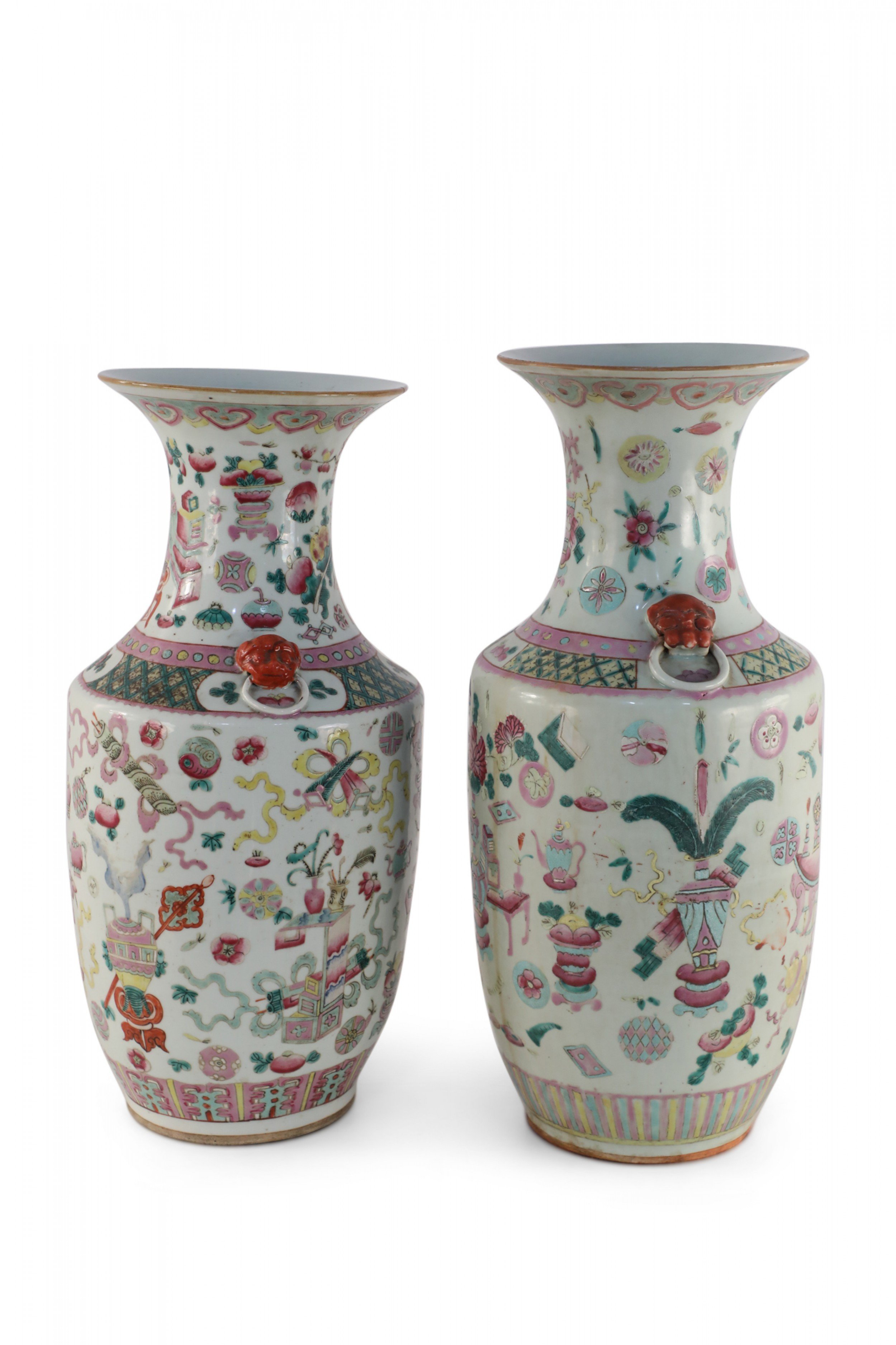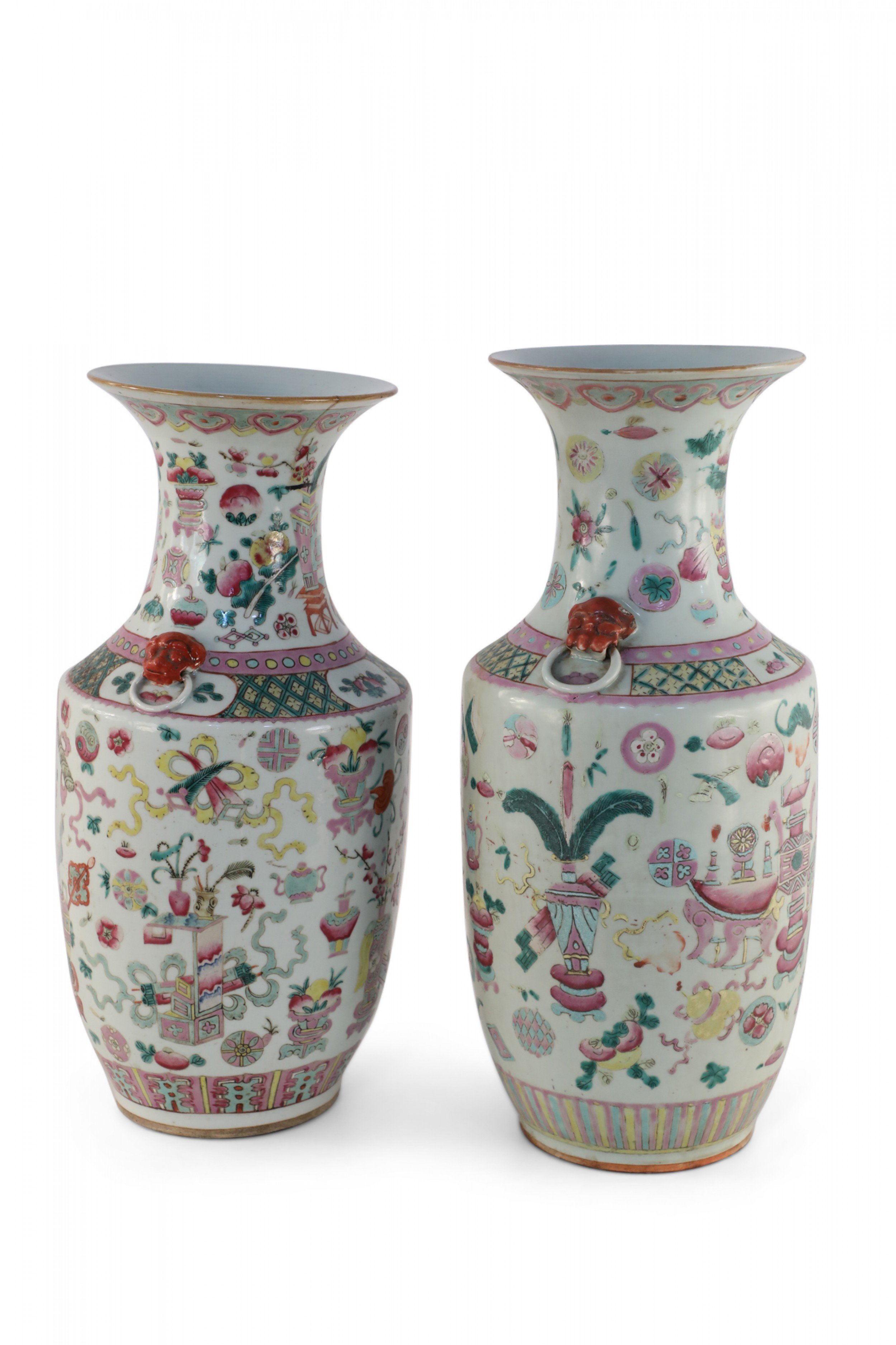 PAIR of Chinese (Early 20th Century) similar off-white lobed porcelain vases with red foo dog side ornaments and a pink and green traditional bogu pattern featuring bonsai, art objects, and calligraphy. (mark on bottom) (PRICED AS PAIR).