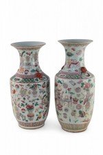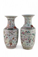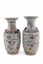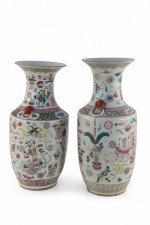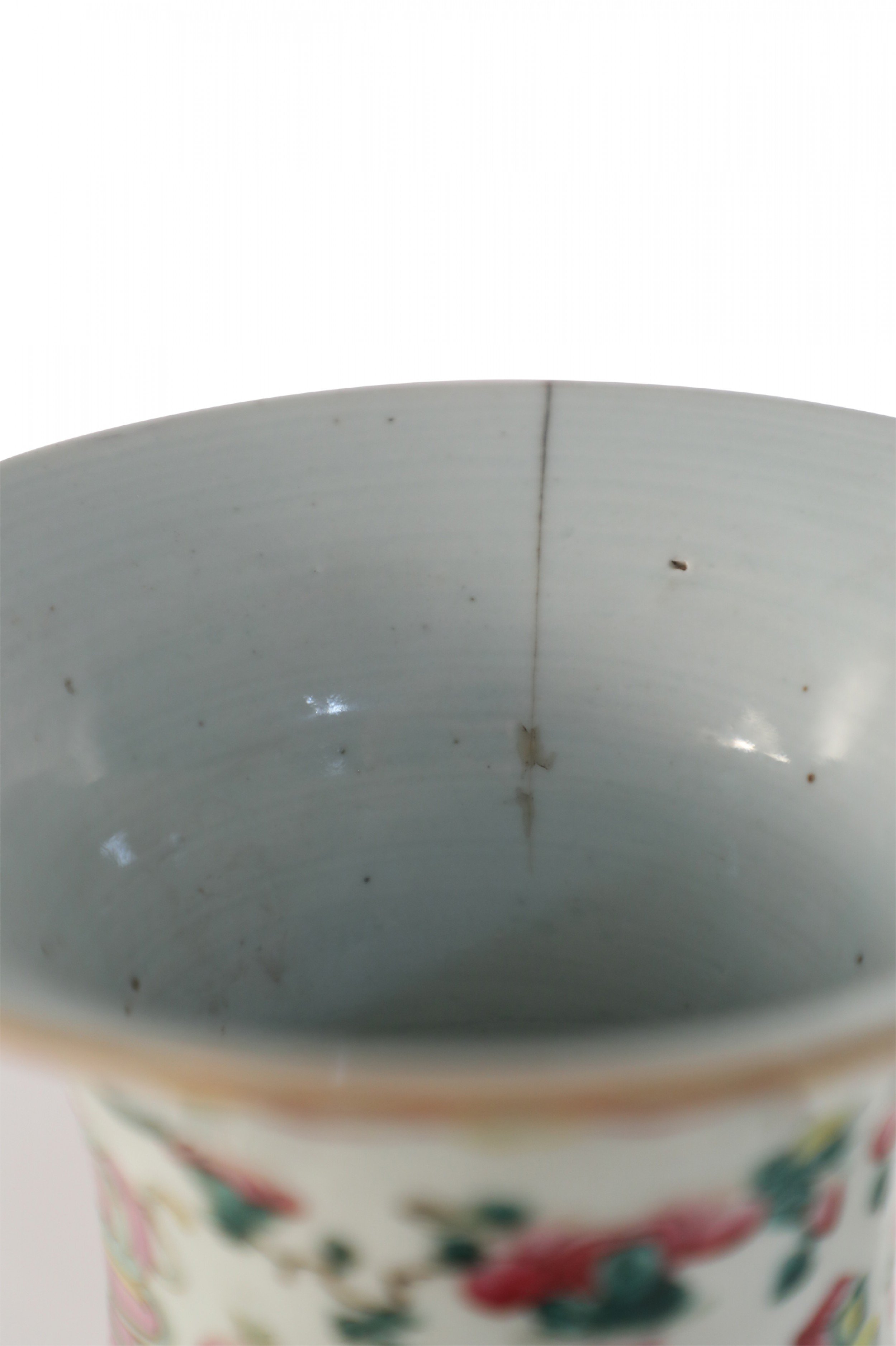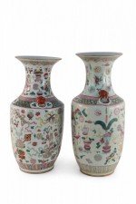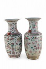 Style: Asian Materials & Techniques: Porcelain Category: Accessories/Décor/Bric-a-Brac Condition: One vase has two hairline cracks at its neck. Slight variations in height and neck opening.